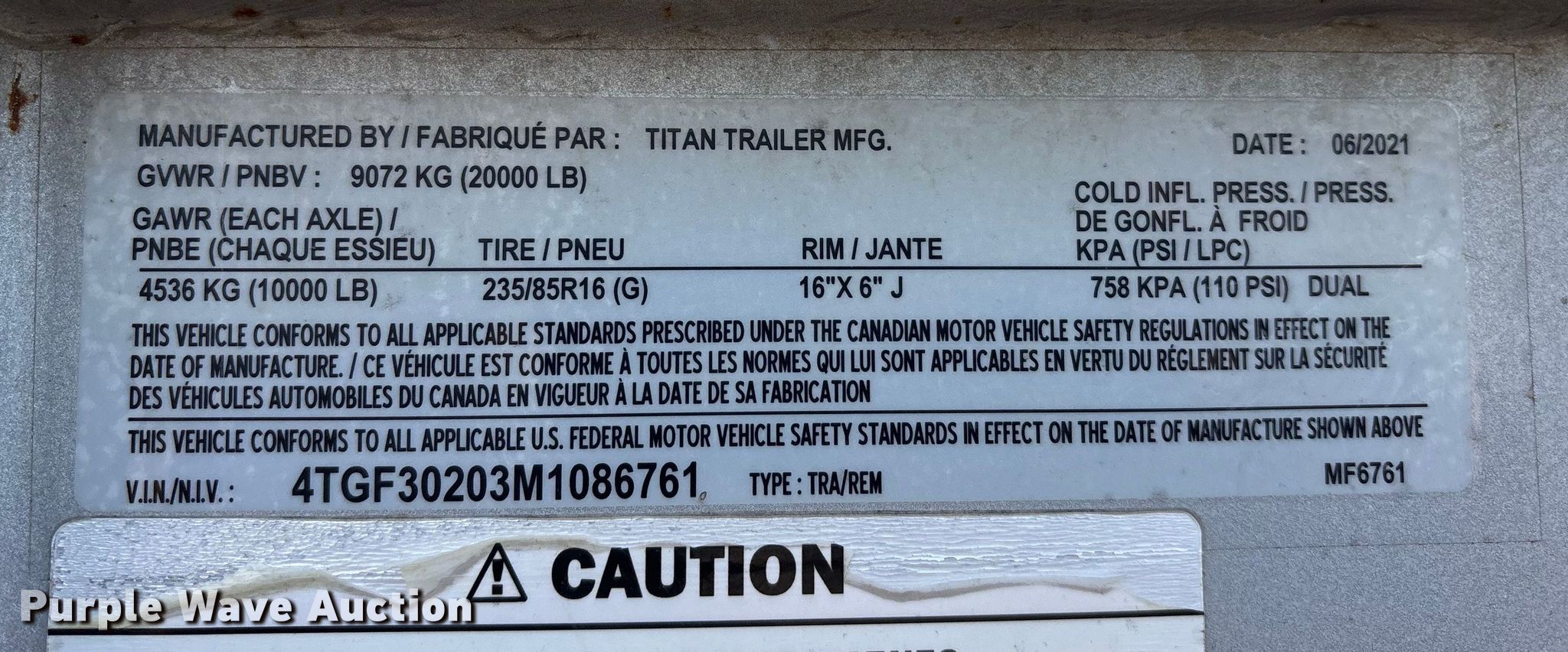 Purple Wave is selling a used Equip. Trailer in Kansas. This item is a 2021 Titan equipment trailer with the following: VIN: 4TGF30203M1086761