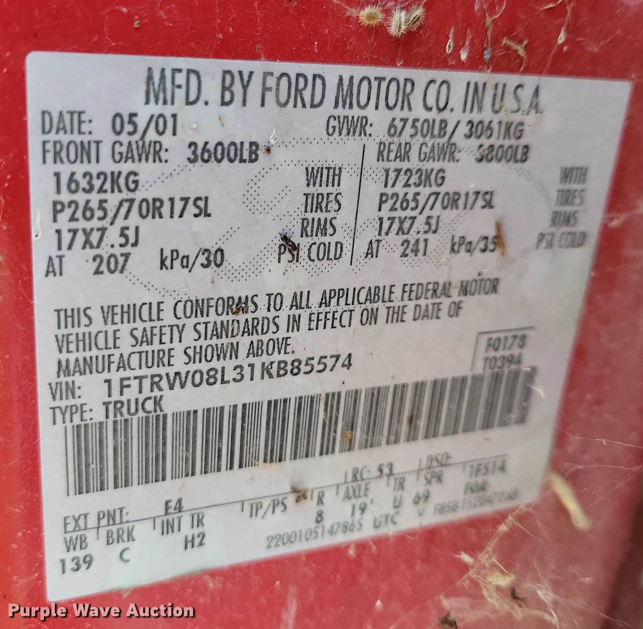 2001 Ford F150 Crew Cab pickup truck. Miles: 230,467 on odometer, VIN: 1FTRW08L31KB85574. Engine Displacement: 5.4L, Cylinders: 8, Fuel type: Gas. Transmission Automatic, Four wheel drive. Interior AC, Heat, Seat: Power driver, Power windows, Power locks, Cruise control. Tires Size: LT265/70R17. Notes Brakes issues, soft , Emissions system issues, Fuel issues, old fuel, Dash warning indicator: Brake, Jump start required during on-site data collection. Iowa title. Title distribution may be delayed up to 14 days from verification of funds. Truro, IA 50257