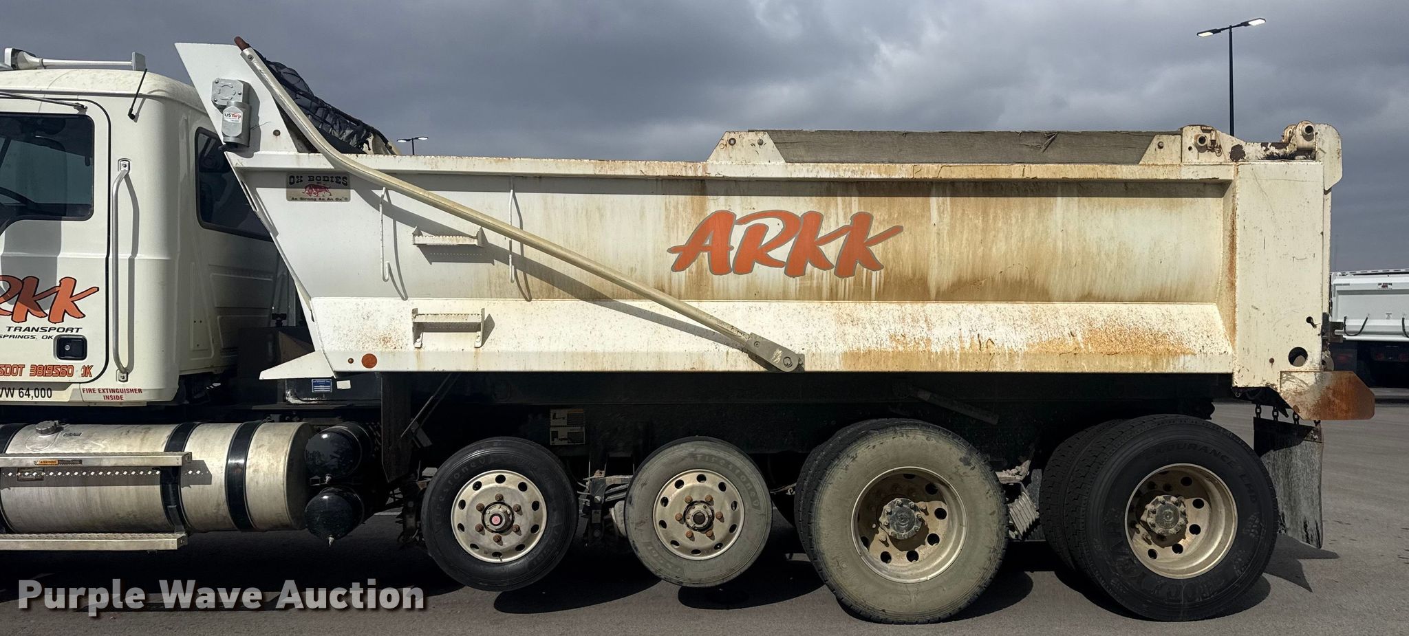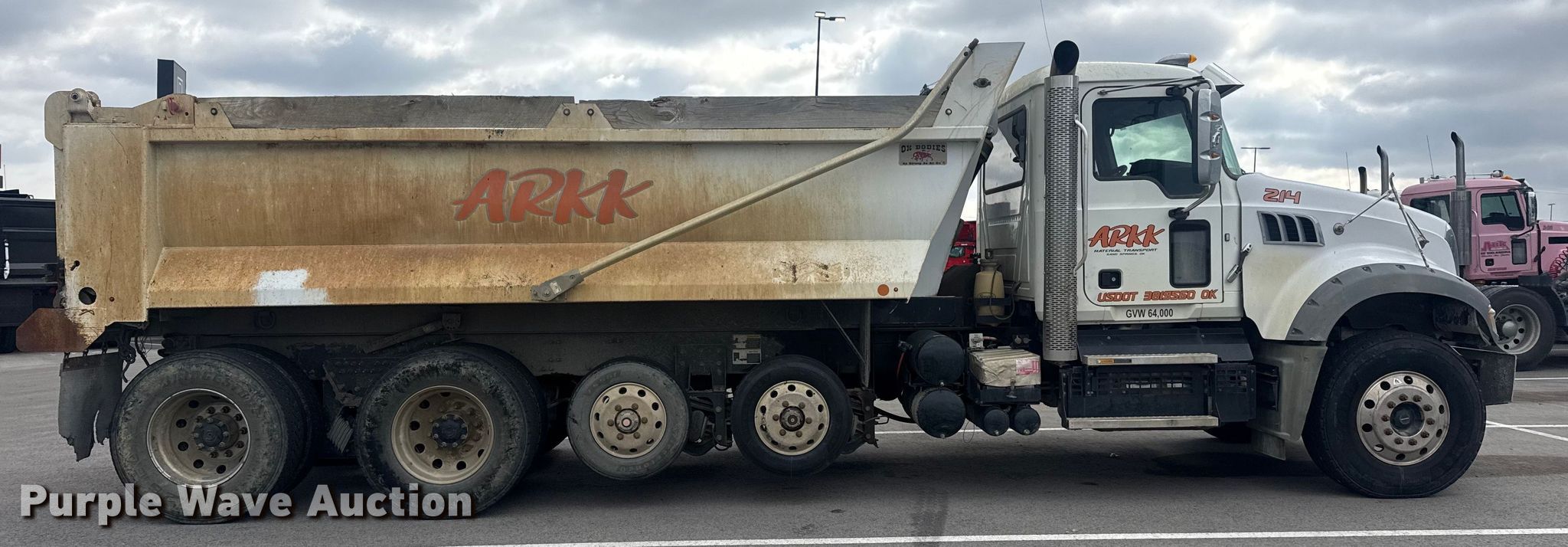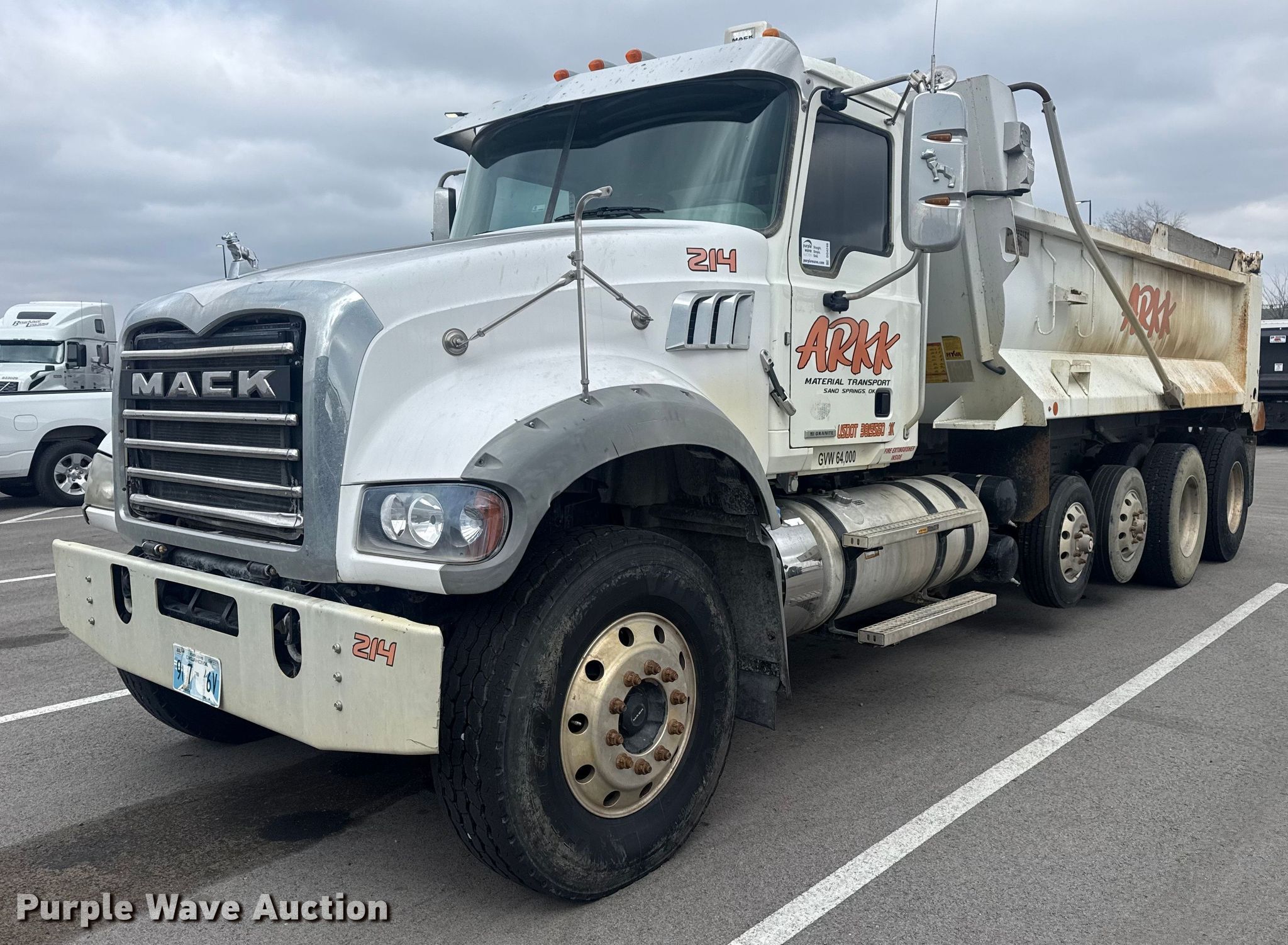 2019 Mack Granite dump truck. Miles: 227,912 on odometer, VIN: 1M2GR3GC3KM008994. Engine Mack MP8, Displacement: 13.0L, Fuel type: Diesel. Transmission Automated manual. Chassis Axles: 4, Pusher axle, Differential lock: Inter-axle, Suspension: Spring over walking beam, Brakes: Air, PTO, GVWR: 58,000 lbs FAWR: 18,000 lbs, IAWR: 20,000 lbs, RAWR: 20,000 lbs. Interior AC, Heat, Heated mirrors, Power windows, Cruise control. Features Bed Dump bed, Ox Bodies, Inc. 18FT 15/16YD, Serial: S18141221009719TXT, Length: 18', Width: 96", Side height: 42", Side board height: 8", Bed type: Steel, Barrel, Roll tarp, Ram: Single, End gate: Air operated. Tires Front: 315/80R22.5, Rear: 11R22.5, Lift axle: 215/75R17.5. Notes Dash warning indicator: ABS, Traction control, Check engine or aftertreatment, Windshield chipped or cracked. Oklahoma title. Title has a lien that will be released following the close of the auction. ARKK Trucking, Inc.. Tulsa, OK 74107