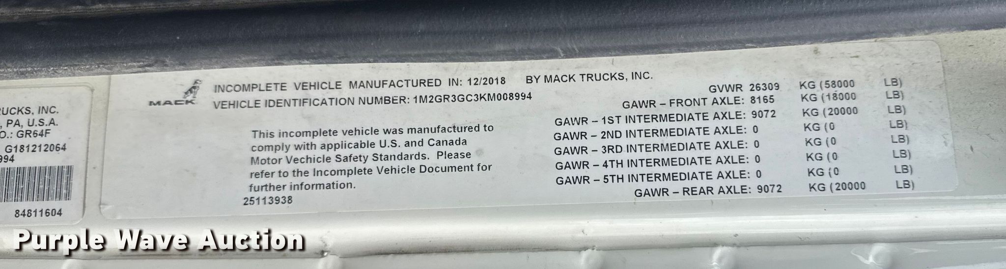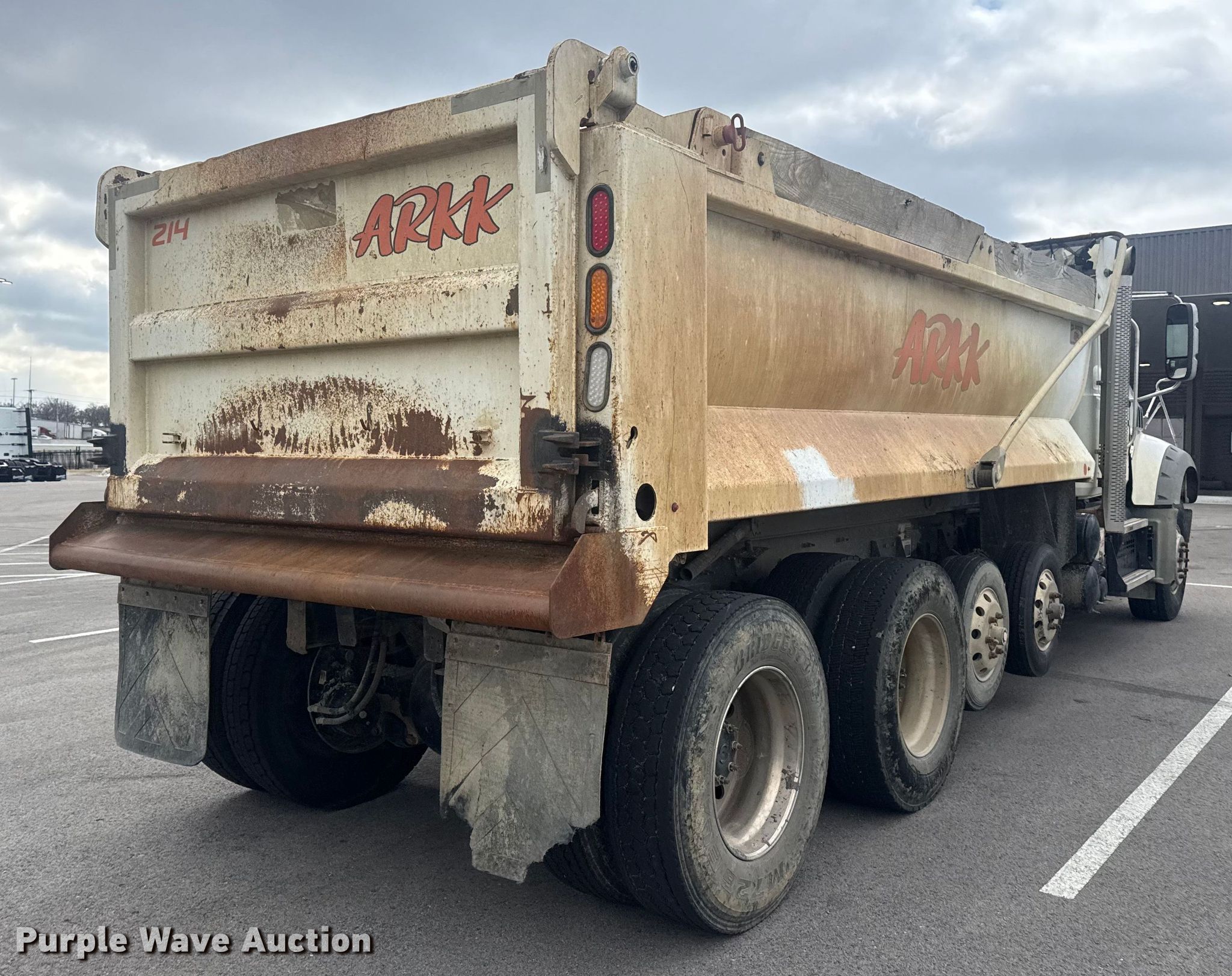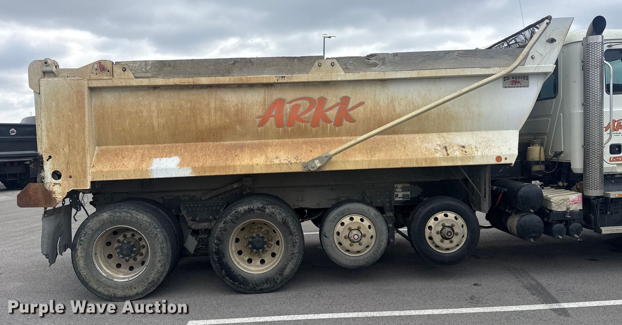 2019 Mack Granite dump truck. Miles: 227,912 on odometer, VIN: 1M2GR3GC3KM008994. Engine Mack MP8, Displacement: 13.0L, Fuel type: Diesel. Transmission Automated manual. Chassis Axles: 4, Pusher axle, Differential lock: Inter-axle, Suspension: Spring over walking beam, Brakes: Air, PTO, GVWR: 58,000 lbs FAWR: 18,000 lbs, IAWR: 20,000 lbs, RAWR: 20,000 lbs. Interior AC, Heat, Heated mirrors, Power windows, Cruise control. Features Bed Dump bed, Ox Bodies, Inc. 18FT 15/16YD, Serial: S18141221009719TXT, Length: 18', Width: 96", Side height: 42", Side board height: 8", Bed type: Steel, Barrel, Roll tarp, Ram: Single, End gate: Air operated. Tires Front: 315/80R22.5, Rear: 11R22.5, Lift axle: 215/75R17.5. Notes Dash warning indicator: ABS, Traction control, Check engine or aftertreatment, Windshield chipped or cracked. Oklahoma title. Title has a lien that will be released following the close of the auction. ARKK Trucking, Inc.. Tulsa, OK 74107