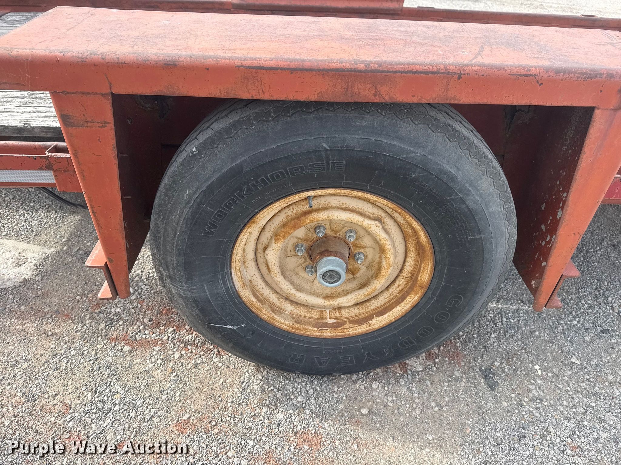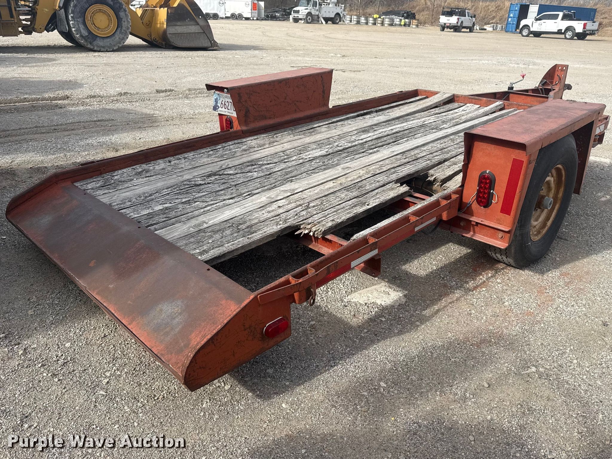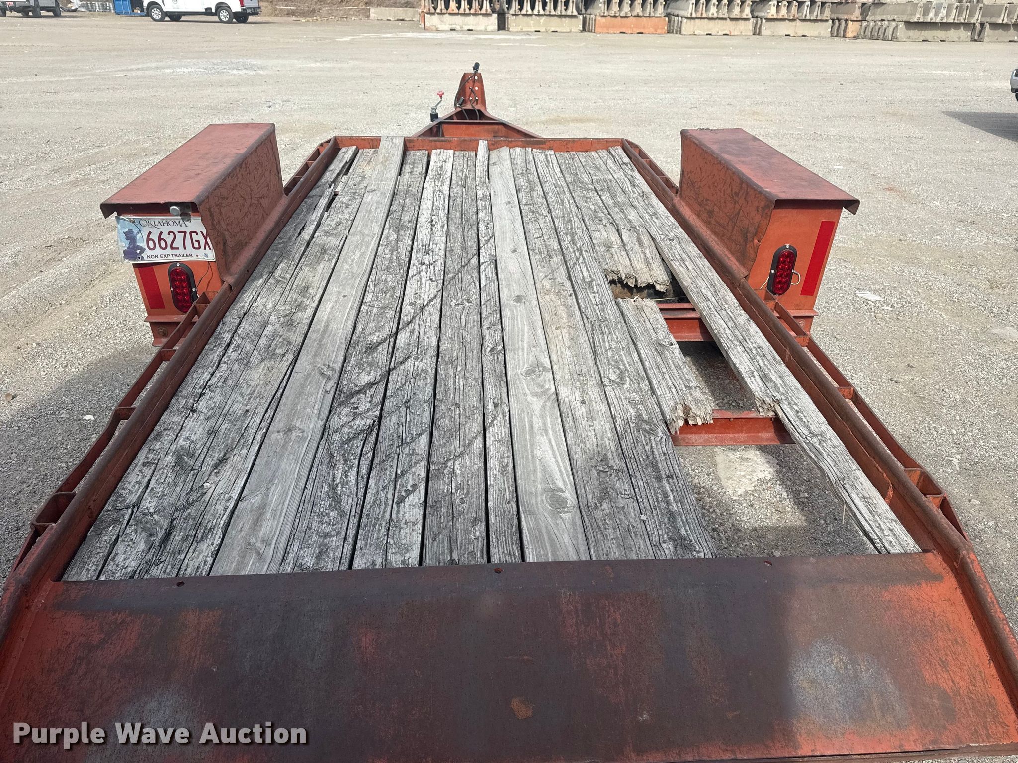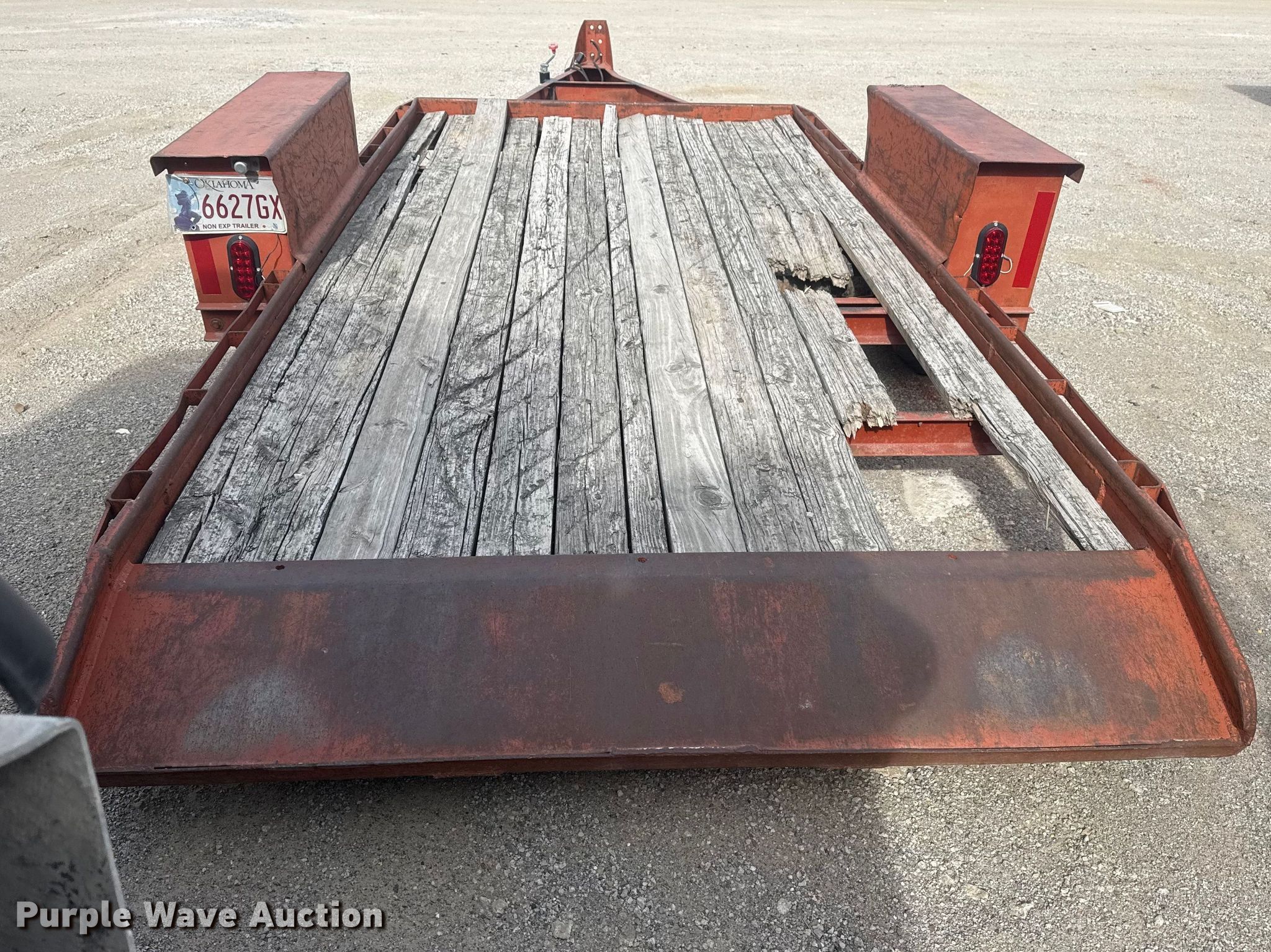 1982 Belshe WB-1 tilt deck utility trailer. VIN: 11963K, Unit #: 15.62. Dimensions Overall Length: 18', Width: 94", Deck Length: 12', Width: 70", Tail length: 1'. Features Deck type: Wood. Chassis Ball hitch: 2 5/16", Landing gear: Single, Suspension: Spring, Brakes: Electric, GVWR: 4,000 lbs, GAWR: 4,000 lbs. Tires Steel wheels, Size: 7.50-16. Notes Deck boards damaged, Tires damaged. Transfer of ownership documentation will be a bill of sale. Sherwood Construction Company. Owasso, OK 74055