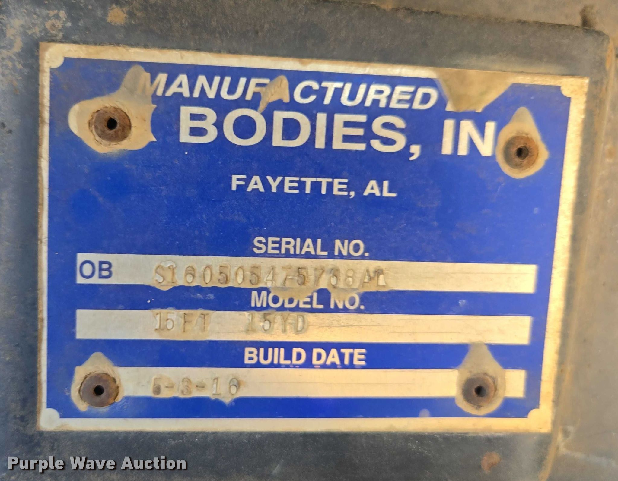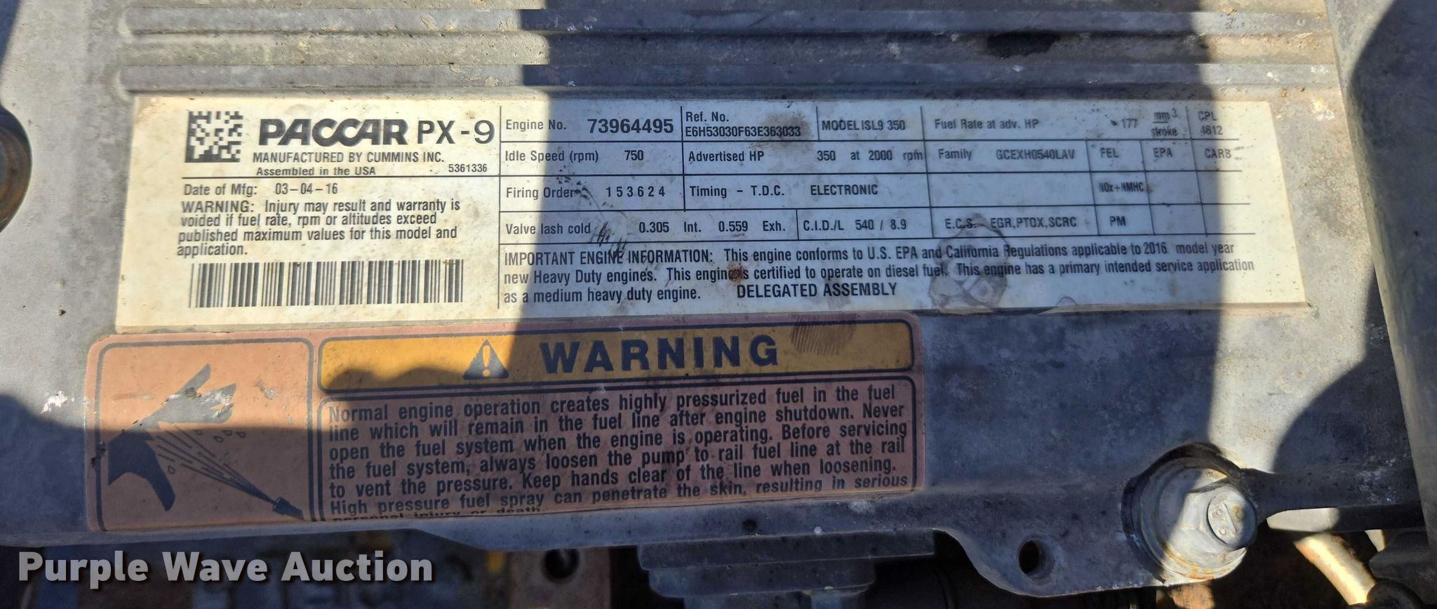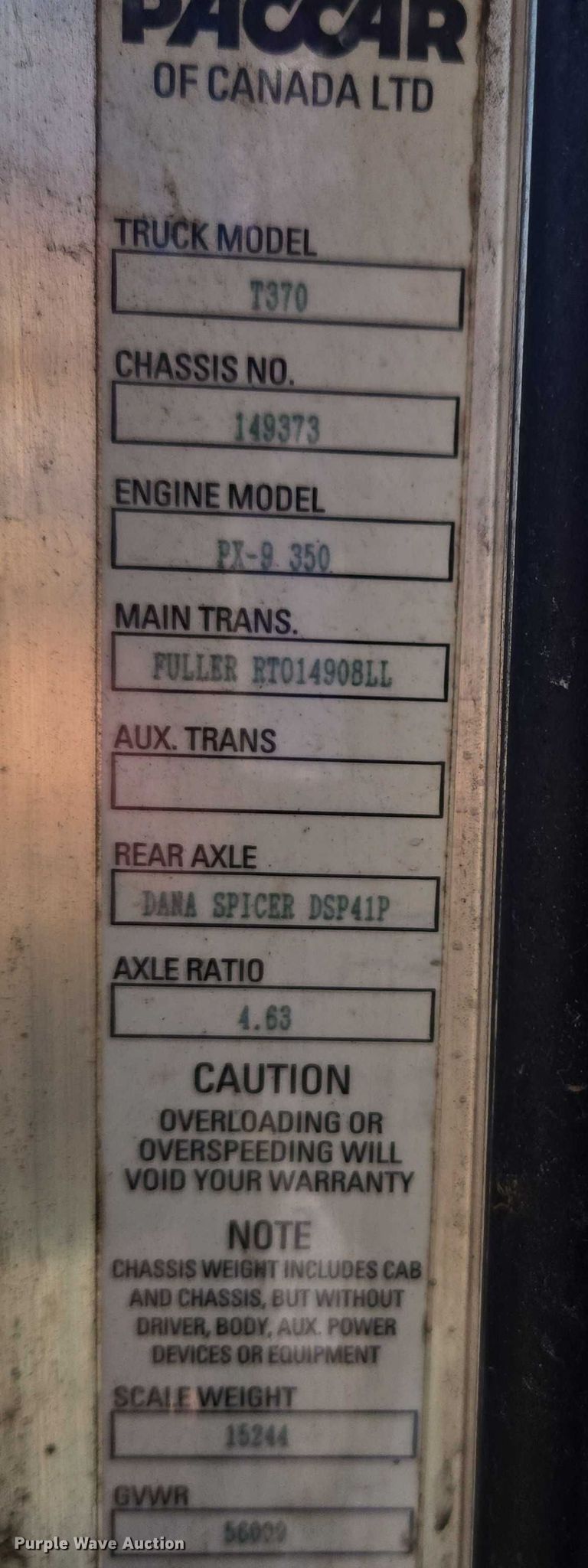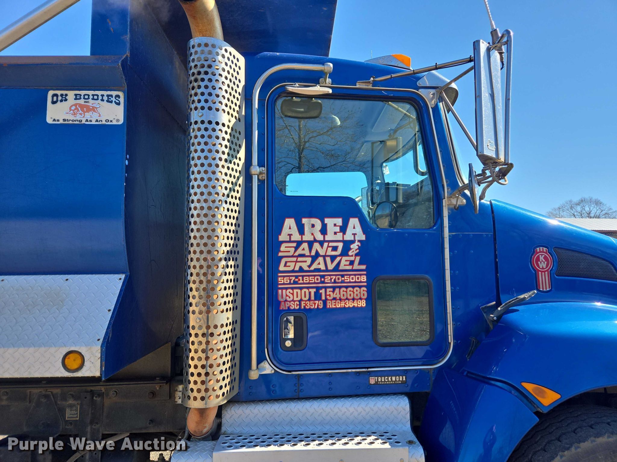 2017 Kenworth T370 dump truck. Miles: 448,739 on odometer, Hours: 19,150 on meter, VIN: 2NKHLJ9X7HM149373. Engine Paccar PX-9, Displacement: 8.9L, Cylinders: 6, Fuel type: Diesel, Engine brake. Transmission Eaton Fuller, Manual, Speed: 10. Chassis Double frame, Axles: Tandem, Differential lock: Full, Suspension: Spring, Brakes: Air, PTO, GVWR: 56,000 lbs. Interior AC, Heat, Heated mirrors, Power windows, Cruise control. Features Bed Dump bed, OX bodies, Length: 15', Width: 96", Side height: 45", Bed type: Steel, Roll tarp, Ram: Single, End gate: Air operated. Tires Front: 385/65R22.5, Rear: 11R22.5. Notes Decals will be removed prior to auction. Alabama title. Title distribution may be delayed up to 14 days from verification of funds. Area Sand & Gravel. Wetumpka, AL 36093