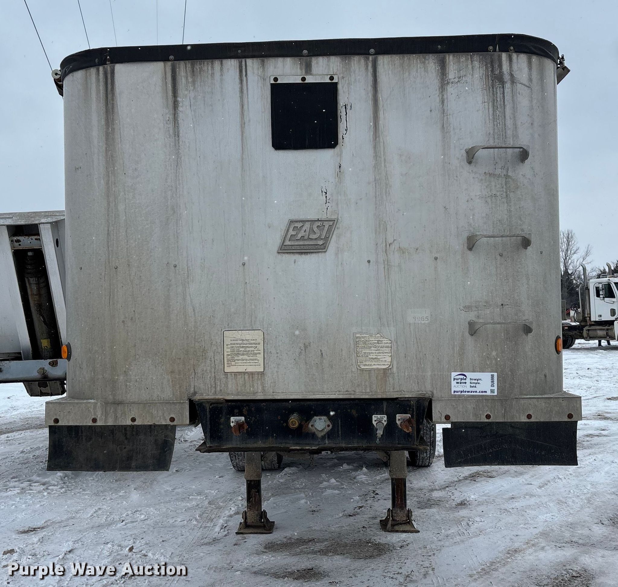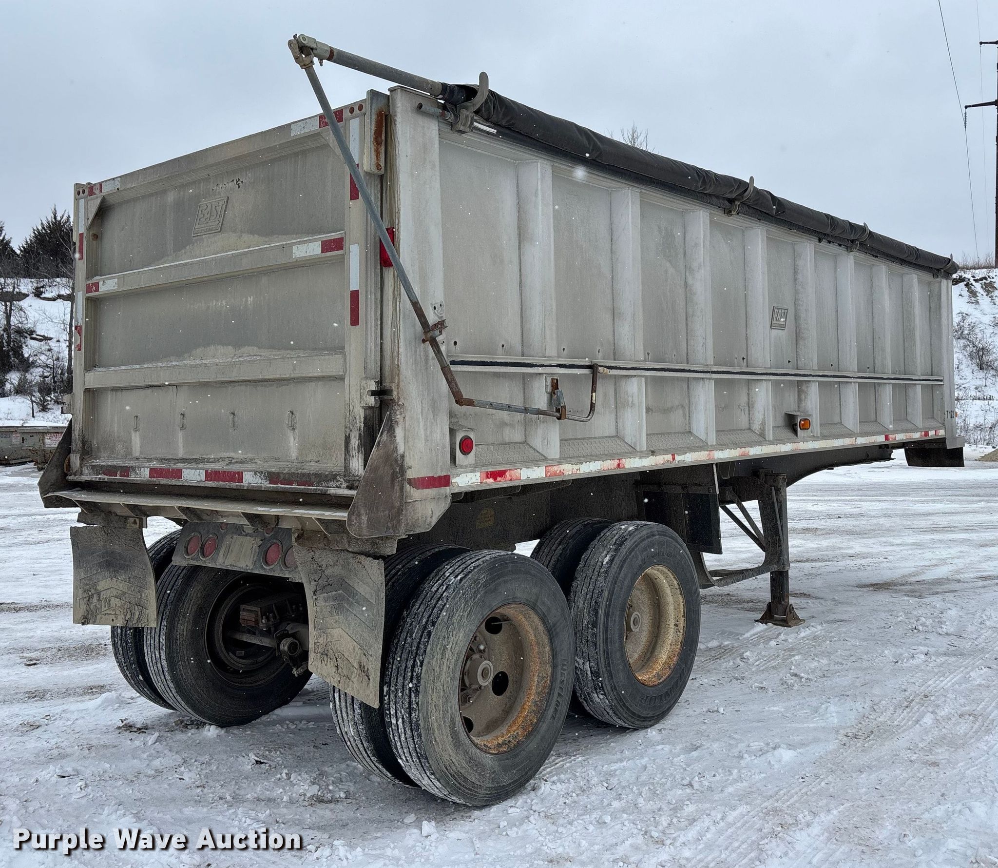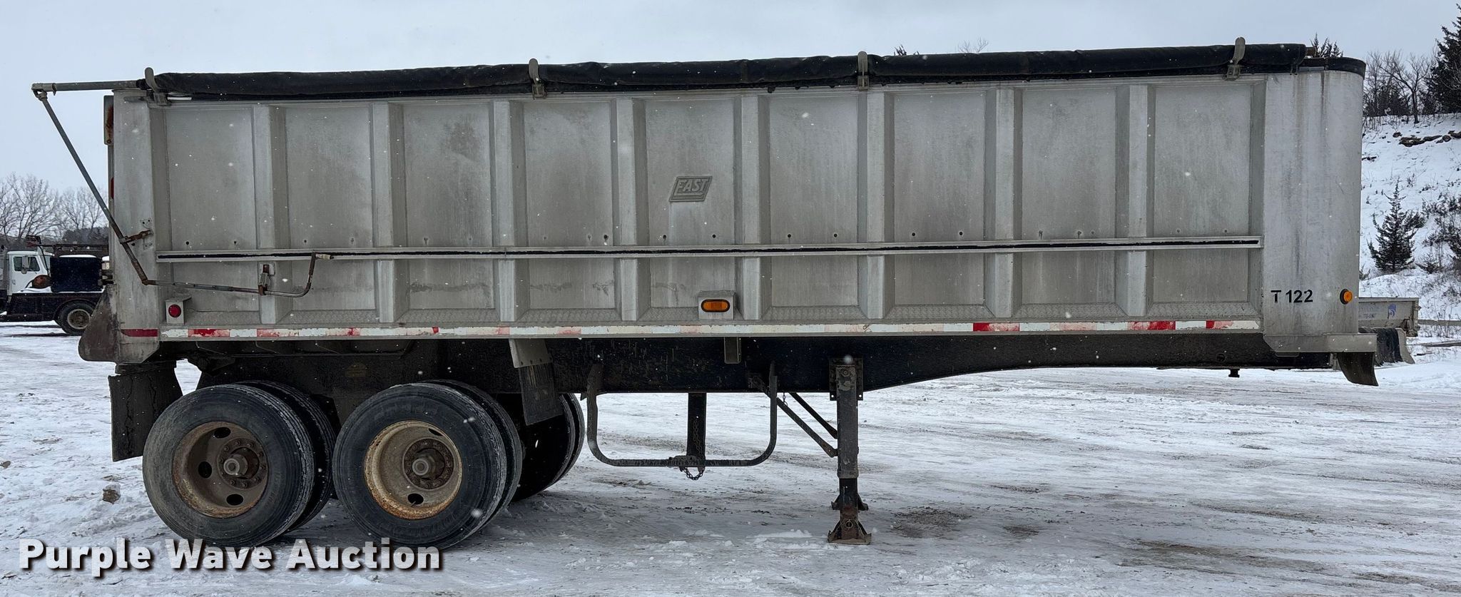2000 East end dump trailer. VIN: 1E1D1L289YRB28965, Unit #: T122. Dimensions Overall Length: 26', Width: 98", Body Length: 25', Width: 96", Side height: 60". Features Body type: Aluminum, Ram: Single, End gate: Air operated, Roll tarp. Chassis Landing gear: Dual, Suspension: Spring, Brakes: Air, Axles: Tandem, GVWR: 80,000 lbs. Tires Steel wheels, Size: 11R24.5. Notes Semi truck not included. Kansas title. Title distribution may be delayed up to 30 days from verification of funds. Bayer Construction Company. Manhattan, KS 66502