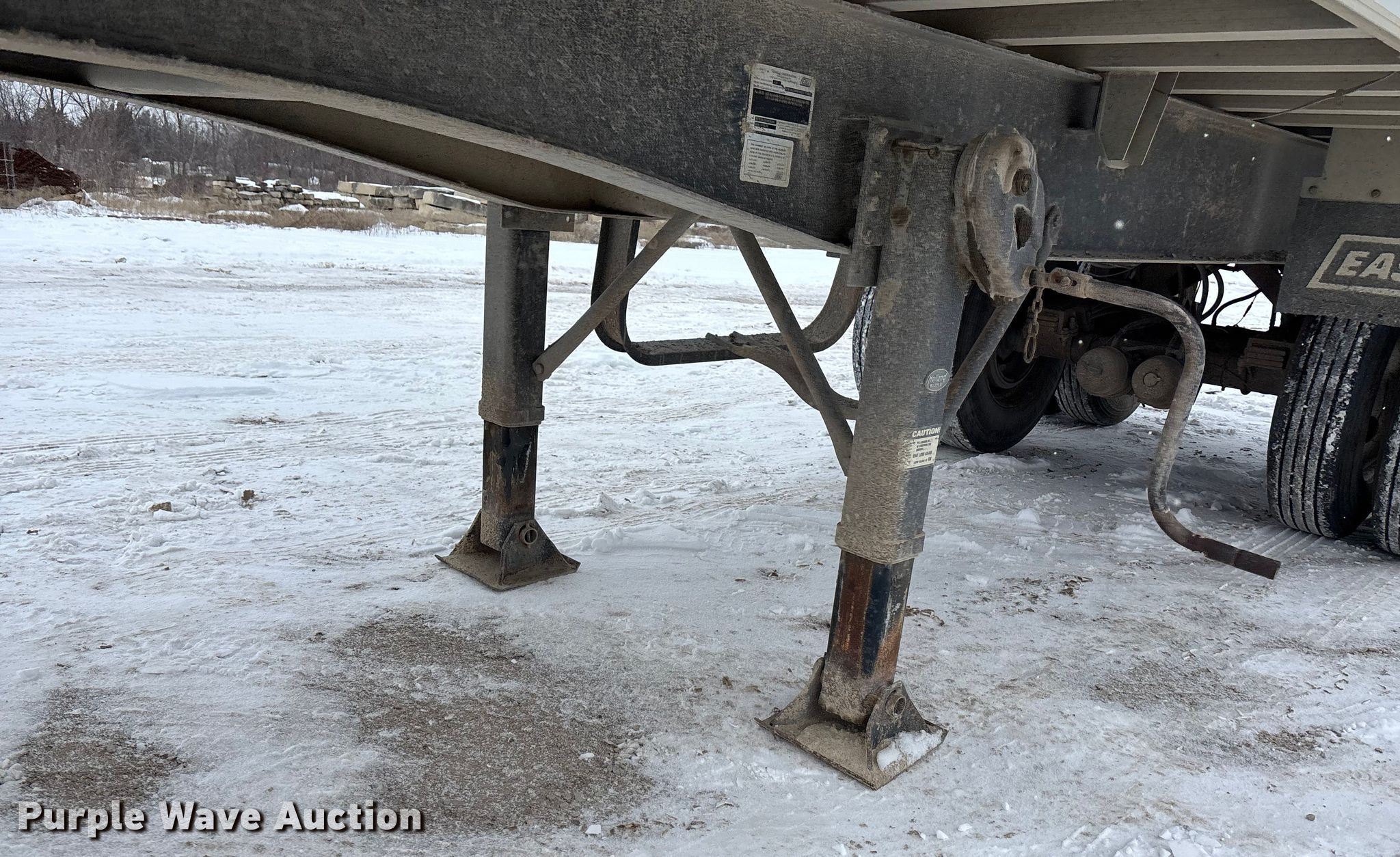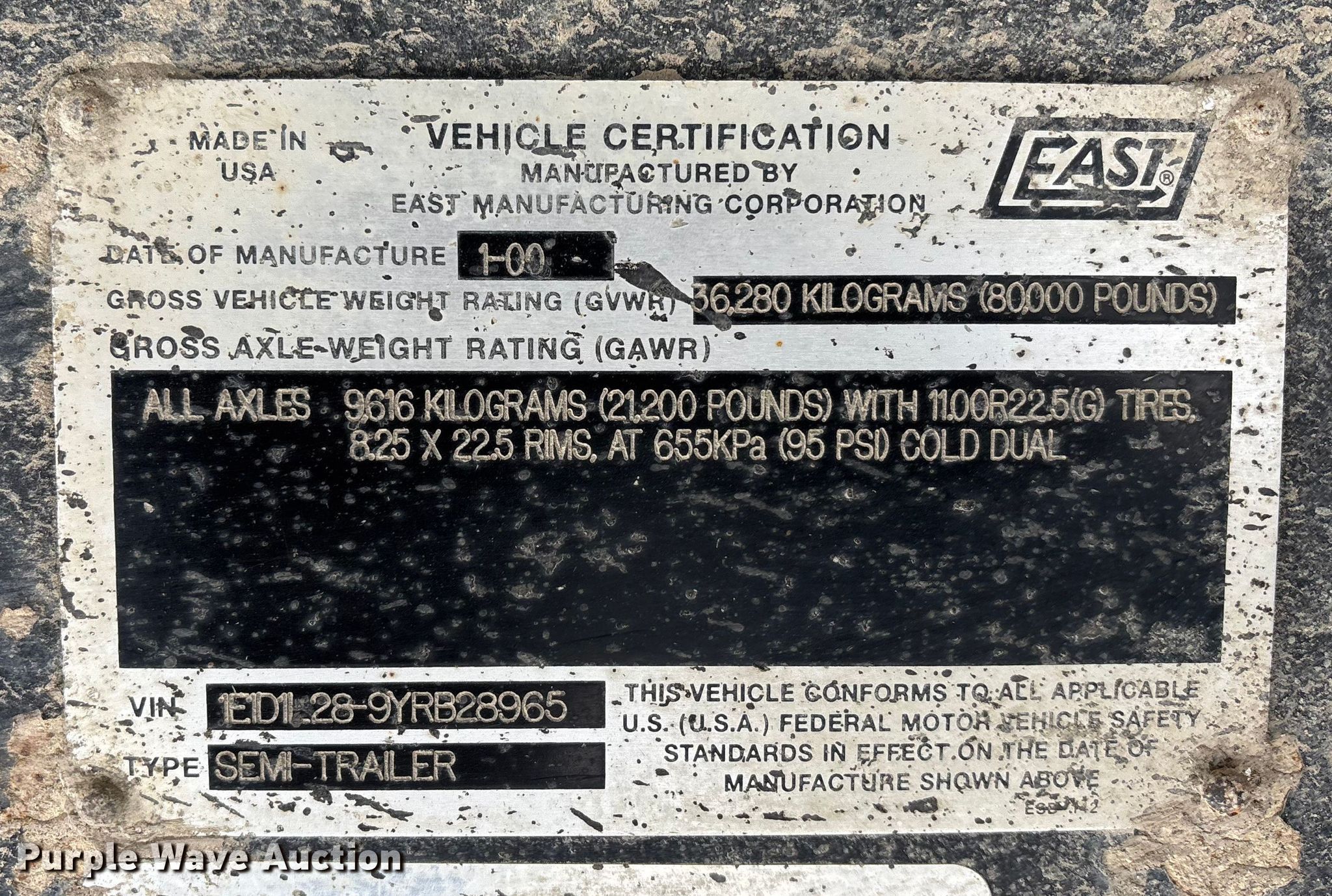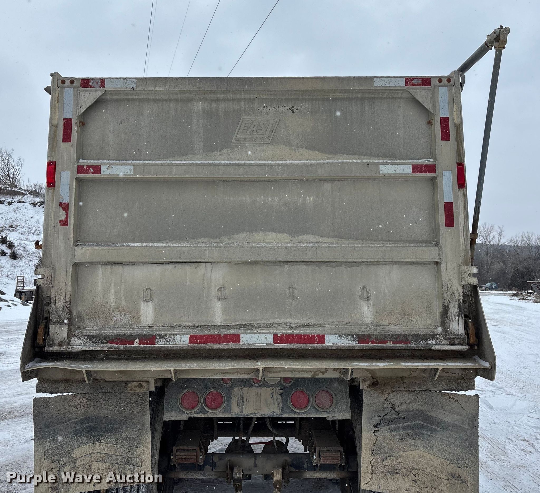 2000 East end dump trailer. VIN: 1E1D1L289YRB28965, Unit #: T122. Dimensions Overall Length: 26', Width: 98", Body Length: 25', Width: 96", Side height: 60". Features Body type: Aluminum, Ram: Single, End gate: Air operated, Roll tarp. Chassis Landing gear: Dual, Suspension: Spring, Brakes: Air, Axles: Tandem, GVWR: 80,000 lbs. Tires Steel wheels, Size: 11R24.5. Notes Semi truck not included. Kansas title. Title distribution may be delayed up to 30 days from verification of funds. Bayer Construction Company. Manhattan, KS 66502