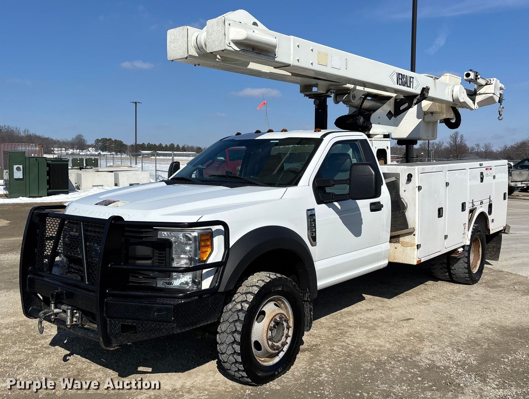 2017 Ford F550 bucket truck. Miles: 166,210 on odometer, VIN: 1FDUF5HY6HEC56712. Engine Displacement: 6.8L, Cylinders: 10, Fuel type: Gas. Transmission Automatic. Chassis Four wheel drive, Axles: Single, Suspension: Spring, Brakes: Hydraulic, GVWR: 19,500 lbs. Interior AC, Heat, Heated mirrors, Auxiliary controls, Brake controller. Features Bed BrandFX, Length: 11', Width: 8', Boom 2017 Versa lift VO40MHI-01, Serial: ME1700013, Maximum lift capacity: 400 lbs, Boom type: Articulating, Insulated, Man basket, Boom controls Lower, Basket, Material handler, Certification valid through: 07/2025. Tires Size: 245/70R19.5. Missouri title. Title distribution may be delayed up to 14 days from verification of funds. Black Rive Electric Cooperative. Fredericktown, MO 63645