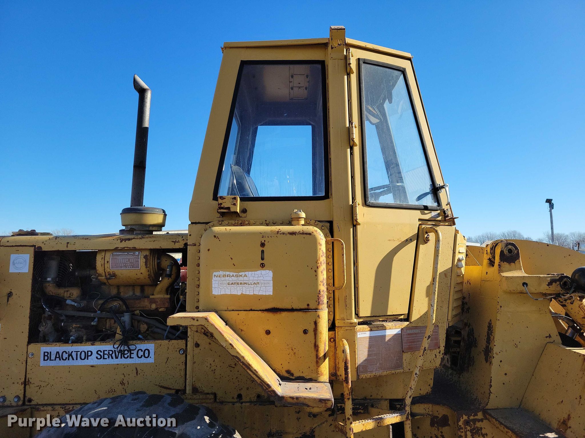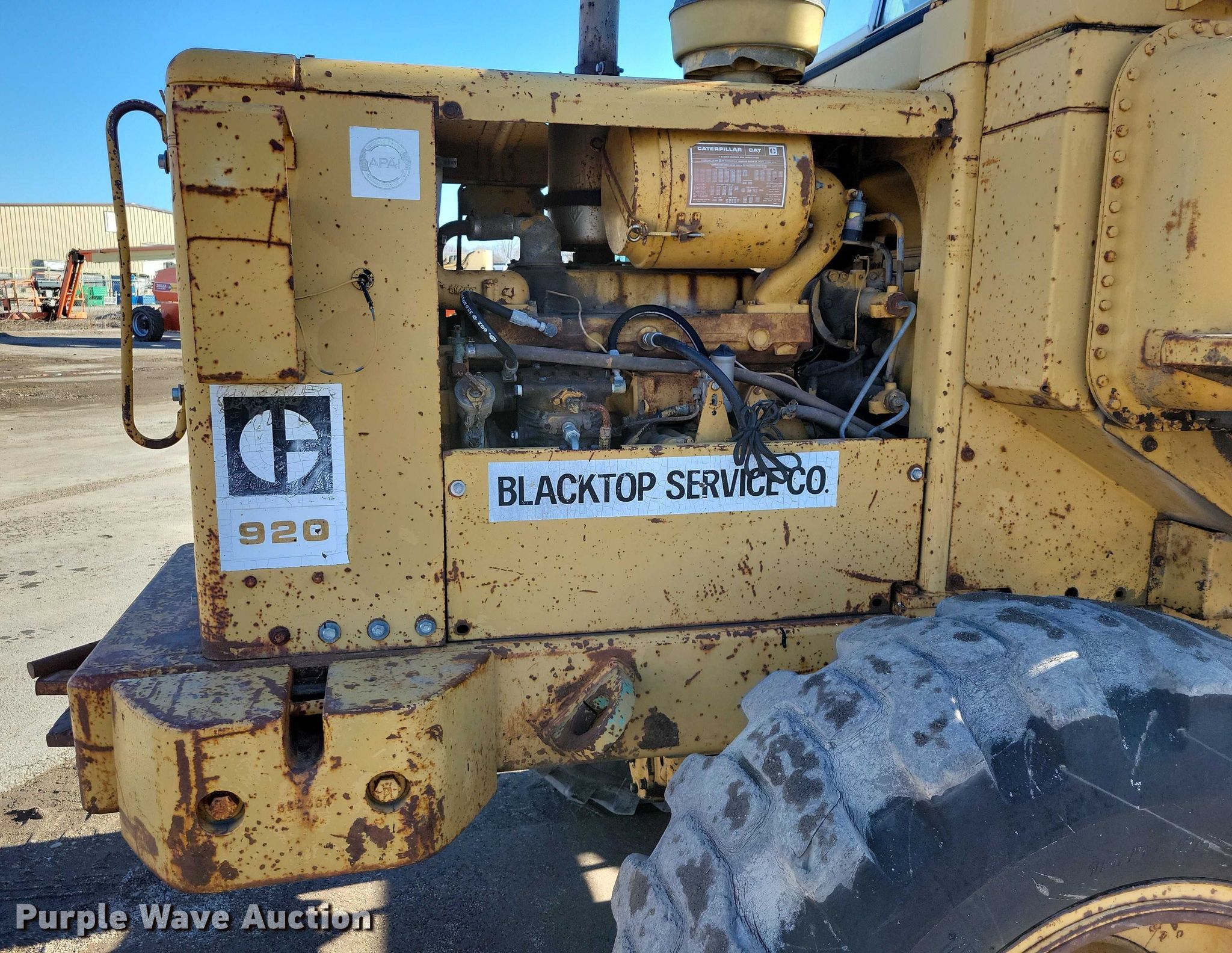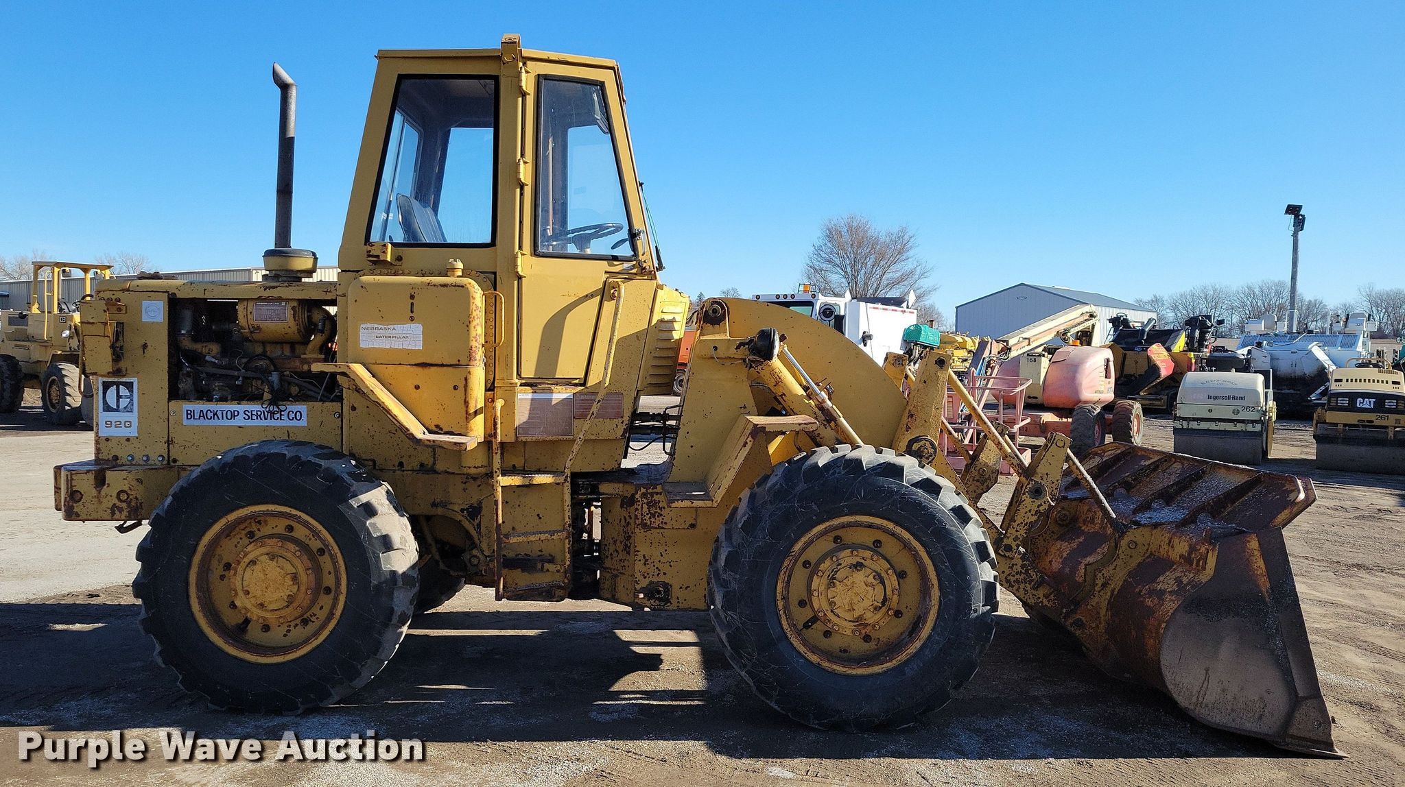 1969 Caterpillar 920 wheel loader. Hours: 3,682 on meter, Serial: 62K1300. Engine Caterpillar 3304, Serial: 78P62694, Displacement: 7.0L, Cylinders: 4, Fuel type: Diesel. Transmission Powershift, 4F - 4R. Operators station Enclosed cab, Bucket controls: Two-lever. Features Counter weights, Bucket Width: 96", Cutting edge: Bolt-on. Tires Size: 15.5-25. Blacktop Service Co.. Humboldt, IA 50548