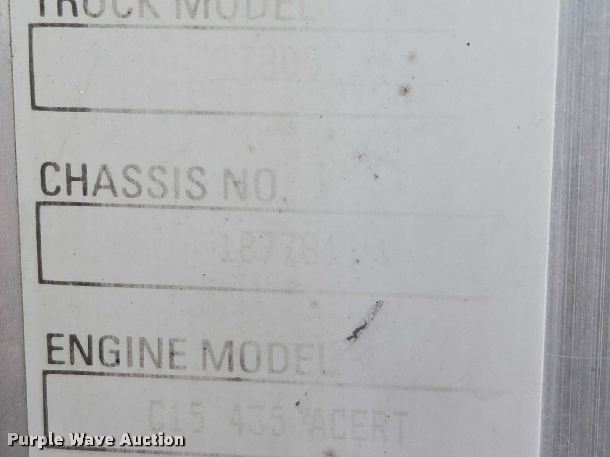 2007 Kenworth T800 semi truck. Miles: 1,058,031 on odometer, Hours: 29,496 on meter, VIN: 1XKDDB9X77J187781. Engine Caterpillar C15 Acert, Displacement: 14.6L, Cylinders: 6, Fuel type: Diesel, HP: 465, Engine brake. Transmission Eaton, Manual, Speed: 10. Chassis Axles: Triple, Pusher axle, Differential lock: Inter-axle, Suspension: Air, Brakes: Air, PTO, Wet kit. Interior AC, Heat, Heated mirrors, Power locks, Cruise control, Air ride cab. Features Deck plate: Aluminum, Fifth wheel type: Air operated, Sliding, Fuel tank: Dual. Tires Size: 295/75R22.5, Lift axle: 255/70R22.5. Notes Dash warning indicator: Check engine, ABS. South Dakota title. Title distribution may be delayed up to 14 days from verification of funds. Clausen & Sons Construction LLC. Watertown, SD 57201