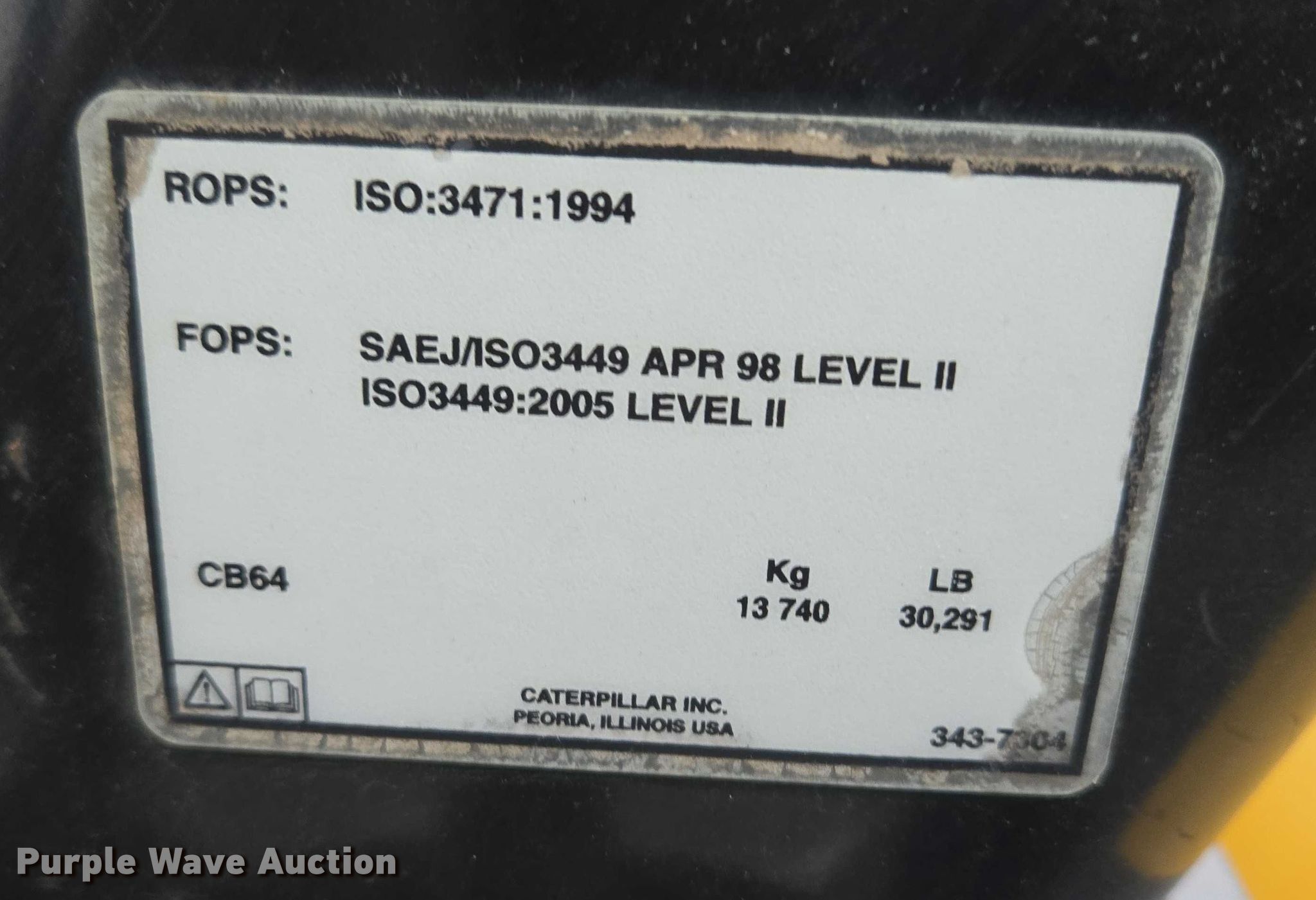 Purple Wave is selling a used Double Drum Roller Compactor in South Dakota. This item is a 2010 Caterpillar CB-64 double drum vibratory roller with the following: Hours: 6,652 on meter, Serial: CAT8CB64ADJM00174