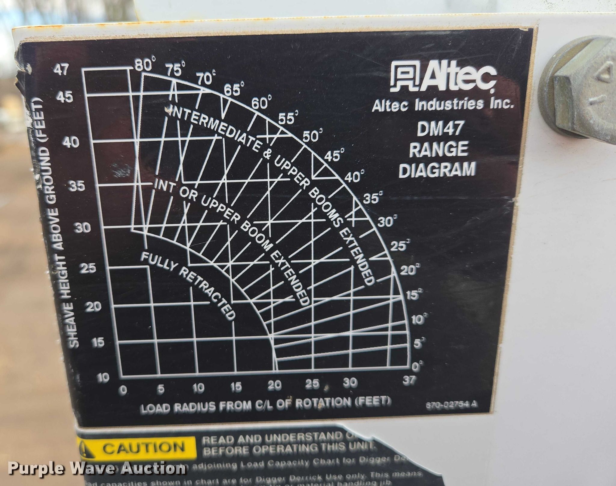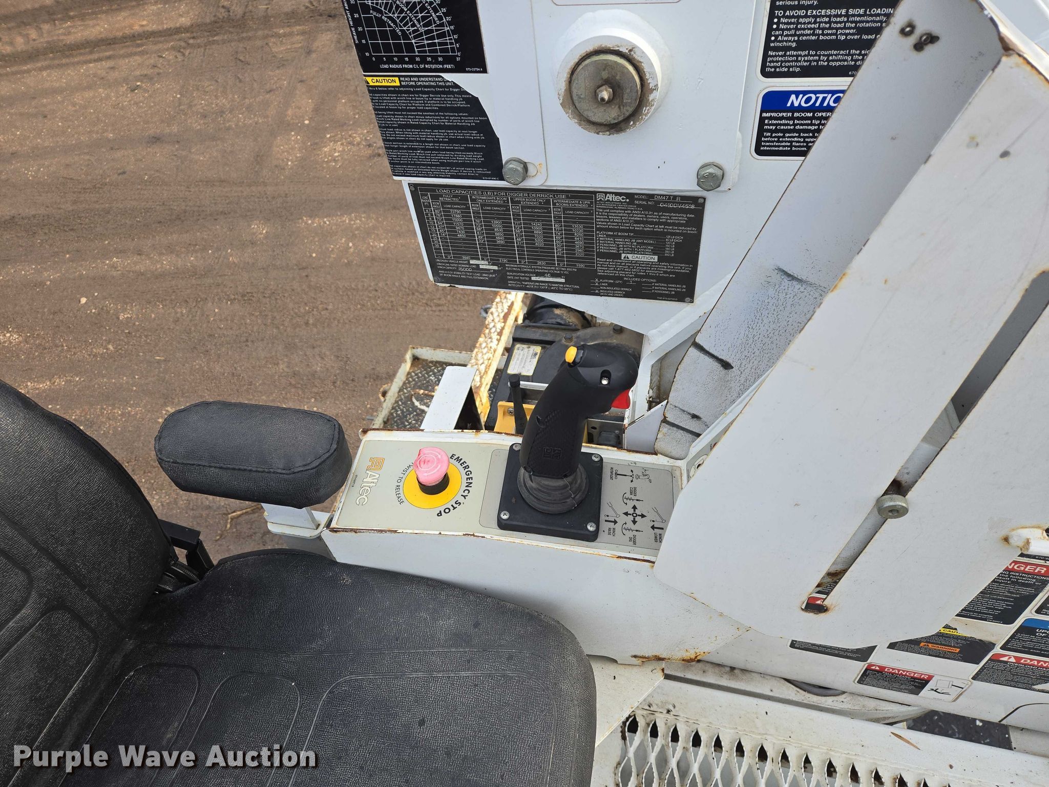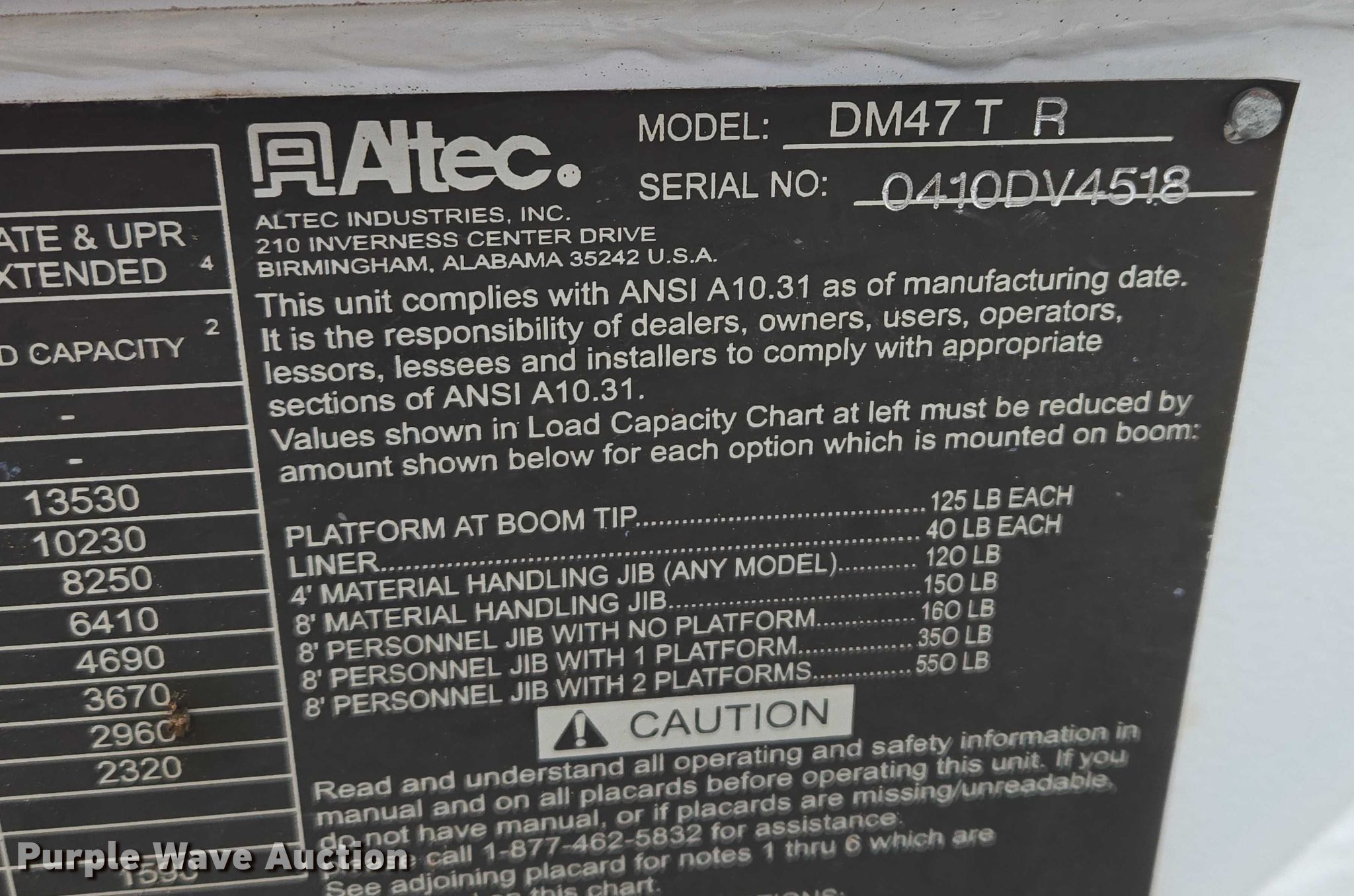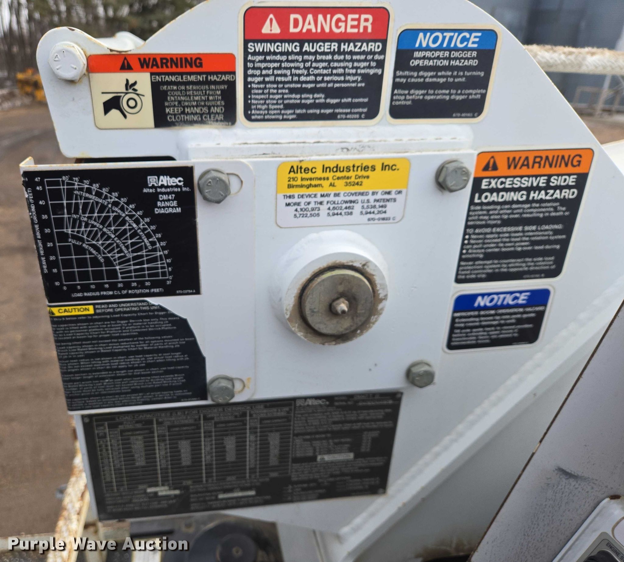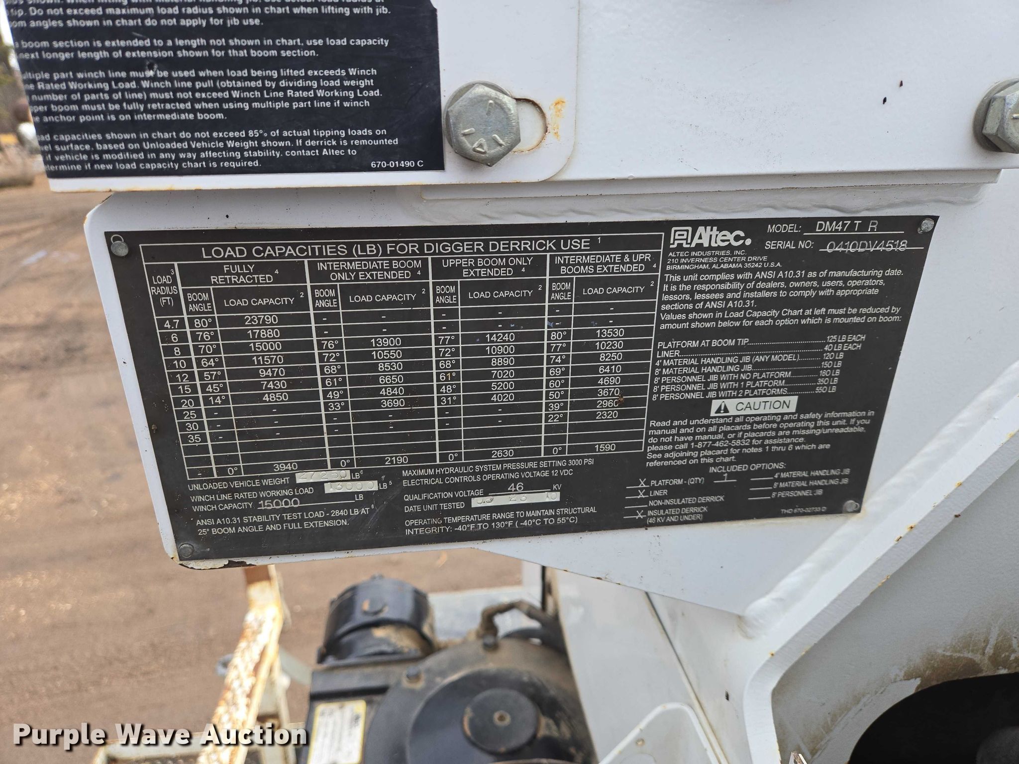 Altec DM47TR digger derrick truck bed. Features. Bed Utility bed, Altec, Serial: 37-165119927, Length: 12' 9", Width: 94", Boom Altec DM47TR, Serial: 0410DV4518, Maximum lift capacity: 23,790 lbs, Maximum lift height: 47', Boom type: Telescopic, Boom controls Platform, Remote control, Material handler, Pole guide, Auger. Notes truck not included. will be removed prior to sale. Elbow Lake, MN 56531