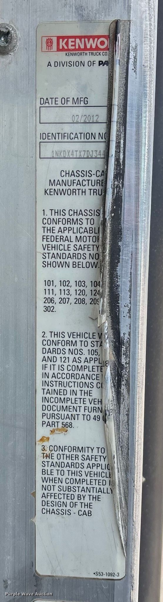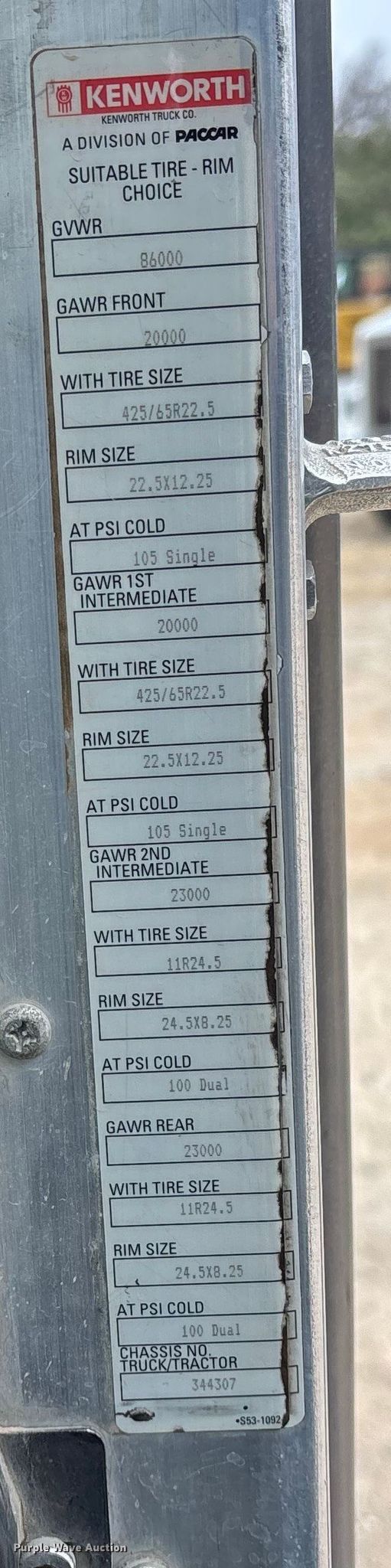 2013 Kenworth T800 semi truck. Miles: 343,901 on odometer, Hours: 4,135 on meter, VIN: 1NKDX4TX7DJ344307, Unit #: 259. Engine Cummins ISX15, Displacement: 15.0L, Cylinders: 6, Fuel type: Diesel, Engine brake. Transmission Eaton Fuller RTLO-18918B, Manual, Speed: 18. Chassis Axles: Triple, Pusher axle Steerable, Gear ratio: 4.30, Differential lock: Full, Suspension: Air Dump valves, Brakes: Air, GVWR: 86,000 lbs FAWR: 20,000 lbs, IAWR: 23,000 lbs, RAWR: 23,000 lbs, Lift axle GAWR: 20,000 lbs, Wheelbase: 252". Interior AC, Heat, Heated mirrors, Power locks, Cruise control, Air ride cab, Auxiliary controls. Features Deck plate: Steel, Fifth wheel type: Air operated, Sliding, Fuel tank: Dual. Tires Front: 425/65R22.5, Rear: 11R24.5, Lift axle: 425/65R22.5. Notes Unknown operating condition of lift axle, Dash warning indicator: ABS, Windshield chipped or cracked, Dead battery, Jump start required during on-site data collection, Emissions system modified, DEF deleted. Texas title. Title distribution may be delayed up to 30 days from verification of funds. CTC Transportation - Open inspection February 24th. 3540 Euless South Main Street. Euless, TX 76040