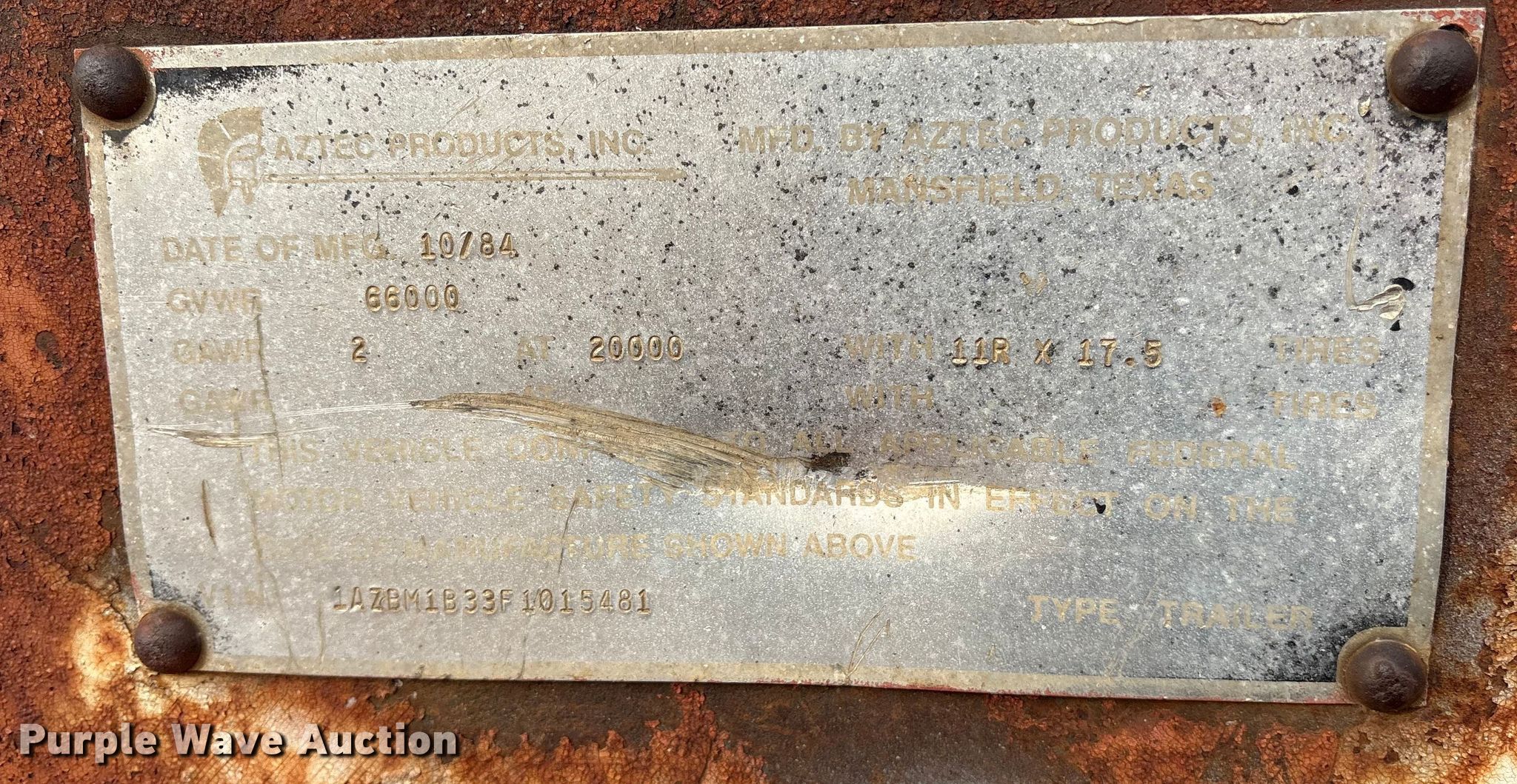 Purple Wave is selling a used Flat or Drop Deck Trailer in Texas. This item is a 1985 Aztec drop deck trailer with the following: VIN: 1AZBM1B33F1015481, Unit #: 559