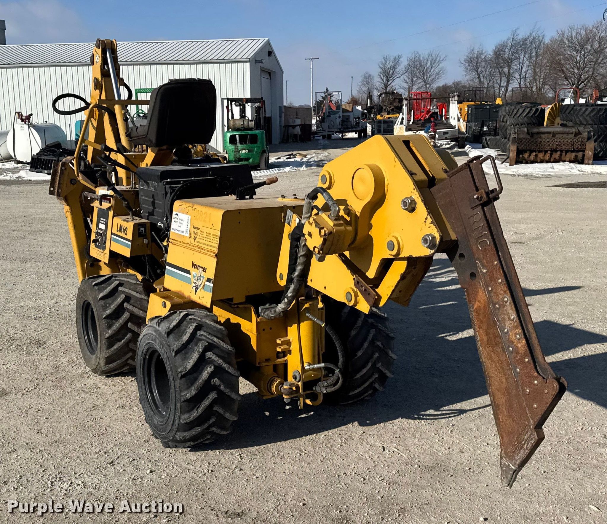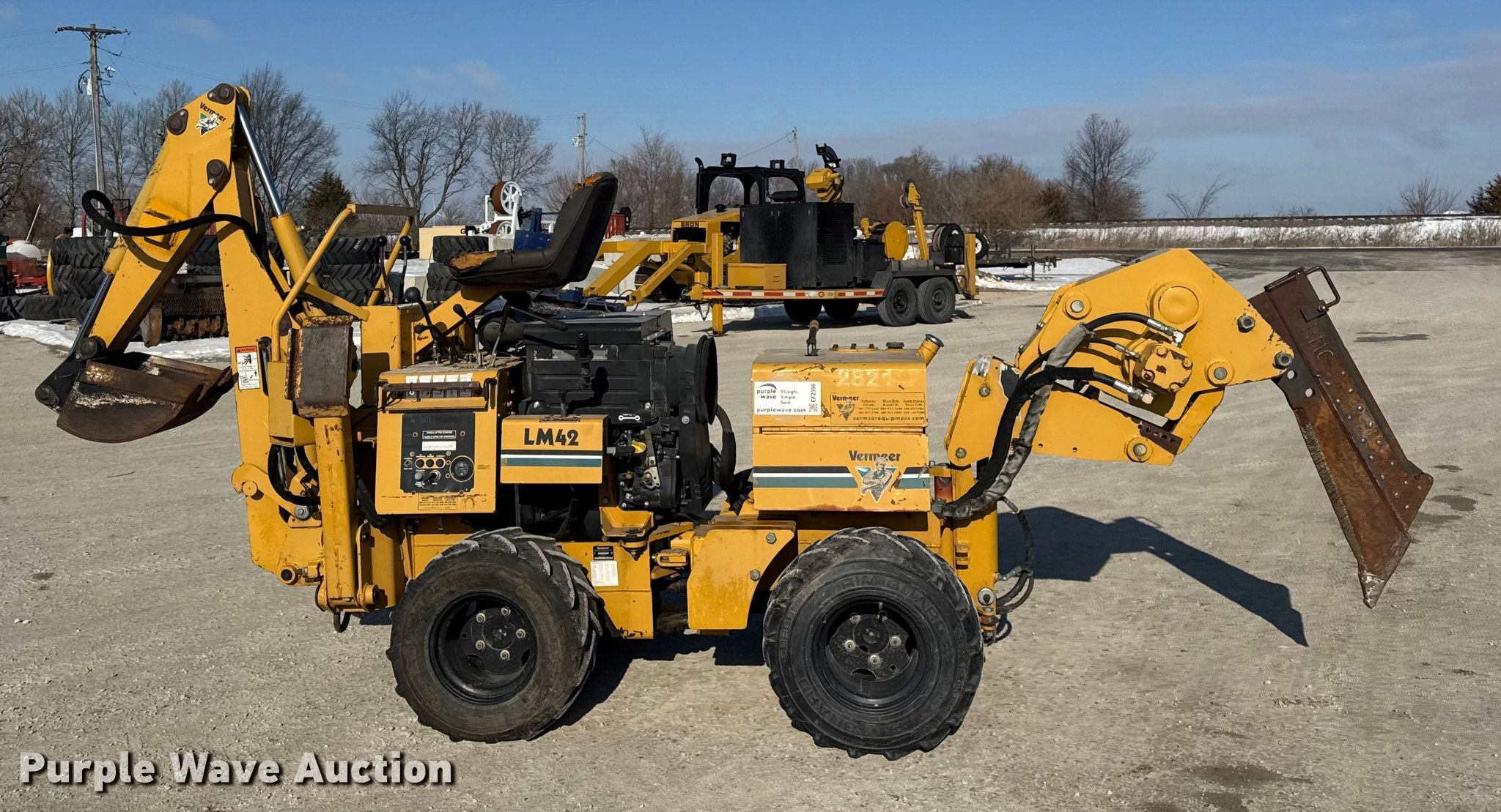 2003 Vermeer LM42 cable plow. Hours: 605 on meter, Serial: 1VRM112L431002375. Engine Deutz F3L 1011F, Cylinders: 3, Fuel type: Diesel. Transmission Hydrostatic. Chassis Four wheel drive. Features Vibratory plow Model: VP40, Serial: 1VRM040E631002416, Depth: 30", Backhoe Model: B500, Serial: 1VRM040M6Y1001090, Bucket width: 12". Tires Size: 26x12.00-12. EquipmentCity LLC. Clinton, IL 61727