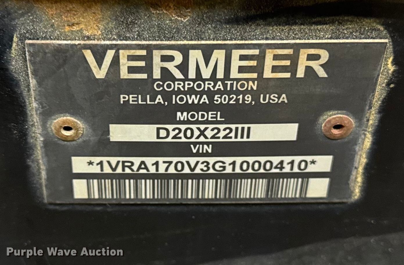 Purple Wave is selling a used Directional Boring Unit in Illinois. This item is a 2016 Vermeer D20X22III directional boring unit with the following: Hours: 4,892 on meter, Serial: 1VRA170V3G1000410