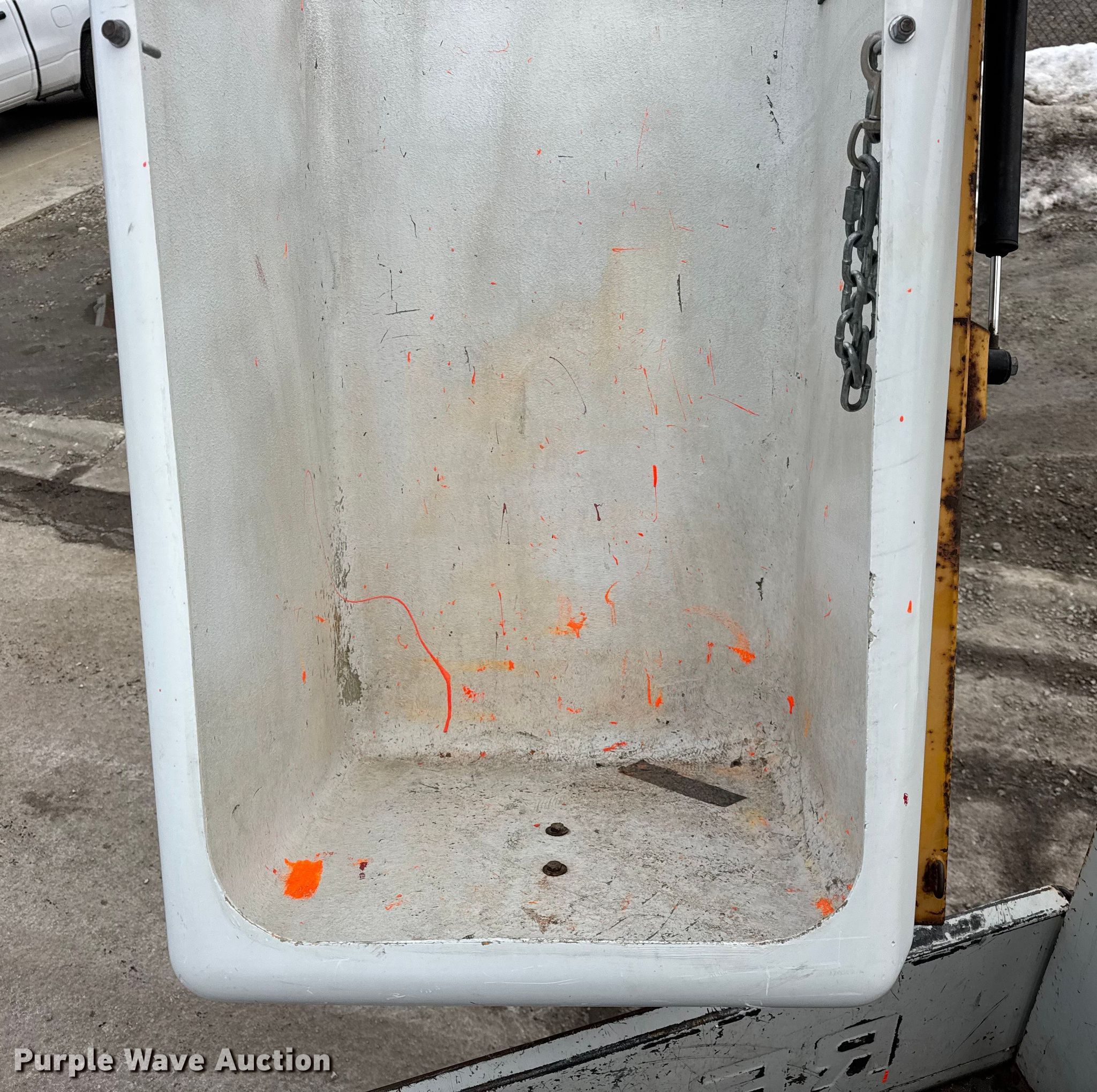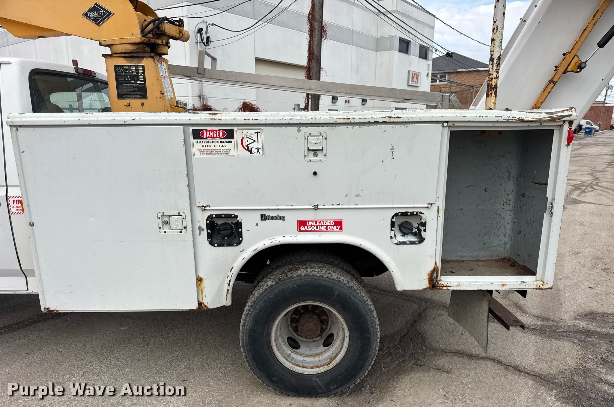 1997 Ford F450 Super Duty bucket truck. Miles: 67,965 on odometer, Hours: 2,737 on meter, VIN: 3FELF47G8VMA60416. Engine Displacement: 7.5L, Cylinders: 8, Fuel type: Gas. Transmission Automatic. Chassis Axles: Single, Suspension: Spring, Brakes: Hydraulic, PTO, GVWR: 15,000 lbs, Wheelbase: 137". Interior Heat. Features Bed Utility bed, Reading, Length: 9', Width: 92", Boom 1997 Versalift TEL29N, Serial: AG97195, Maximum lift capacity: 300 lbs, Maximum lift height: 29', Boom type: Telescopic, Man basket, Boom controls Lower, Basket.. Tires Size: 235/85R16. Notes Owner's manuals, Utility bed compartment door missing, Rust damage, hole in bed. Illinois title. Title distribution may be delayed up to 14 days from verification of funds. McLoughlin Landscaping. Franklin Park, IL 60131