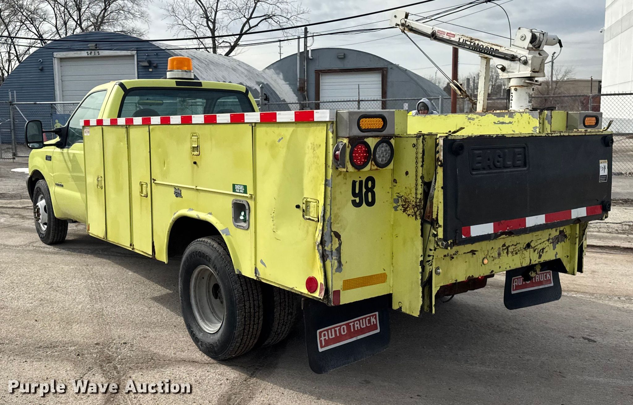 2001 Ford F350 Super Duty utility bed pickup truck. Miles: 71,777 on odometer, Hours: 87 on meter, VIN: 1FDWF36F11EA27942. Engine Displacement: 7.3L, Cylinders: 8, Fuel type: Diesel. Transmission Automatic. Chassis Axles: Single, Suspension: Spring, Brakes: Hydraulic. Interior Heat, Cruise control. Features Bed Utility bed, Reading 132FADW-R, Serial: 509422, Length: 11', Width: 94", Crane Liftmoore L-21, Maximum lift capacity: 2,000 lbs, End gate lift Eagle Lift DL38 X. Tires Size: 235/85R16. Illinois title. Title distribution may be delayed up to 14 days from verification of funds. McLoughlin Landscaping. Franklin Park, IL 60131