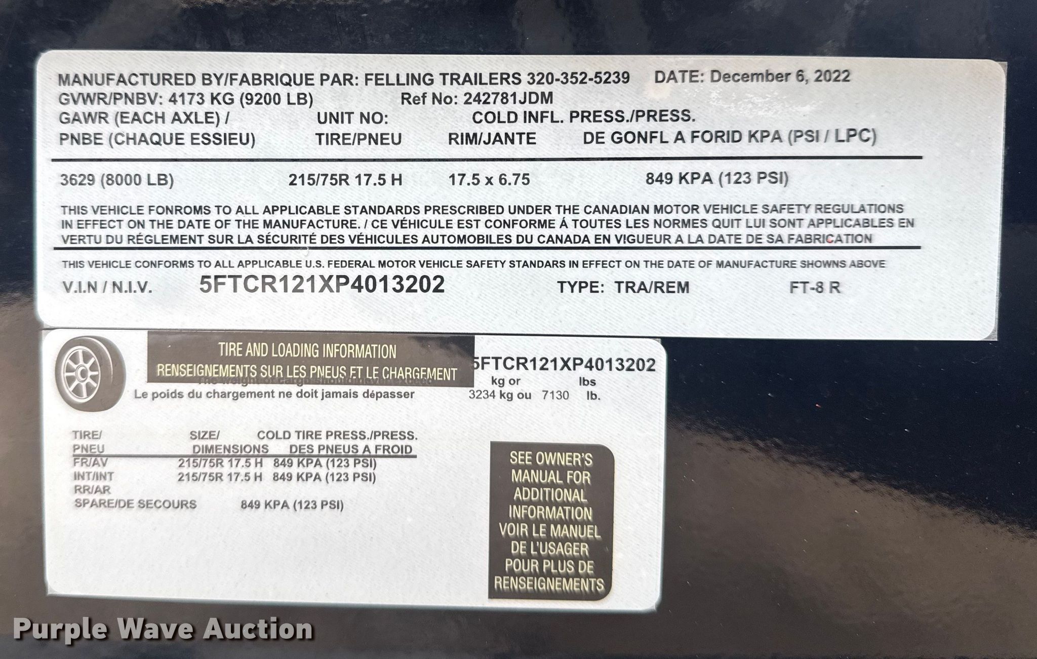 2023 Felling Trailers FT-8R reel trailer. VIN: 5FTCR121XP4013202. Dimensions Overall Length: 12', Width: 99". Features Reel: Single, Maximum reel width: 66", Maximum reel diameter: 80", Hydraulic height adjustment, Self-contained hydraulics. Chassis Hitch: Pintle, Landing gear: Single, GVWR: 9,200 lbs, GAWR: 8,000 lbs. Tires Size: 215/75R17.5. Notes Spare tire included. Oklahoma title. Seller is an Oklahoma licensed motor vehicle dealer. Buyers may be required to provide identification to the licensed dealer to comply with state laws. Title will be assigned and distributed by the dealer. Please contact the seller for distribution questions. Title distribution may be delayed up to 30 days from verification of funds. Collinsville, OK 74021