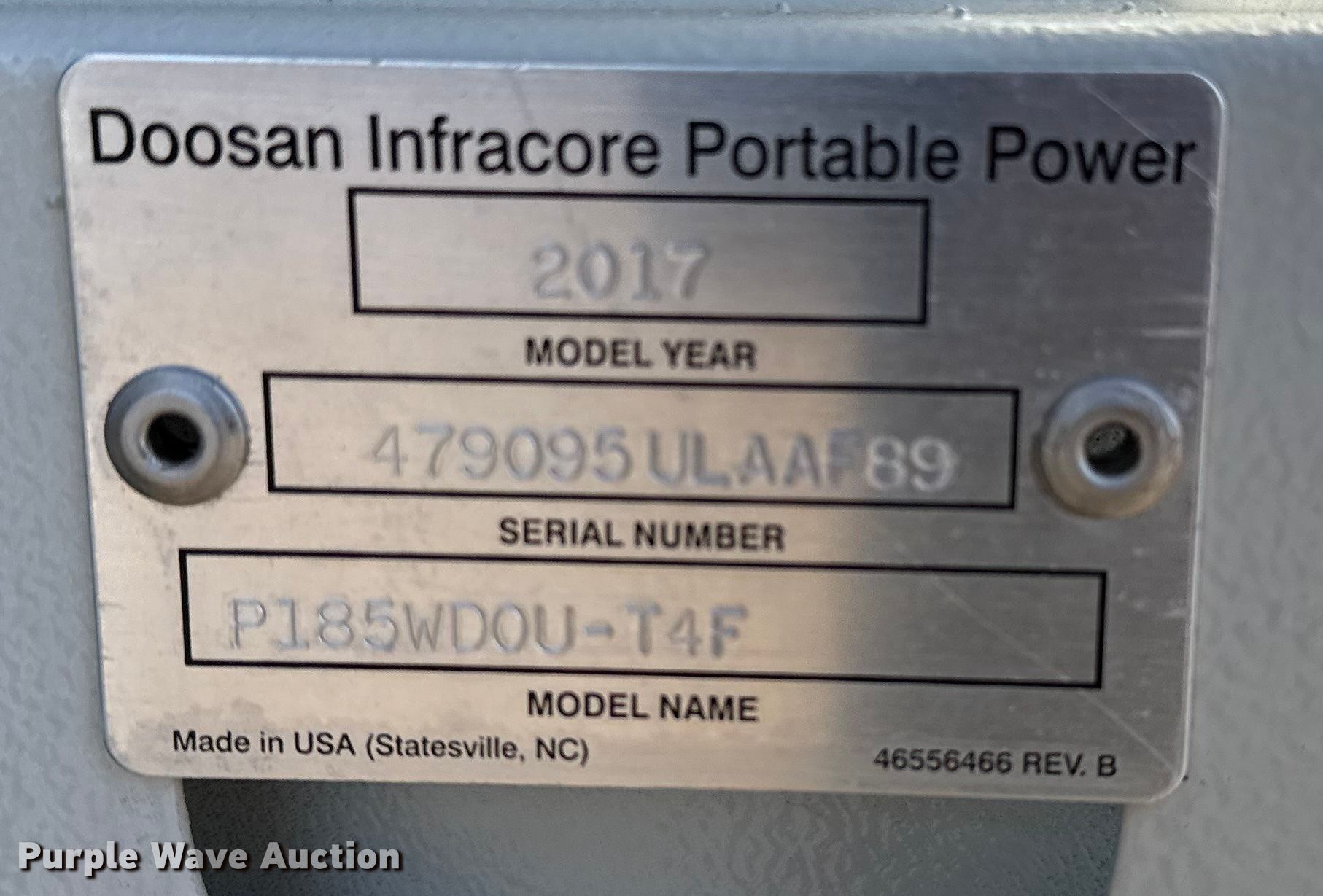 Purple Wave is selling a used Air Compressor in Oklahoma. This item is a 2017 Doosan P185WDOU-T4F air compressor with the following: Hours: 3,228 on meter, Serial: 479095ULAAF89