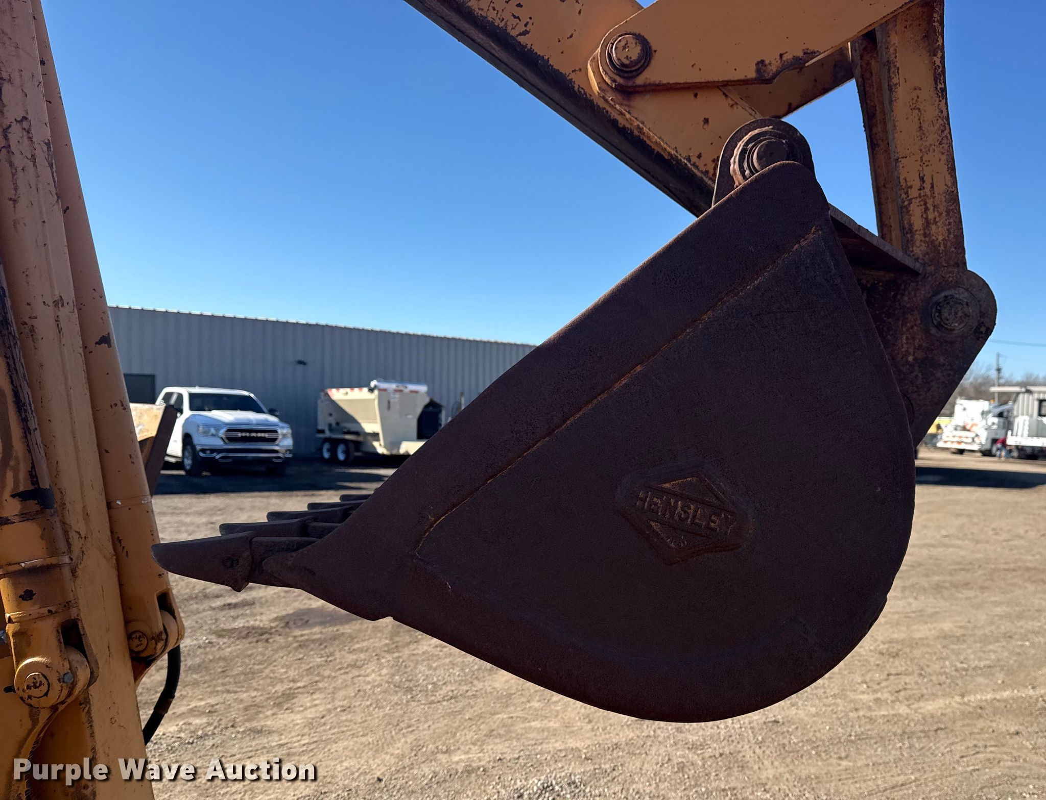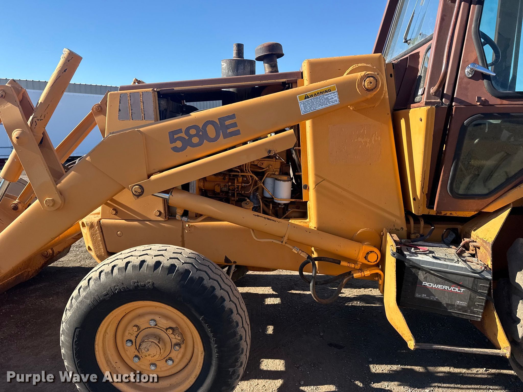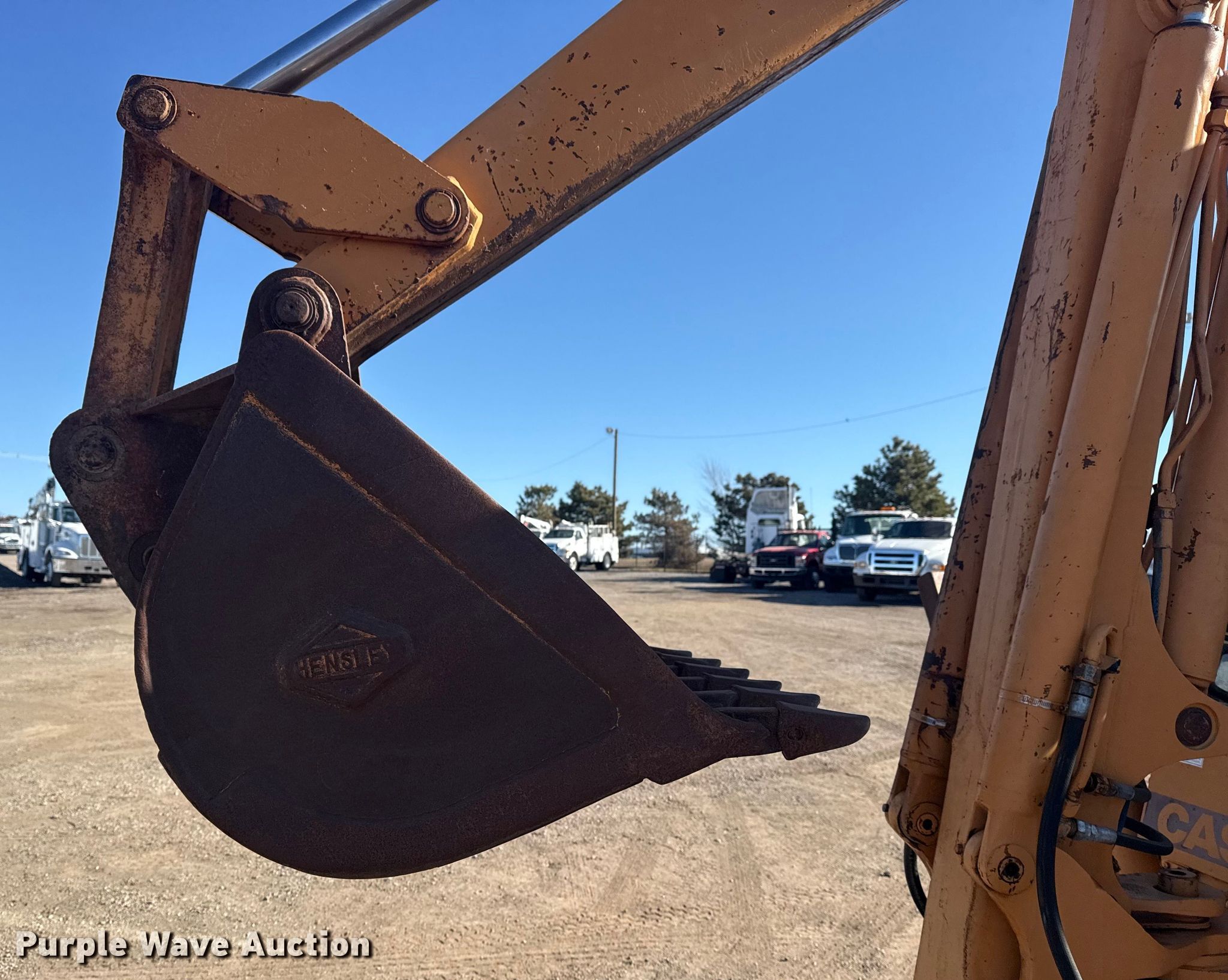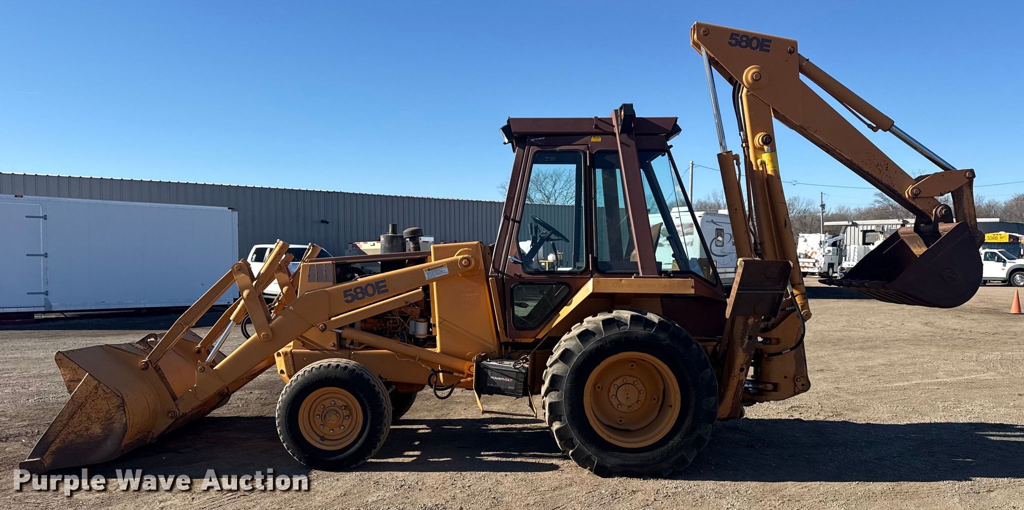 1985 Case 580E backhoe. Hours: 4,651 on meter, Serial: 17028510. Engine Case 4-390, Serial: 4413375, Cylinders: 4, Fuel type: Diesel. Transmission Shuttle shift, 4F - 4R. Chassis Differential lock. Operators station Enclosed cab, Backhoe controls: Wobble stick / two stick. Features Loader Width: 82", Cutting edge: Bolt-on, Backhoe Bucket Hensley, Width: 35", Teeth: 6.. Tires Front: 11L-16SL, Rear: 17.5L-24. Notes Back glass missing, Cutting edge missing. Collinsville, OK 74021