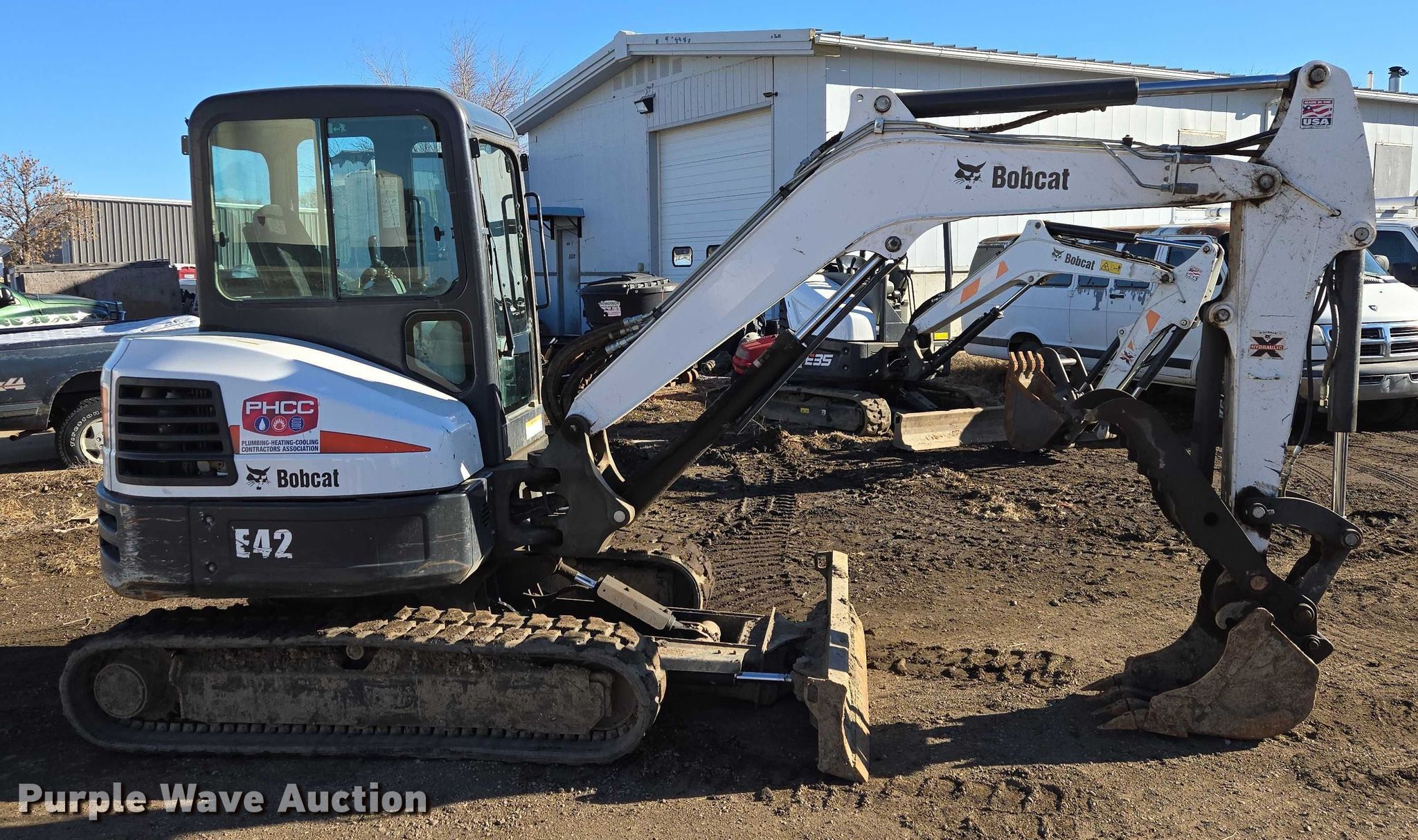 2019 Bobcat E42 mini excavator. Hours: 3,513 on meter, Serial: B2VW15409. Engine Bobcat, Cylinders: 4, Fuel type: Diesel, HP: 42.7. Transmission Hydrostatic, Two speed travel. Operators station Enclosed cab, AC, Heat. Features Auxiliary hydraulics, Backfill blade Width: 69", Boom Swing, Stick Stick length: 4' 7", Quick coupler: Hydraulic, Thumb: Hydraulic, Bucket Width: 18", Teeth: 4. Tracks Width: 13", Rubber. Wheelhouse Plumbing, Inc.. Pierre, SD 57501