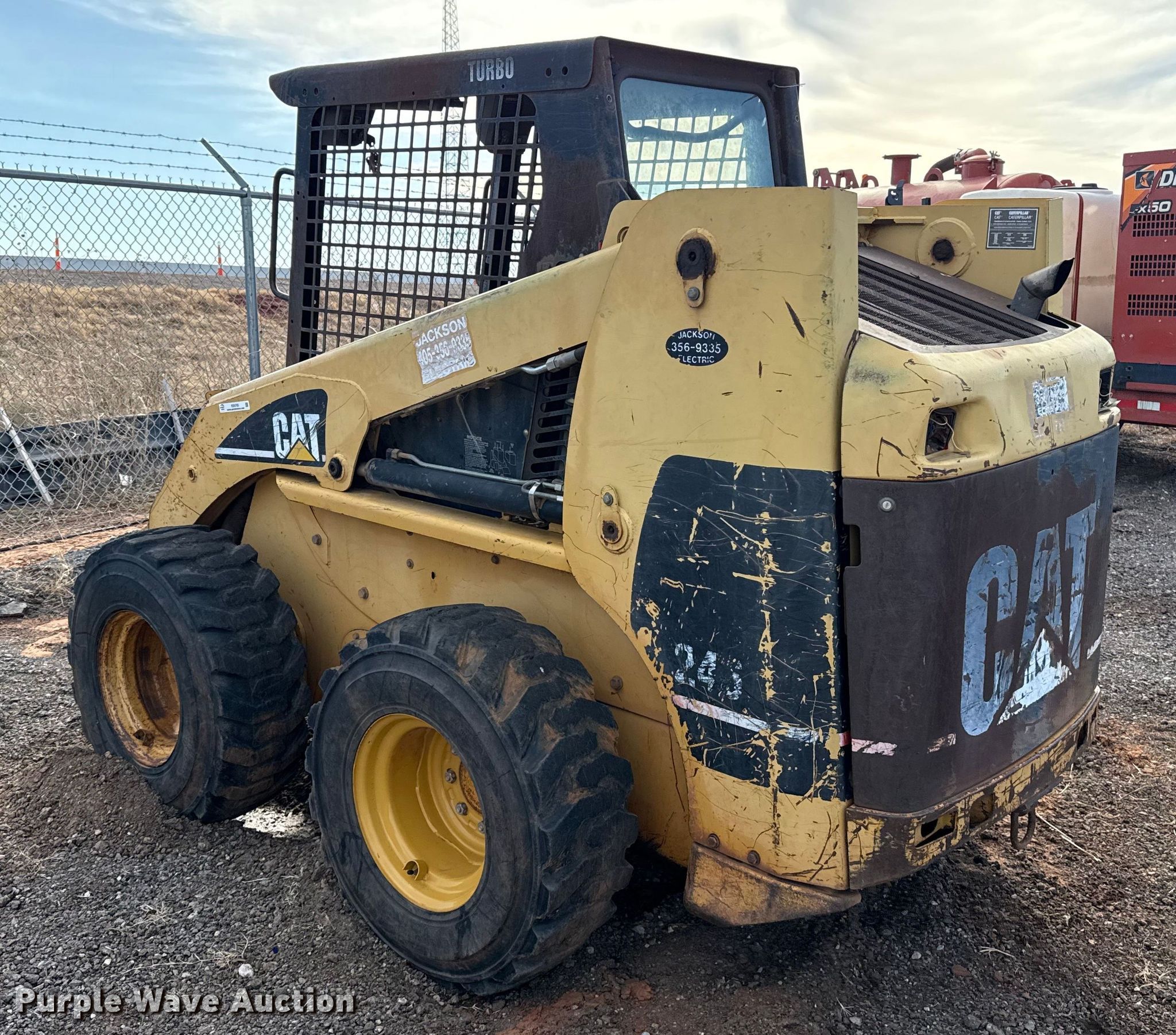 2002 Caterpillar 246 skid steer loader. Hours: Unknown, Serial: CAT00246K5SZ05098. Engine Caterpillar 3034, Cylinders: 4, Fuel type: Diesel. Transmission Hydrostatic. Operators station OROPS, Bucket control: Hand. Features Auxiliary hydraulics, Quick coupler: Manual. Tires Size: 12-16.5. Notes Dead battery, Starter disconnected, Possible hydraulic drive motor issues, Possible engine issues , Non-operational unit. Jackson Electrical Construction. Wellston, OK 74881
