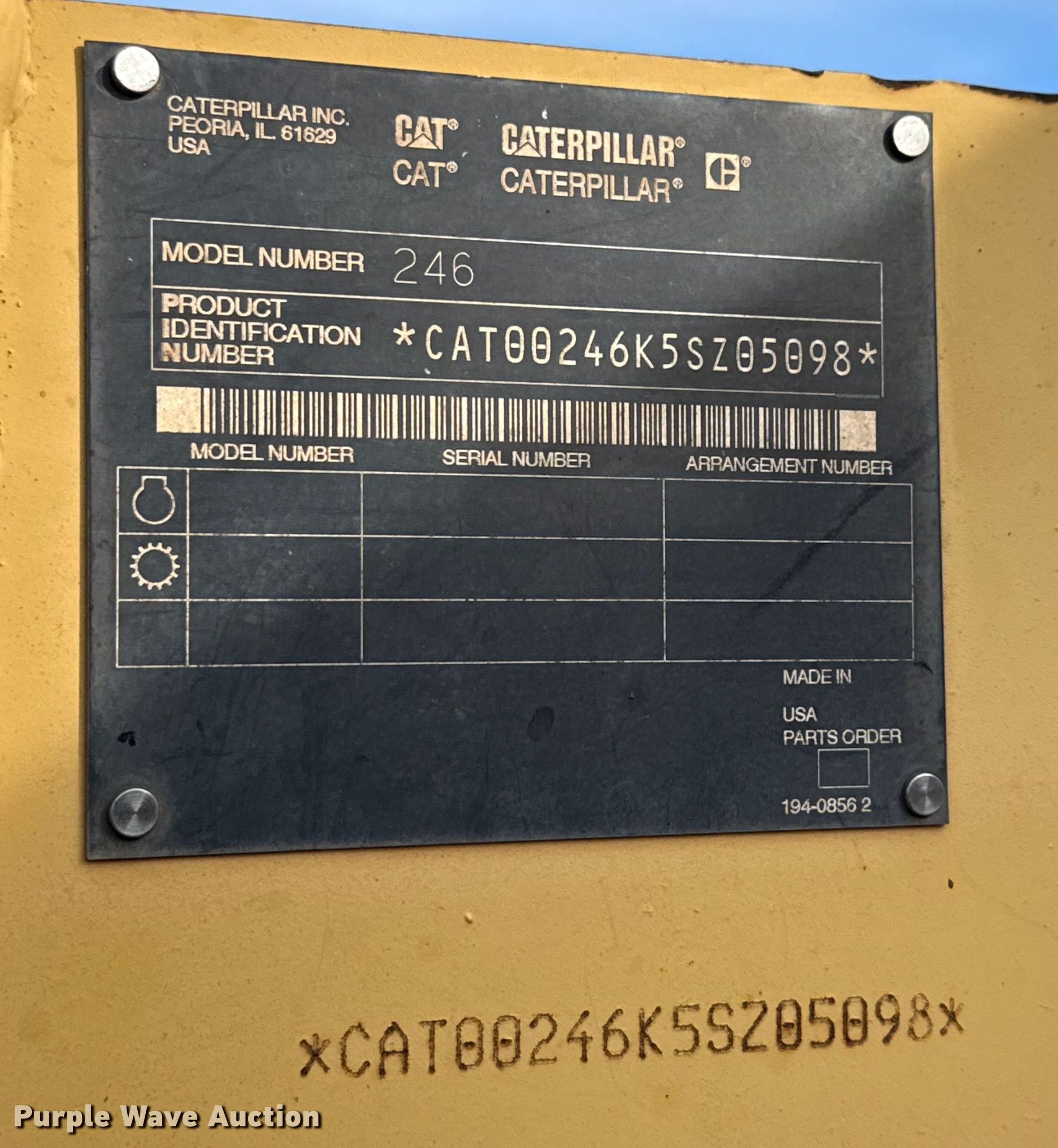 Purple Wave is selling a used Skid Steer Loader in Oklahoma. This item is a 2002 Caterpillar 246 skid steer loader with the following: Hours: Unknown, Serial: CAT00246K5SZ05098