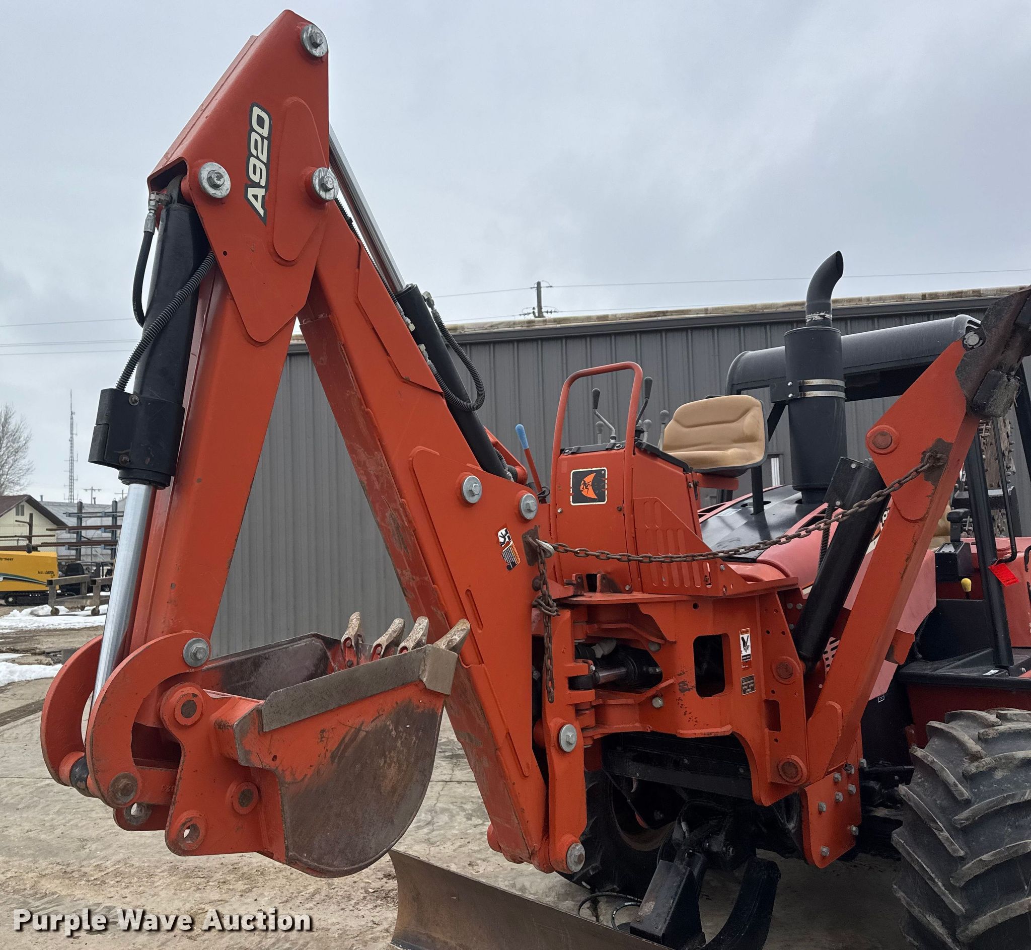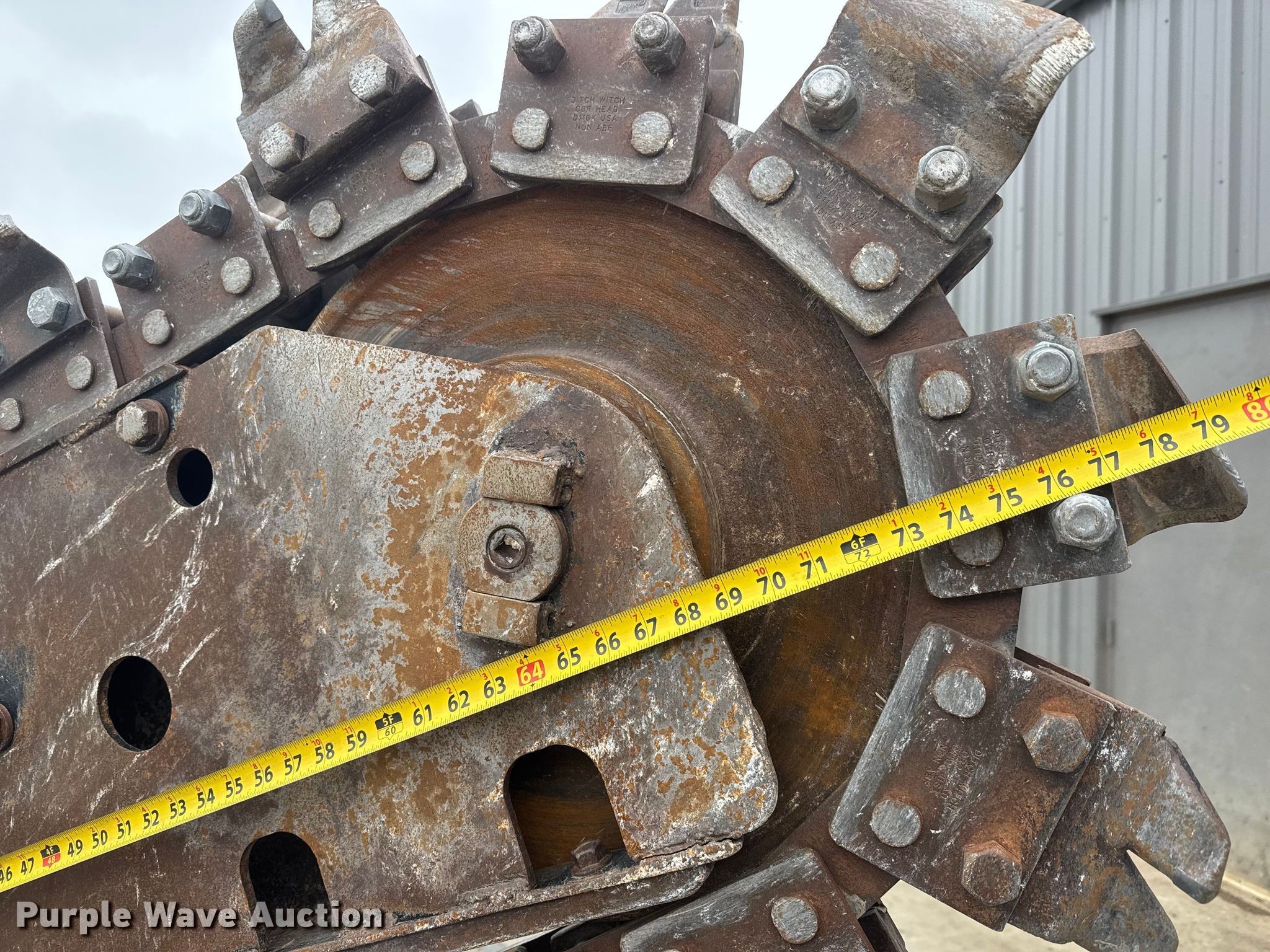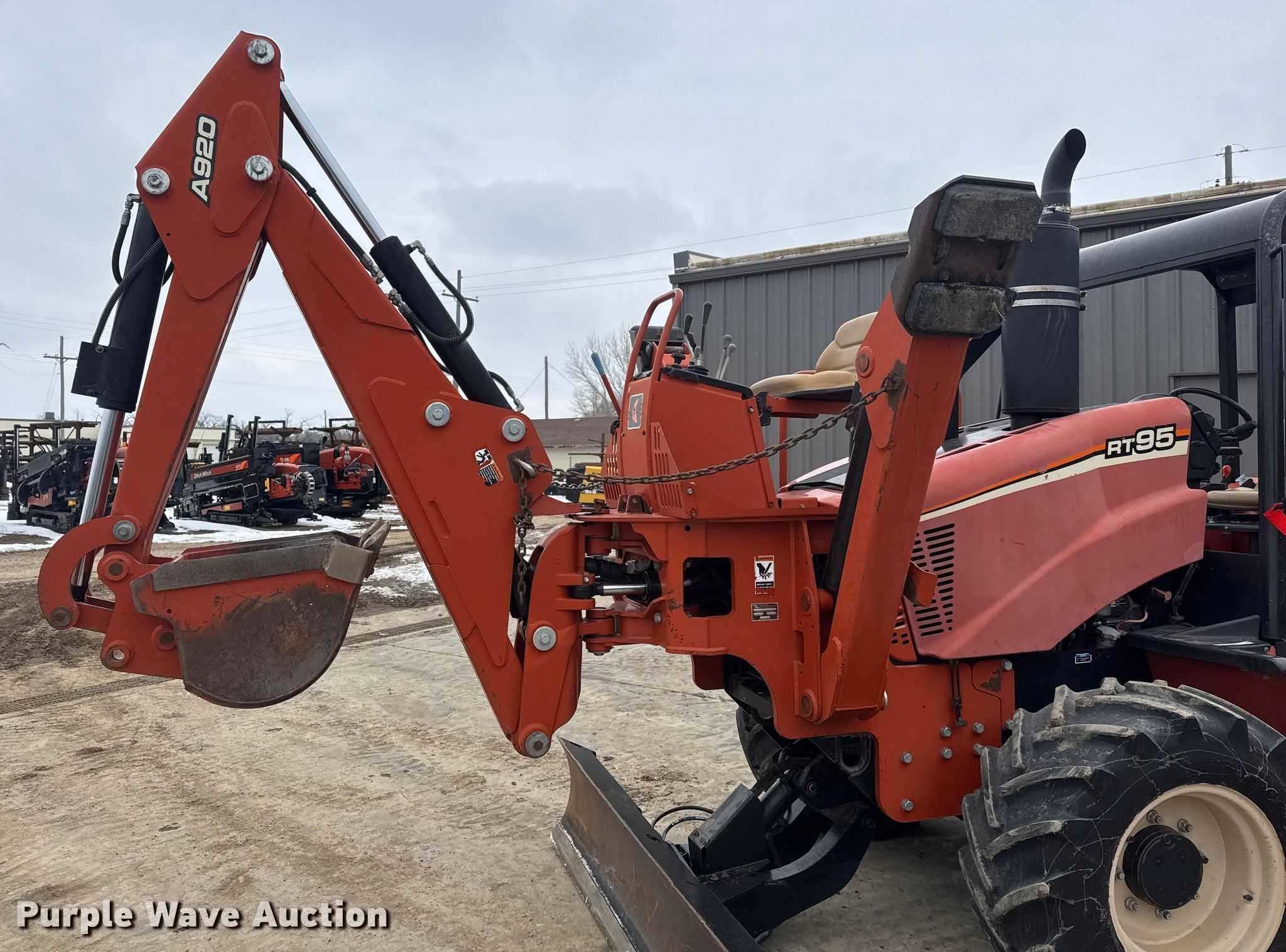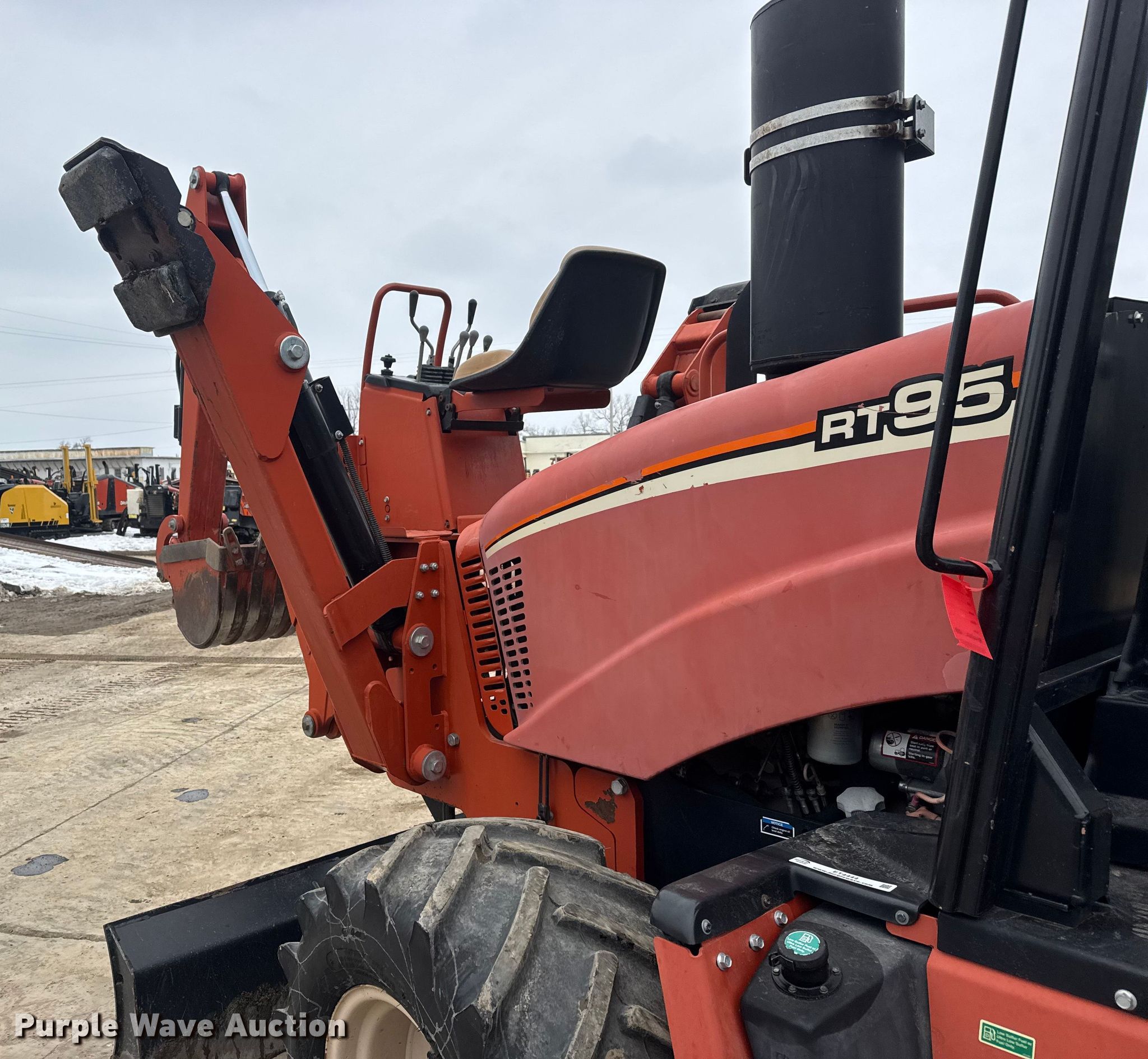 2013 Ditch Witch RT95 trencher. Hours: 958 on meter, Serial: CMWRT95MAD0000456, Unit #: 9400-122. Engine John Deere 4045HF280, Serial: PE4045L224296, Displacement: 4.5L, Cylinders: 4, Fuel type: Diesel. Transmission Hydrostatic. Chassis Four wheel drive, Differential lock, Four wheel steer, Tilt undercarriage. Operators station OROPS. Features Trencher Model: M910, Serial: CMWM910XVD0000516, Estimated dig depth: 72", Cutting width: 6", Teeth: Dirt, Backhoe Model: A920, Serial: CMWA920XH70000159, Backfill blade Width: 80". Tires Size: 38x18.00-20. Source HDD, LLC. Hutchinson, KS 67501