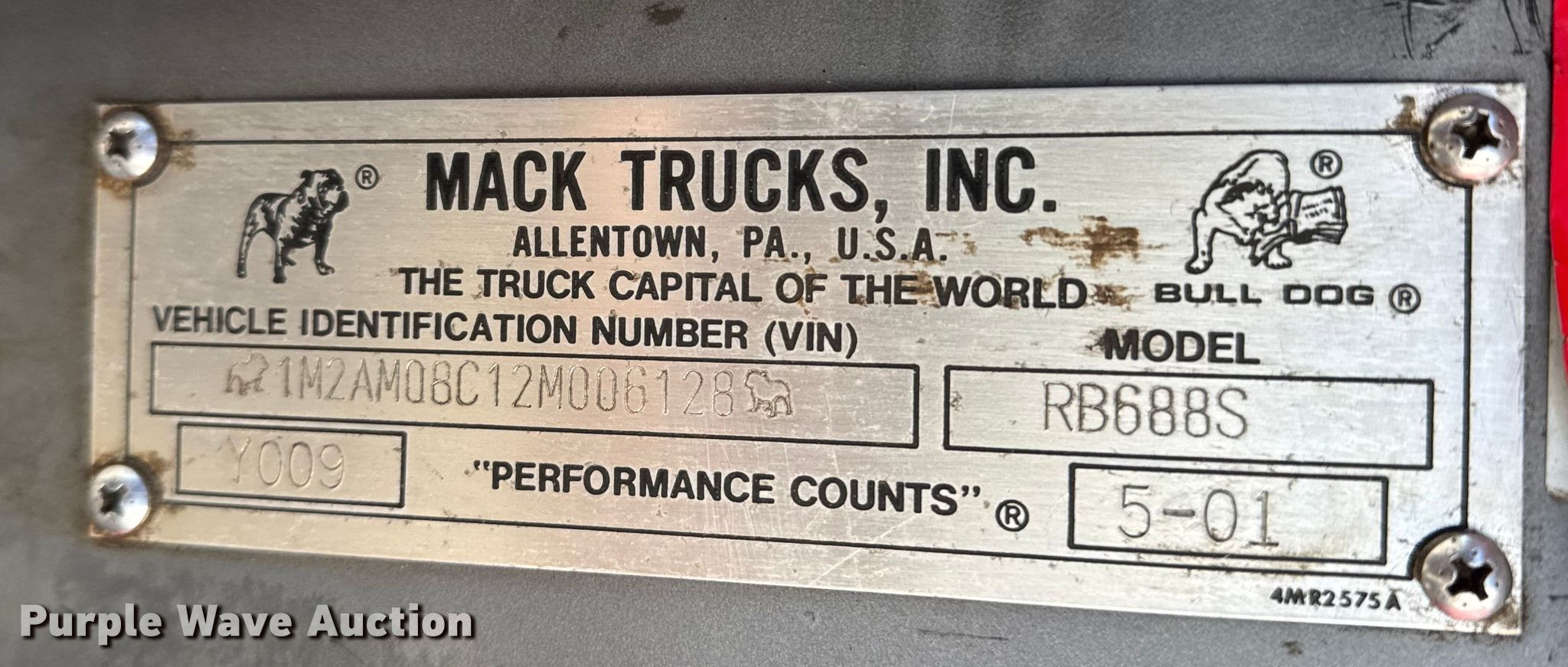 Take a look at this used 2002 Mack RB688S hydrovac truck being sold on March 12th, 2026 in the Thursday March 12 Construction Equipment Auction made by Mack. Take a look at all of the item information below or take a look at similar auctions for Construction Trucks.
