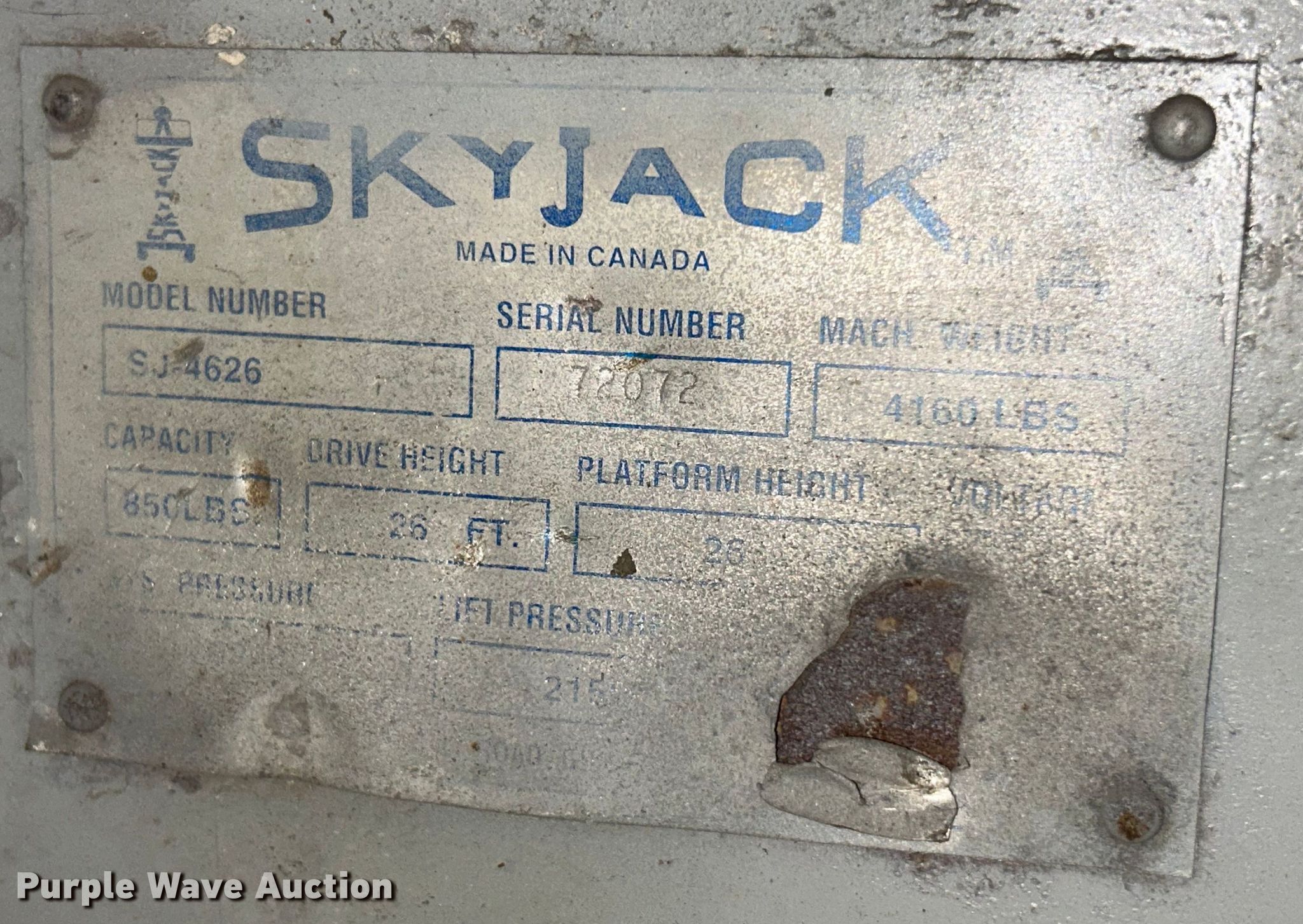 Skyjack SJ4626 scissor lift. Hours: 491 on meter, Serial: 72072. Electric Motor Volts: 24. Features Maximum lift capacity: 850 lbs, Maximum lift height: 26', Platform: 85" L x 43" W, Controls: Platform, Ground, Platform extensions: Manual. Tires Tire size: 4.00x8, Solid. Motor Service, Inc.. Hazelwood, MO 63042