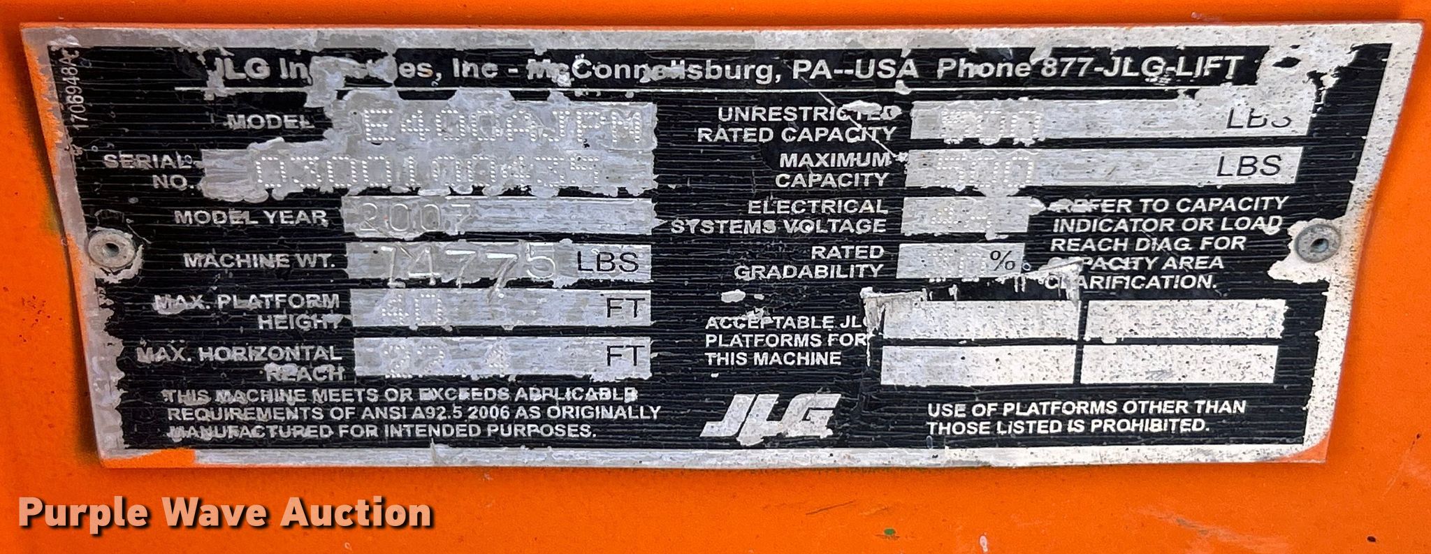 Purple Wave is selling a used Boom Lift in Missouri. This item is a 2007 JLG E400AJP Narrow boom lift with the following: Hours: 463 on meter, Serial: 0300100435