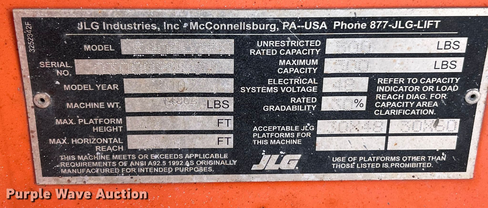 2007 JLG E400AJP Narrow boom lift. Hours: 1,396 on meter, Serial: 0300099852. Electric Motor Volts: 48. Features Boom type: Articulating, Telescopic, Maximum lift capacity: 500 lbs, Maximum reach length: 22', Maximum lift height: 40', Hydraulic extendable jib, Hydraulic leveling, Platform: 30" L x 48" W, AC power outlet, Controls: Platform, Ground, Platform rotation: Hydraulic. Tires Front: 25x7-12, Rear: 22x6x17 3/4, Solid. This is worksite support equipment and will not come with a title. Transfer of ownership documentation will be a bill of sale. Rental Supply District 1, LLC. O'Fallon, MO 63366