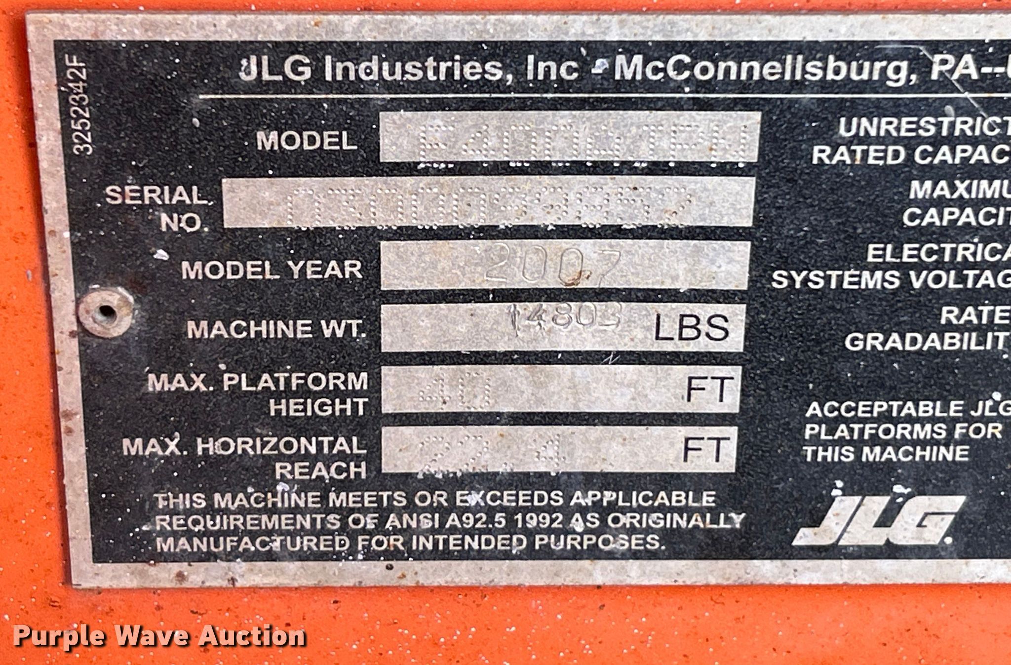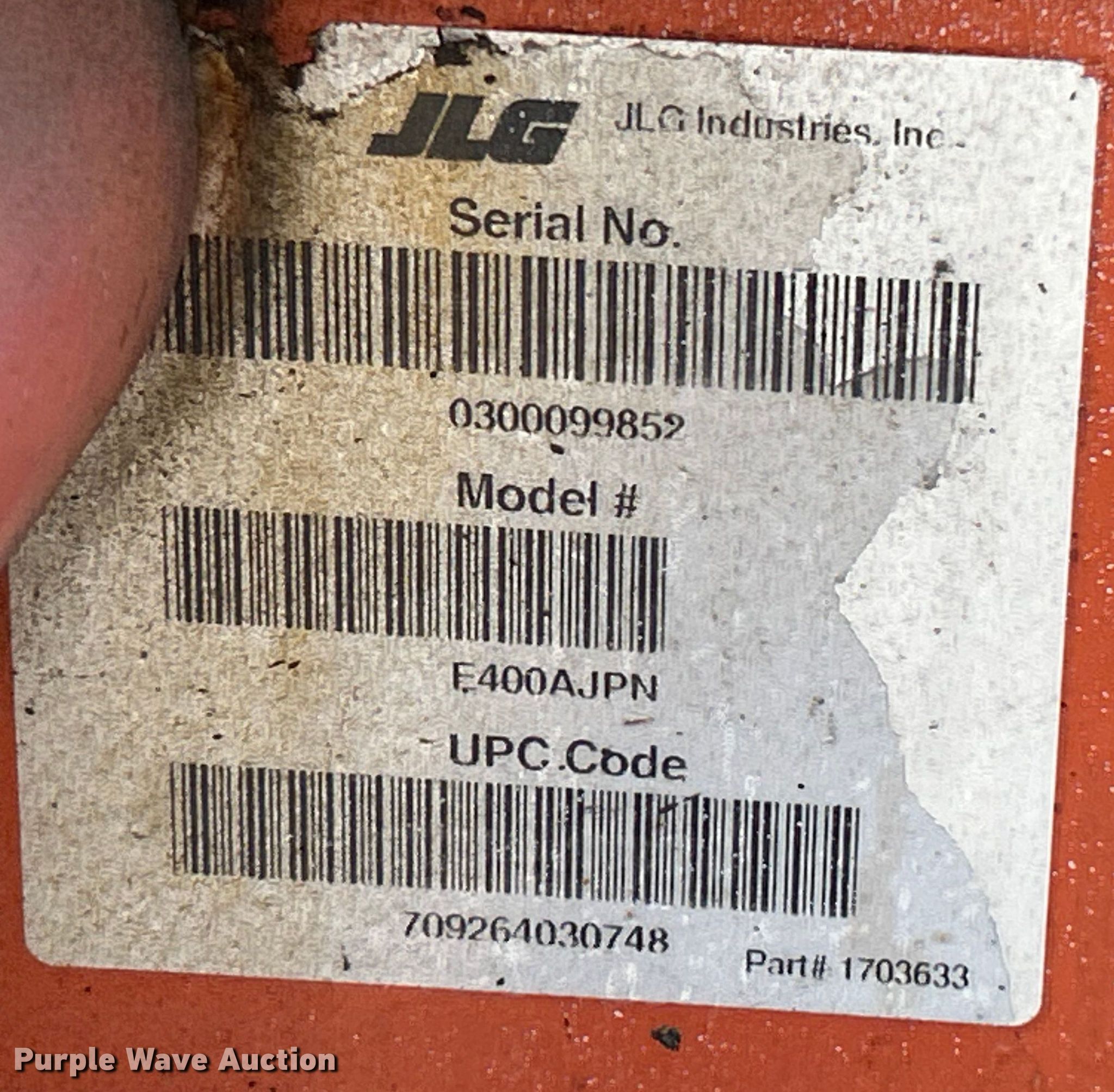 Purple Wave is selling a used Boom Lift in Missouri. This item is a 2007 JLG E400AJP Narrow boom lift with the following: Hours: 1,396 on meter, Serial: 0300099852