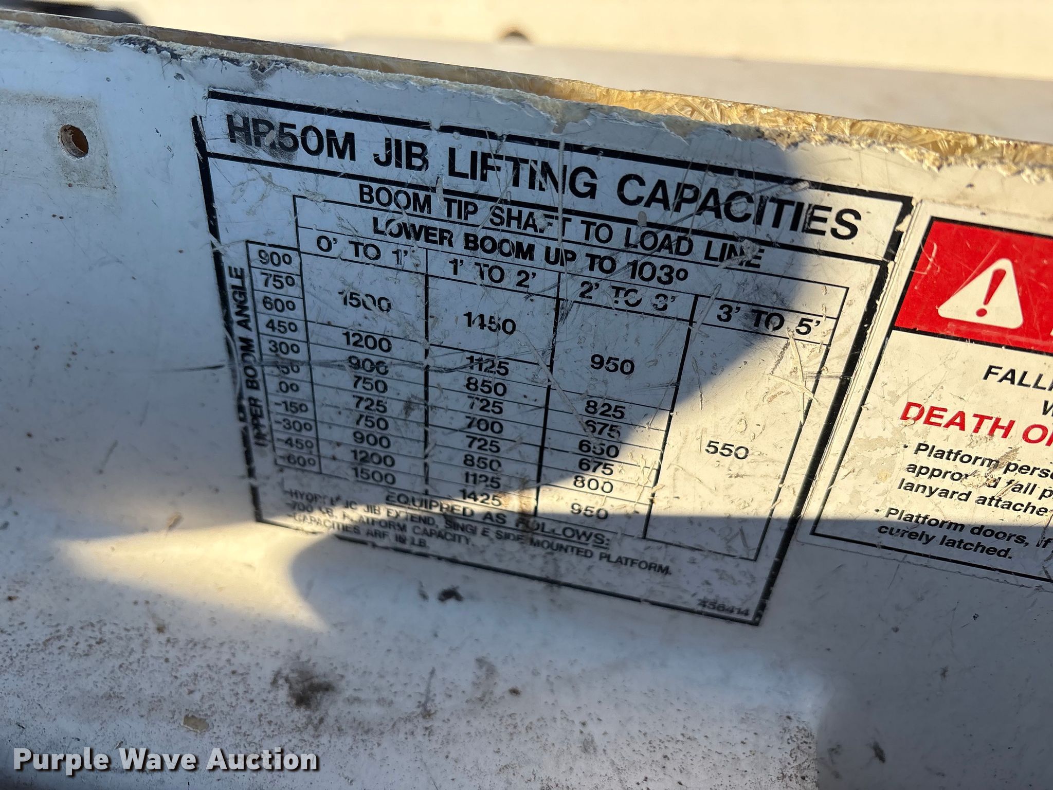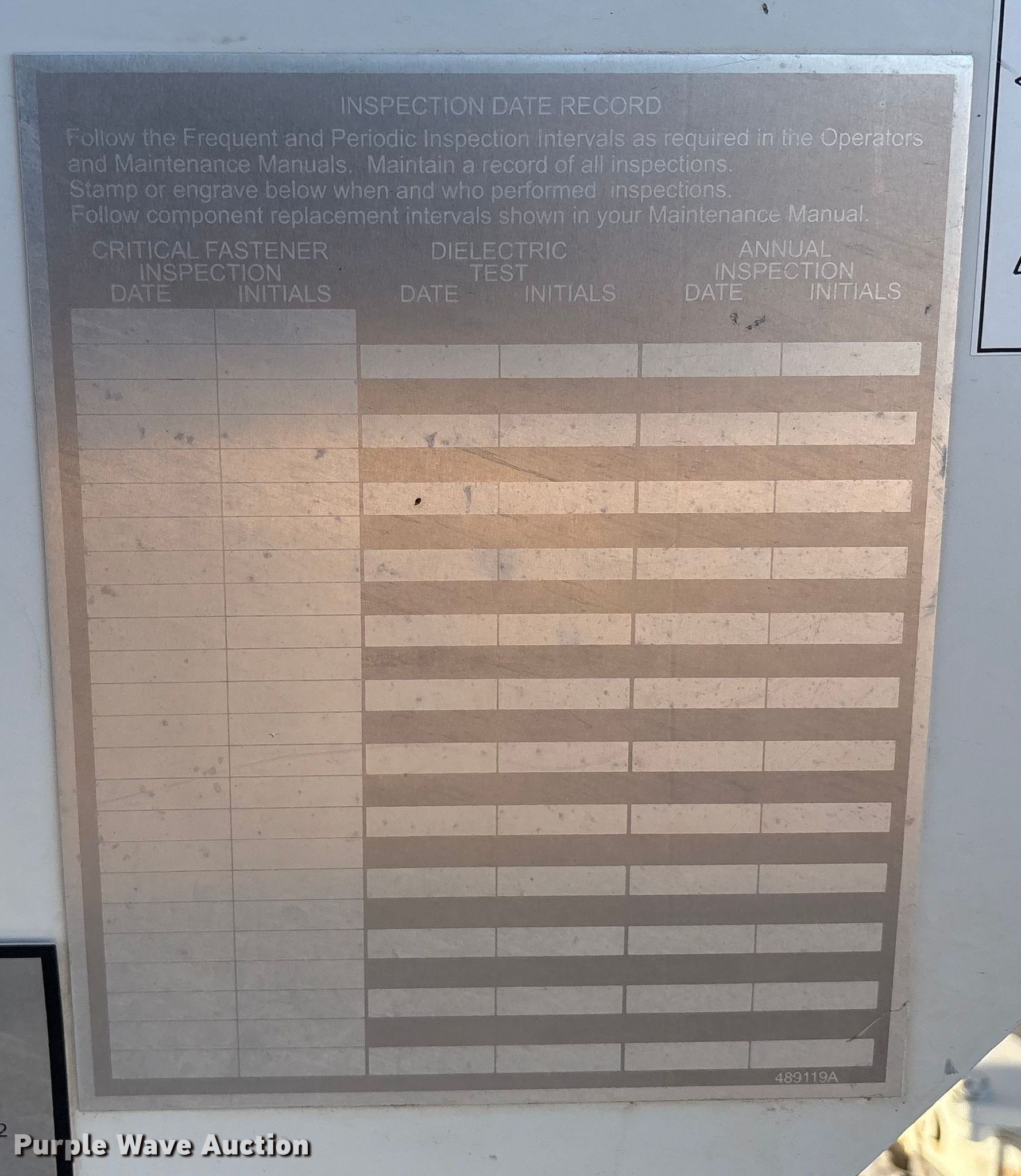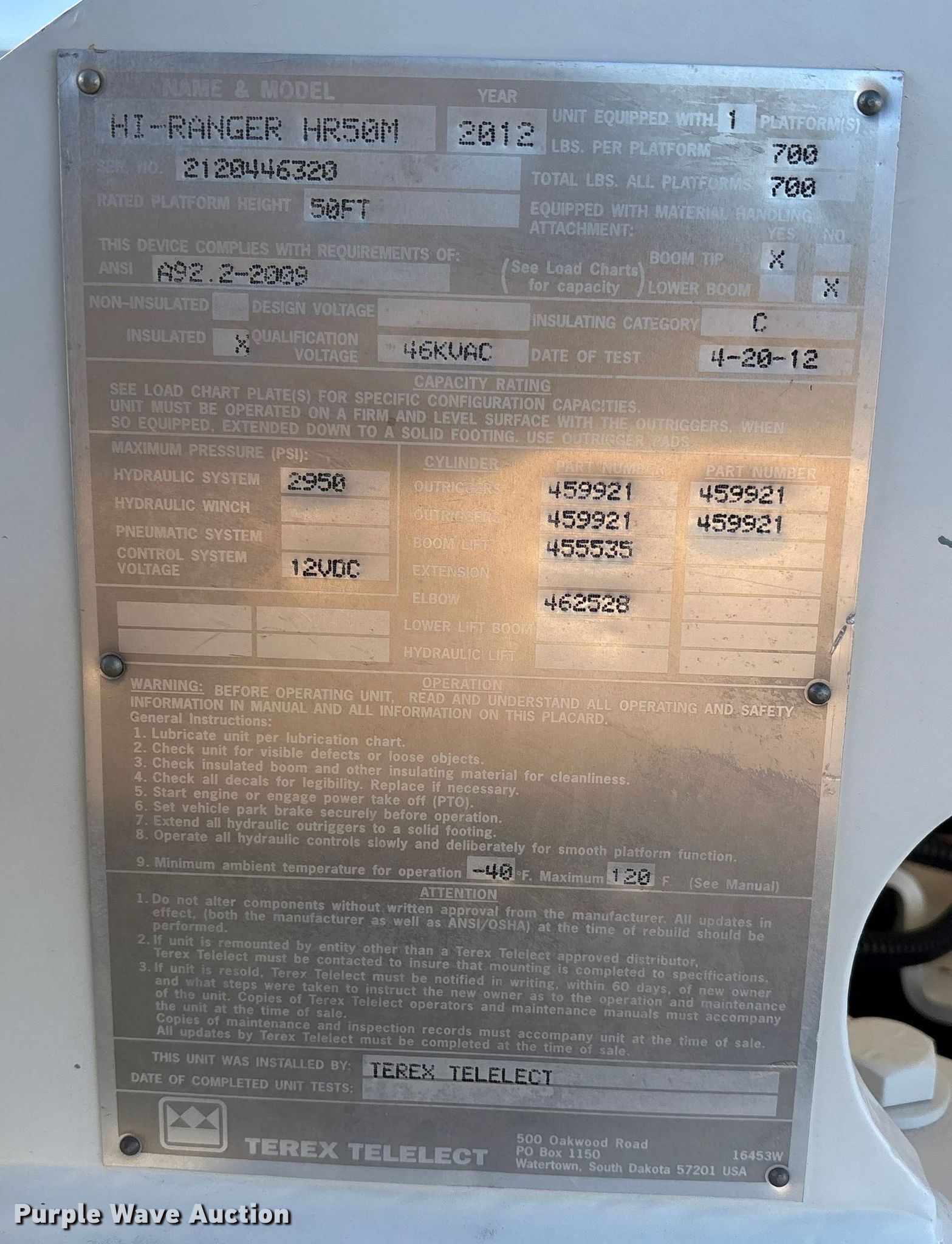 2013 International 4400 SBA bucket truck. Miles: 168,296 on odometer, Hours: 13,052 on meter, VIN: 3HAMKAAN6DL114648. Engine Maxxforce DT, Displacement: 7.64L, Cylinders: 6, Fuel type: Diesel. Transmission Automatic. Chassis Axles: Single, Single axle differential lock, Suspension: Spring, Brakes: Air. Interior AC, Heat, Cruise control, Auxiliary controls. Features Bed Utility bed, BG Bodies, Serial: 19194, Length: 15' 7", Width: 7' 11", Height: 12' 3", Boom 2012 Terex HI RANGER HR50M, Serial: 2122446320, Maximum lift capacity: 700 lbs, Maximum lift height: 50', Boom type: Articulating, Insulated, Man basket, Boom controls Lower, Basket.. Tires Size: 11R22.5. Notes Windshield chipped or cracked. Texas title. Title distribution may be delayed up to 14 days from verification of funds. Lighthouse Electric Cooperative, Inc.. Floydada, TX 79235