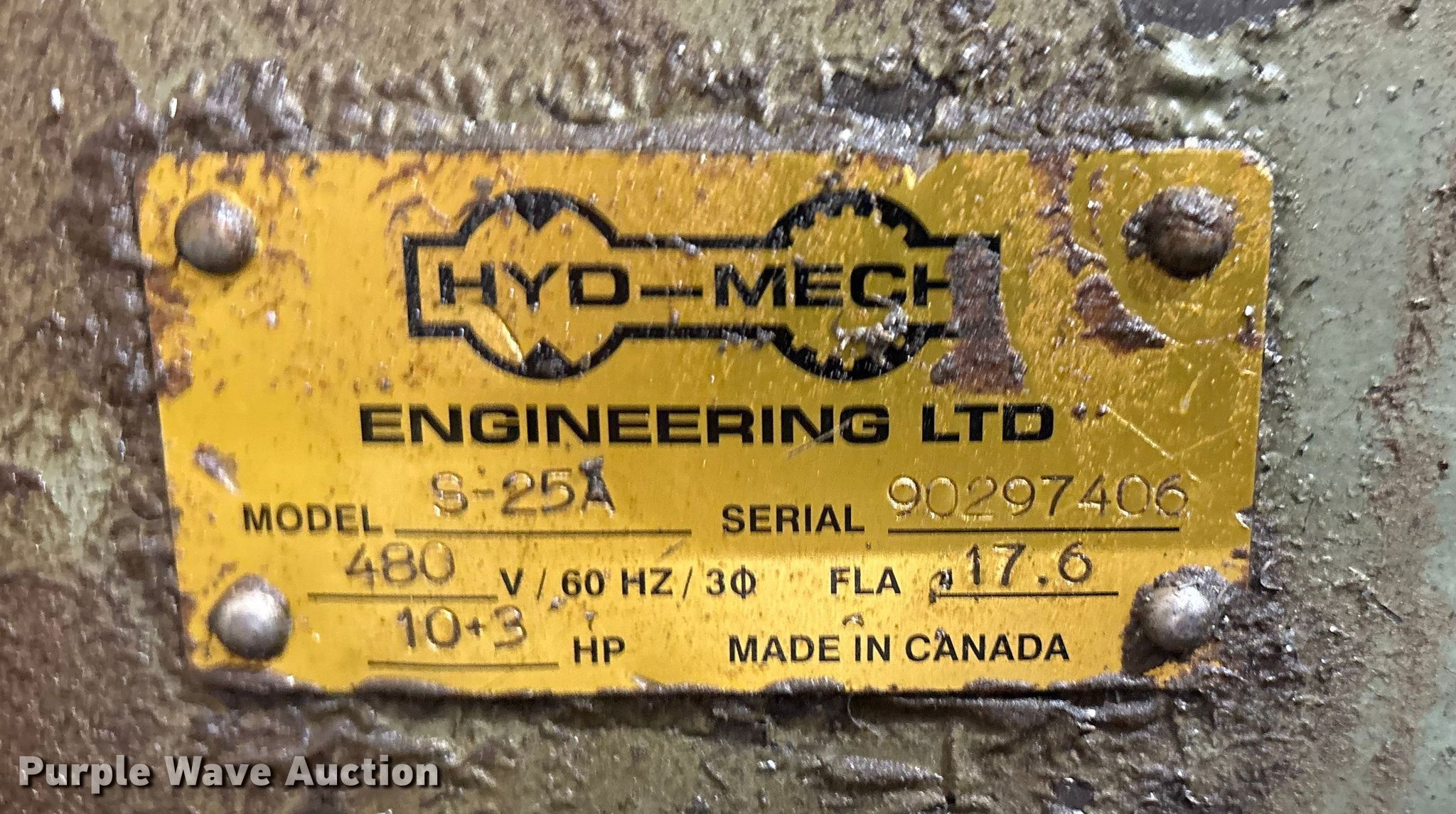 Hyd-Mech S-25A Band saw. Serial: 90297406. Dimensions Overall Length: 12' 3", Width: 10', Height: 8' 5". Electric Motor HP: 10, Volts: 480, Phase: Three. Notes Roller beds not included, Owners manual. Hargrave Manufacturing. Slaton, TX 79364