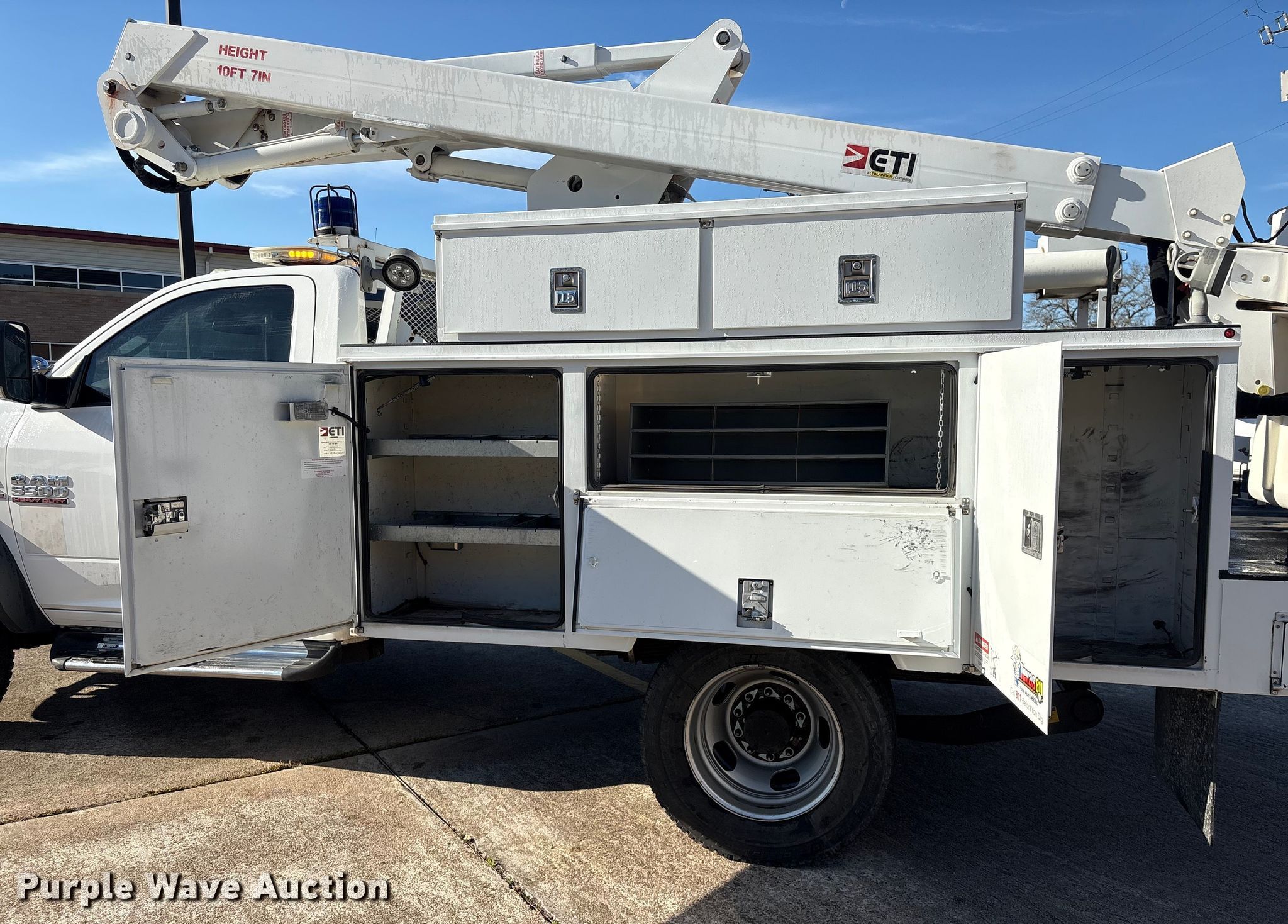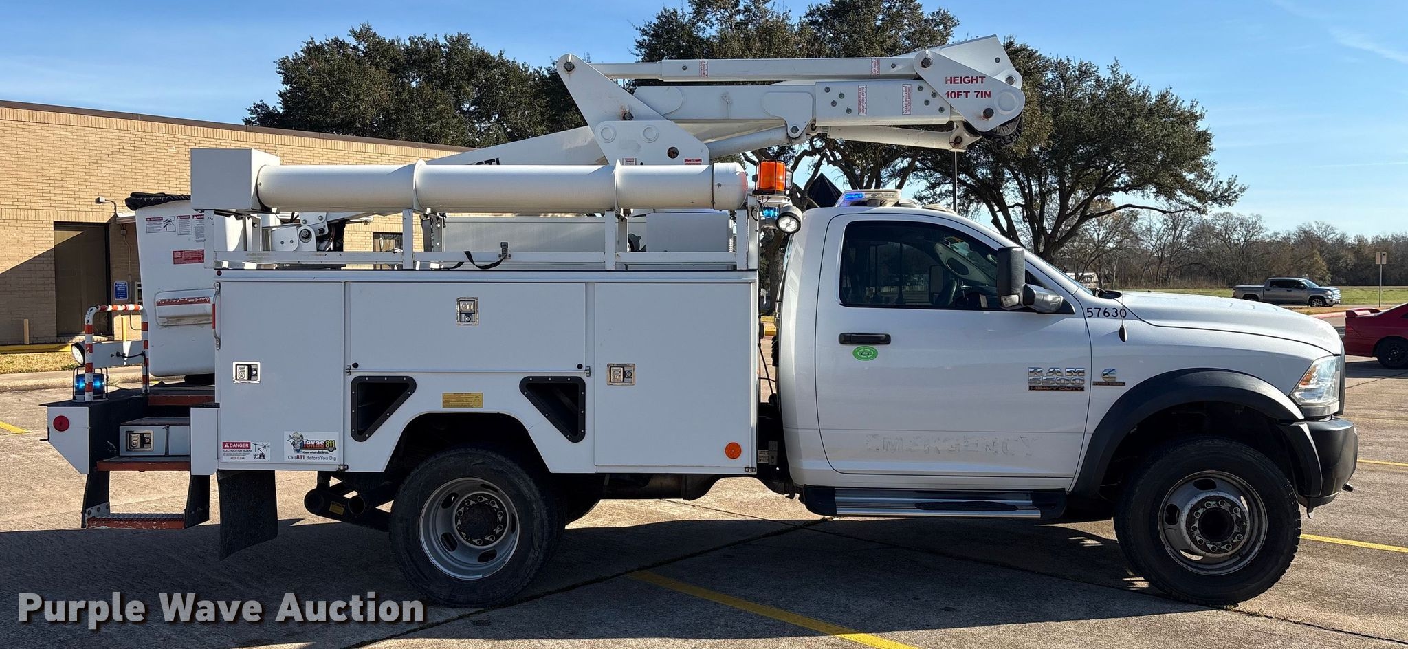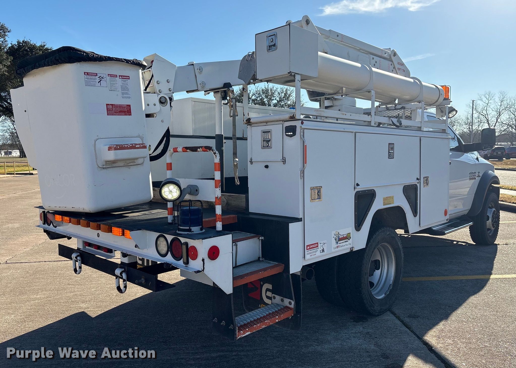Purple Wave is selling a used Bucket Truck in Texas. This item is a 2017 RAM 5500 bucket truck with the following: Miles: 120,427 on odometer, Hours: 219 on meter, VIN: 3C7WRNAL2HG727785