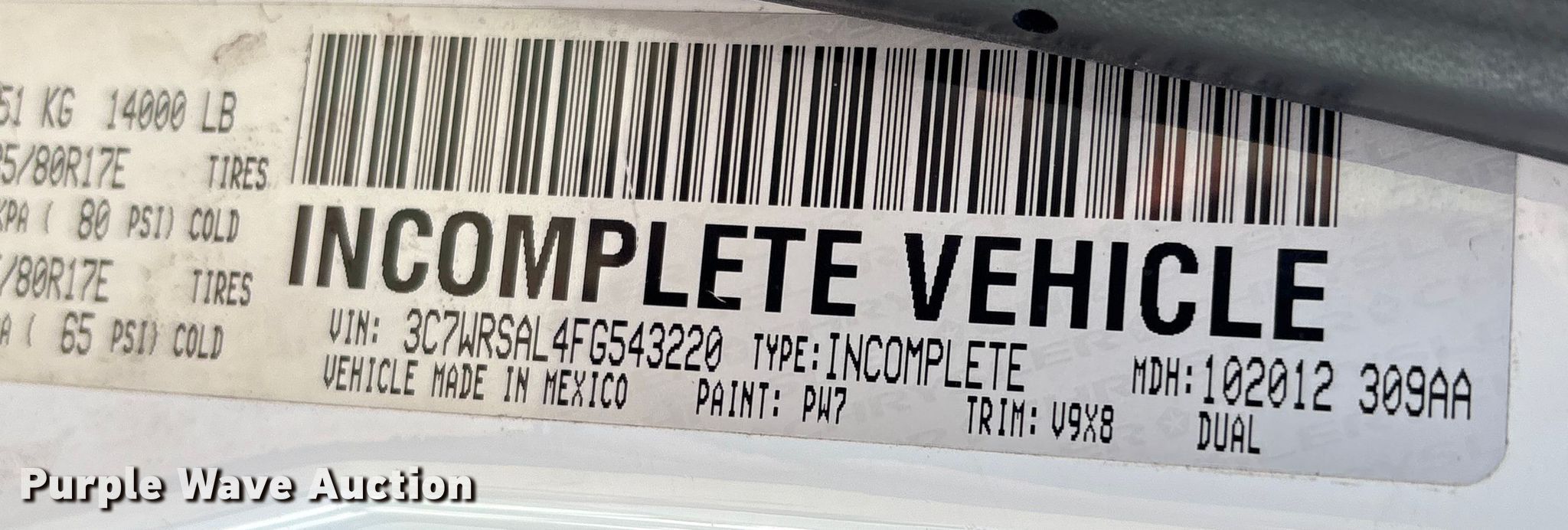 Purple Wave is selling a used Bucket Truck in Texas. This item is a 2015 RAM 3500 bucket truck with the following: Miles: 109,731 on odometer, Hours: 3,655 on meter, VIN: 3C7WRSAL4FG543220