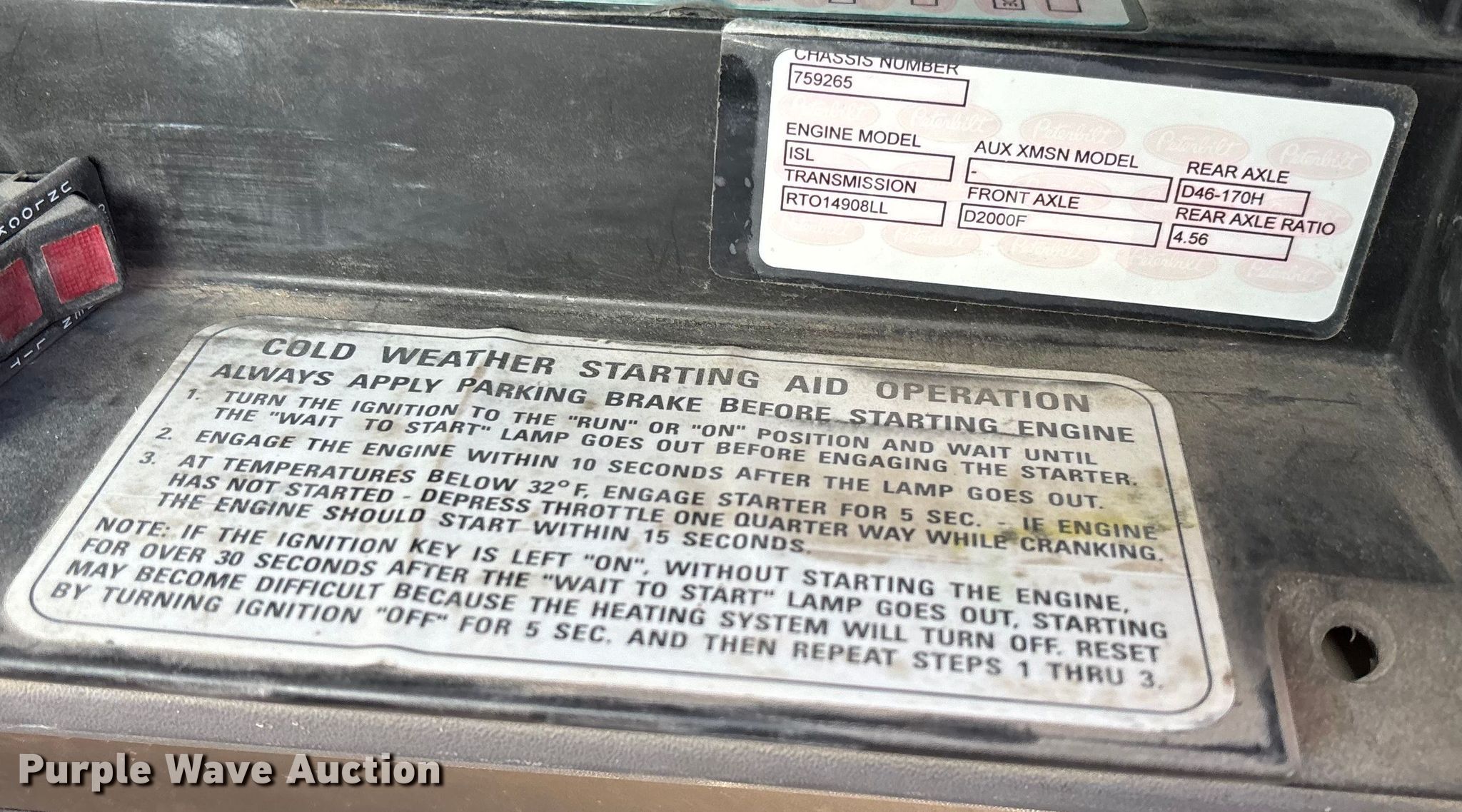 2008 Peterbilt 365 ready mix truck. Miles: 158,756 on odometer, Hours: 18,205 on meter, VIN: 1NPSL50X58D759265. Engine Cummins ISL, Displacement: 8.9L, Cylinders: 6, Fuel type: Diesel. Transmission Eaton Fuller 8LL, Manual, Speed: 10. Chassis Axles: Tandem, Differential lock: Full, Suspension: Spring over walking beam, Brakes: Air, Front mount PTO, GVWR: 66,000 lbs FAWR: 20,000 lbs, IAWR: 23,000 lbs, RAWR: 23,000 lbs, Wheelbase: 225". Interior AC, Heat, Power windows, Cruise control. Features Mixer 2007 Continental, Serial: 0B603700322, Capacity: 10.5 cu.yd., Discharge: Rear, In-cab controls, Rear drum controls, Water tank capacity: 125 gallons, Chute Extensions: 3, Chute type: Steel.. Tires Front: 425/65R22.5, Rear: 11R22.5. Notes Non-operational window controls, PTO leak, Oil leak. Missouri title. Title distribution may be delayed up to 14 days from verification of funds. Bolivar Ready Mix. Bolivar, MO 65613