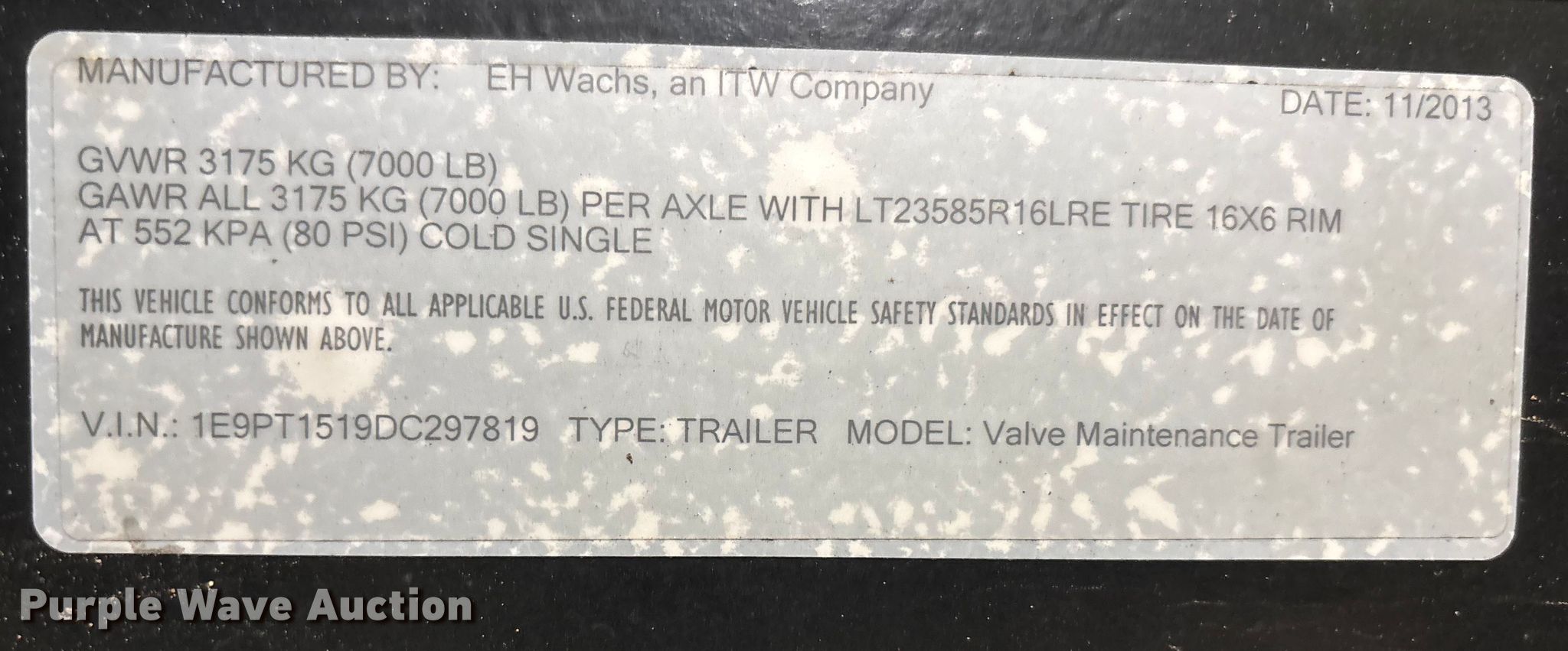 2013 Wachs valve exerciser. Hours: 157 on meter, VIN: 1E9PT1519DC297819. Engine Caterpillar C1.1, Displacement: 1.131L, Cylinders: 3, Fuel type: Diesel. Features Spoils tank Dimensions: 3' L x 45" W, Water tank Dimensions: 47" L x 33" W, Water pump General Pump TX1512, Vacuum pump Roots 47 U-RAI DSL, Inlet valve size: 4", Outlet valve size: 4". Trailer 2013 Wachs, 13' L x 7" W, Hitch: Pintle, Suspension: Torsion, Brakes: Electric, Axles: Single, Tire size: 235/85R16, GVWR: 7,000 lbs, GAWR: 7,000 lbs. Notes Jump start required during on-site data collection. Missouri title. Title distribution may be delayed up to 14 days from verification of funds. Ace Pipe Cleaning, Inc.. Kansas City, MO 64120