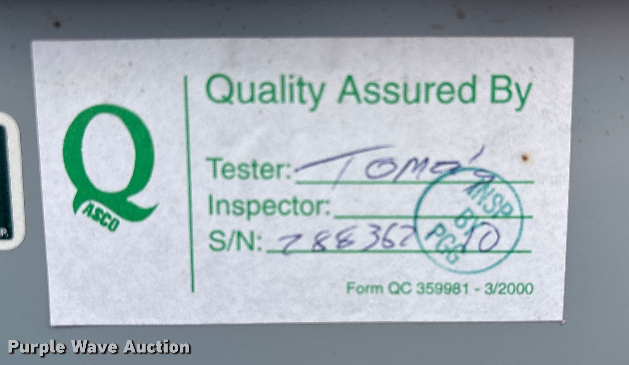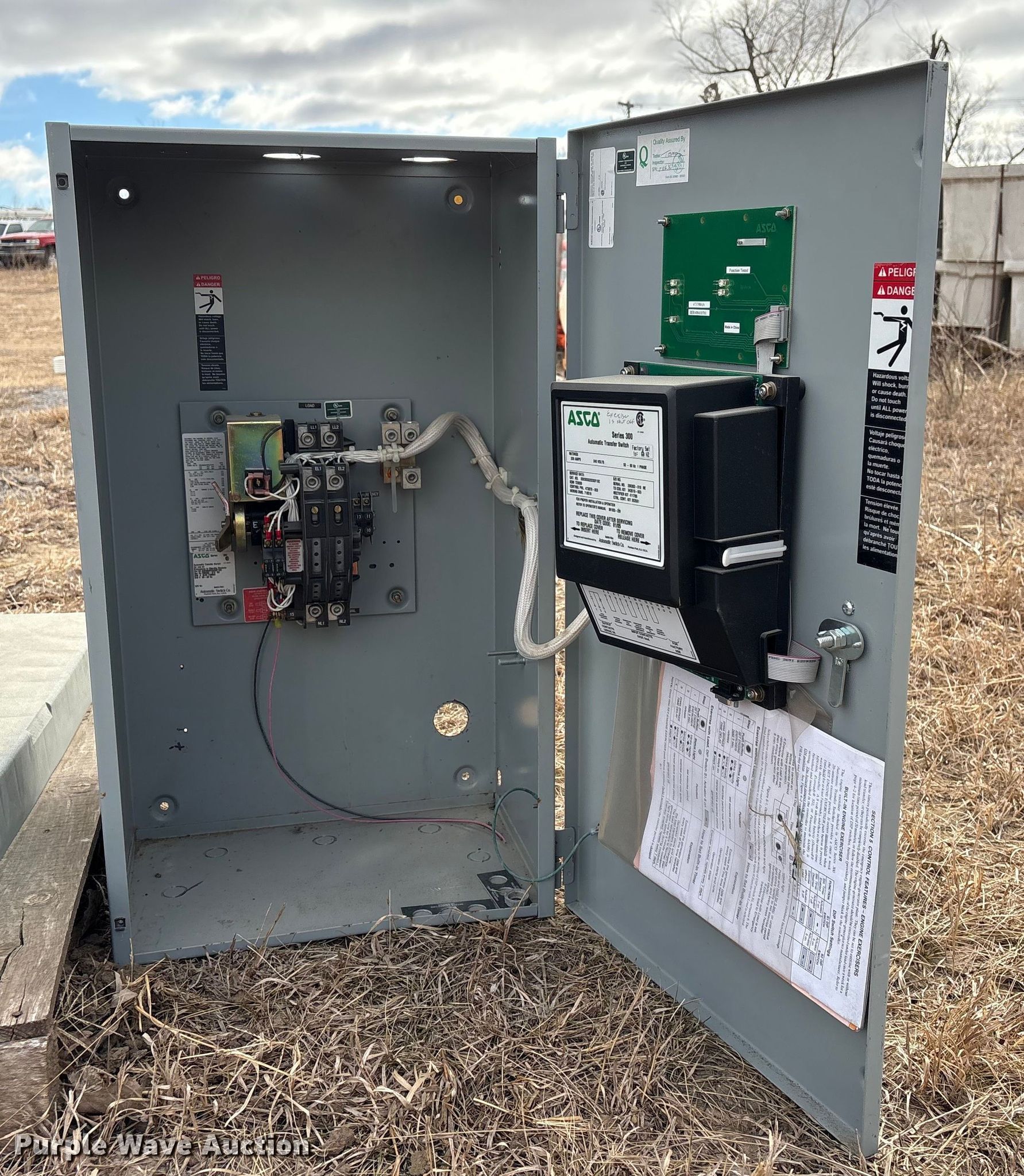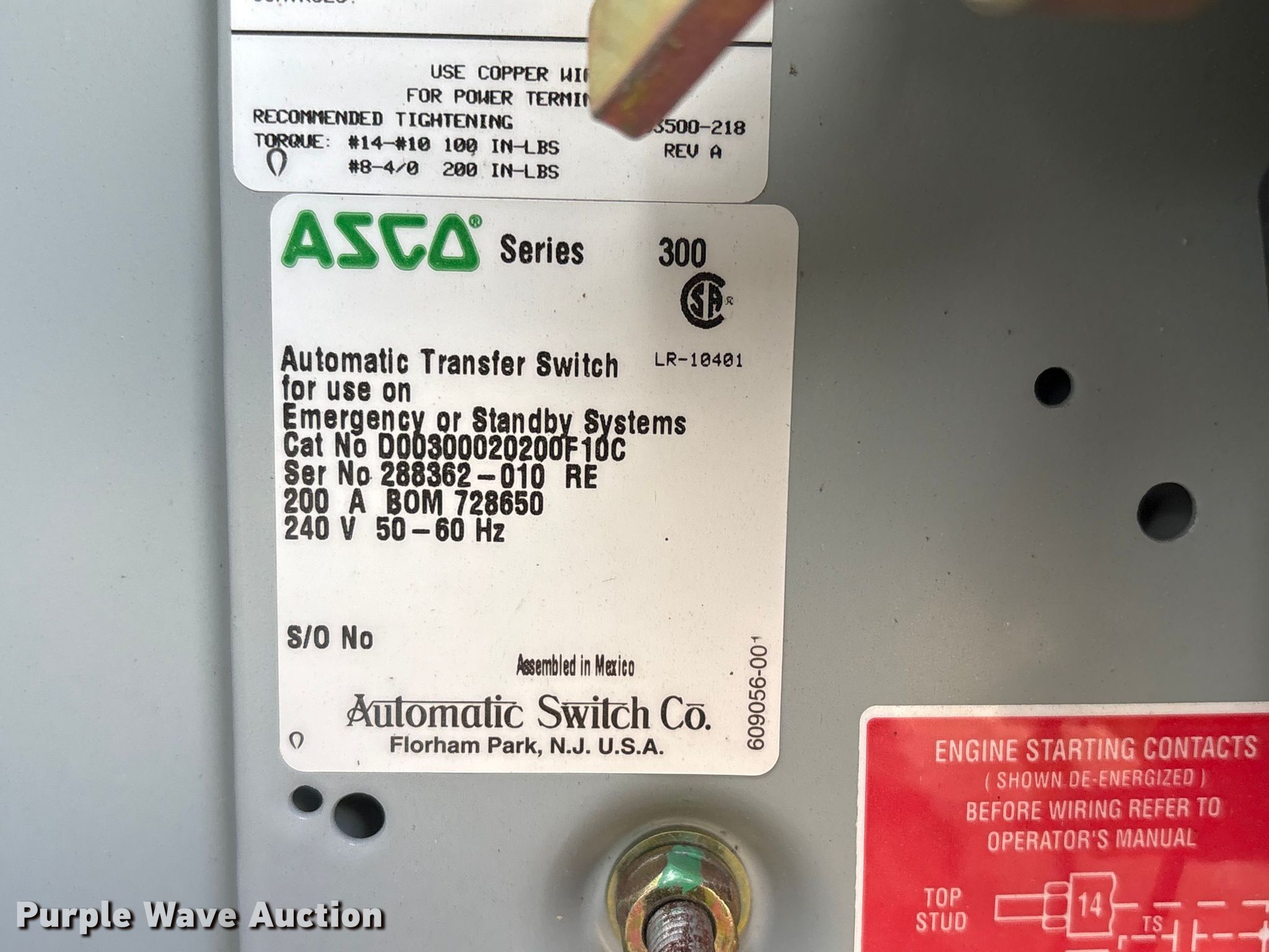 Briggs & Stratton generator. Hours: Unknown. Features Asco Series 300 automatic transfer switch Amps: 200, Volts: 240, Generator: HZ: 50 to 60, Phase: 1, Serial: 288362, 010 RE, Plastic base Size: 36 x 36 x 3. Notes Unknown operating condition , Unkown fuel type. Skywave Wireless Inc... West Point, NE 68788
