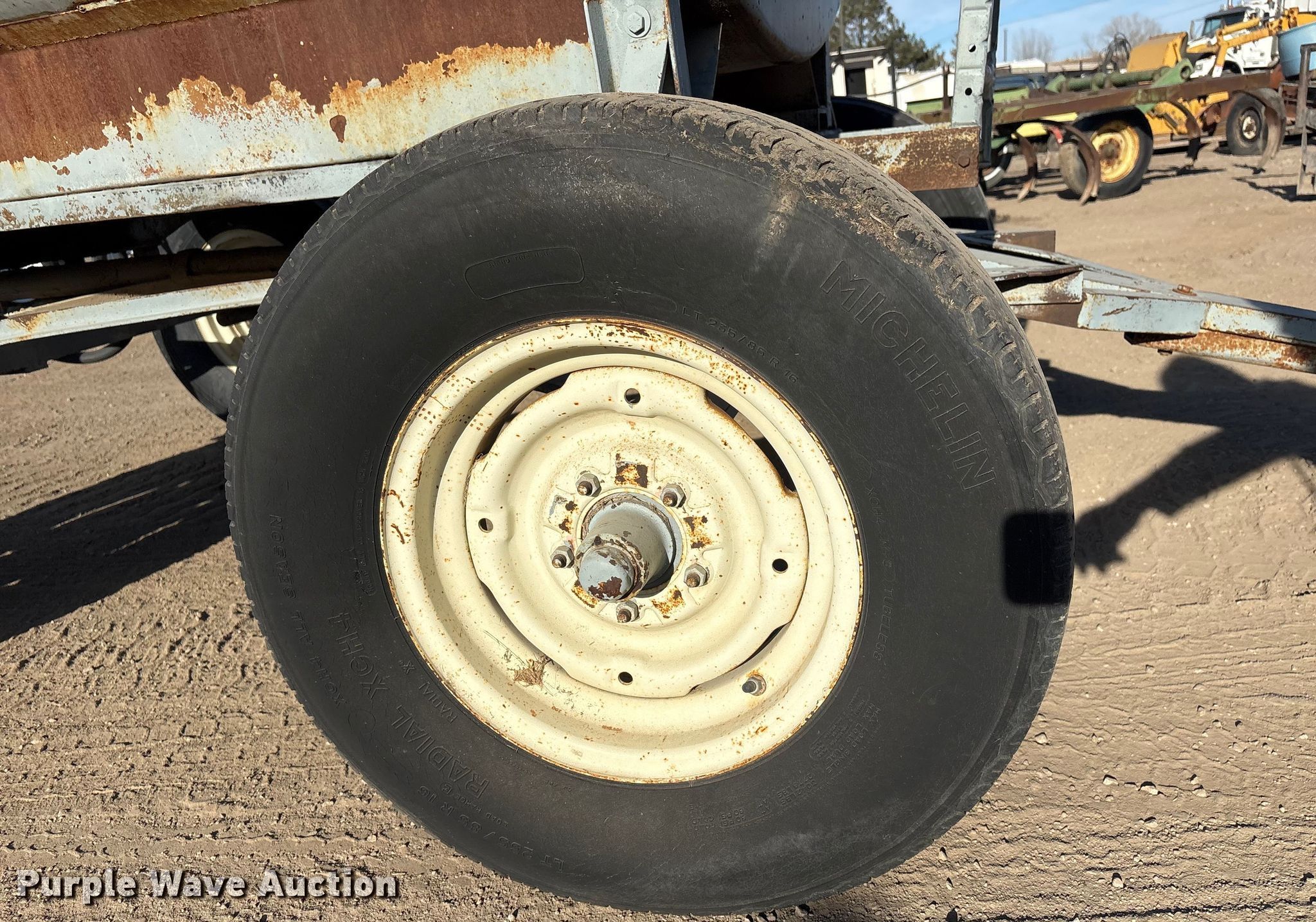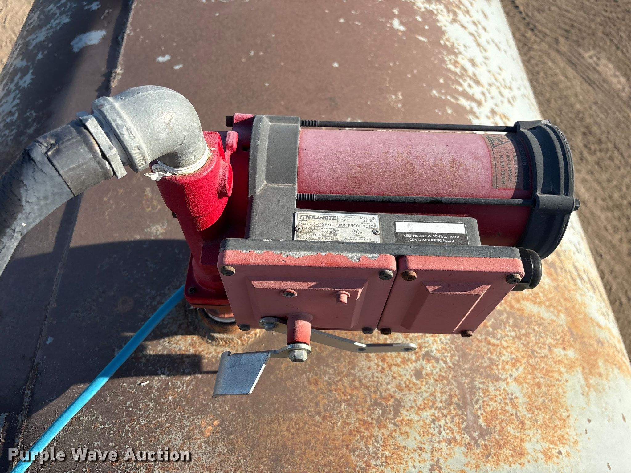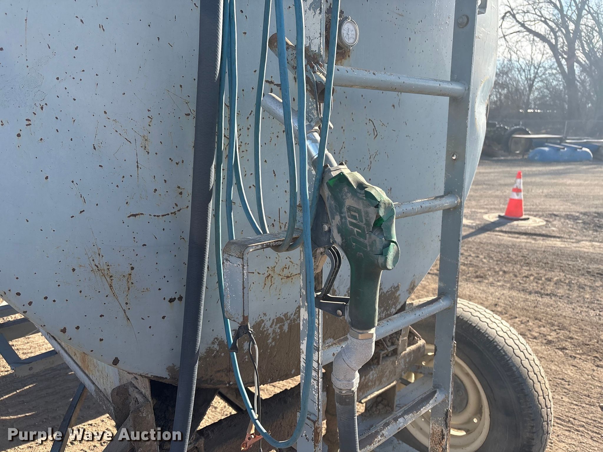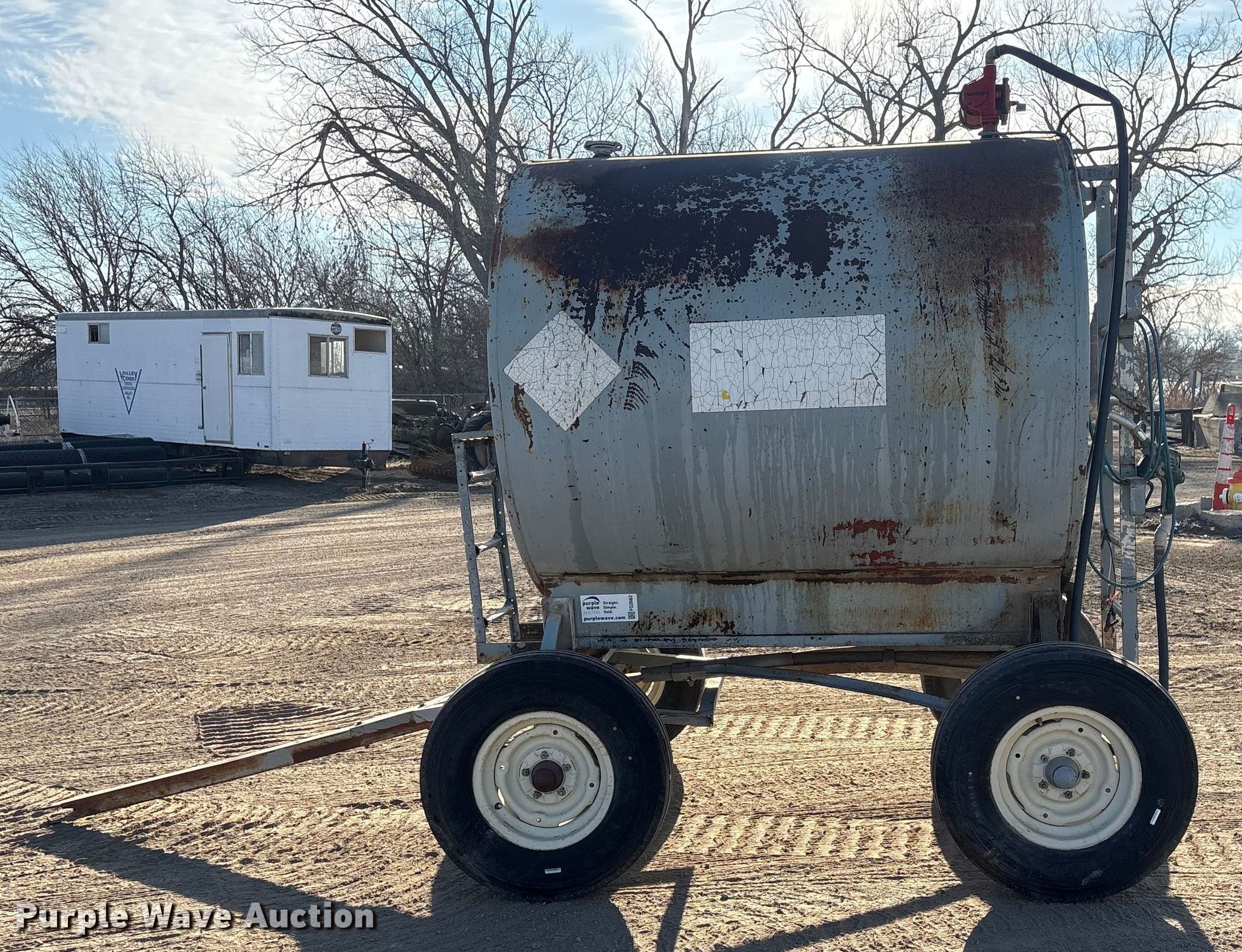 Fuel tank trailer. Dimensions. Overall Length: 14', Width: 75". Features Tank type: Steel Capacity: 1,500 gallons, Pump Model: SA000763-000, Hose, Nozzle. Tires Steel wheels, Size: 235/85R16. Valley, NE 68064