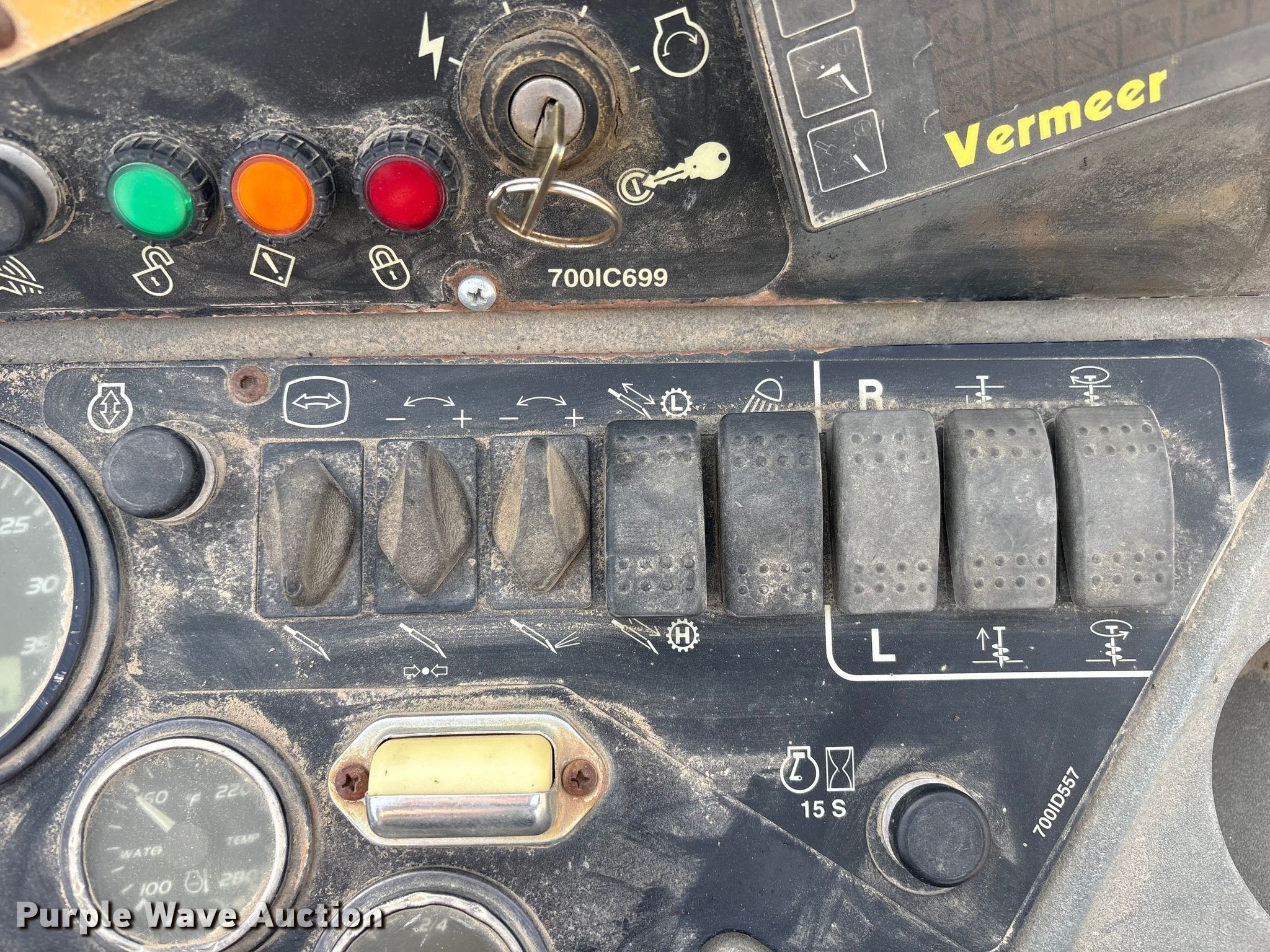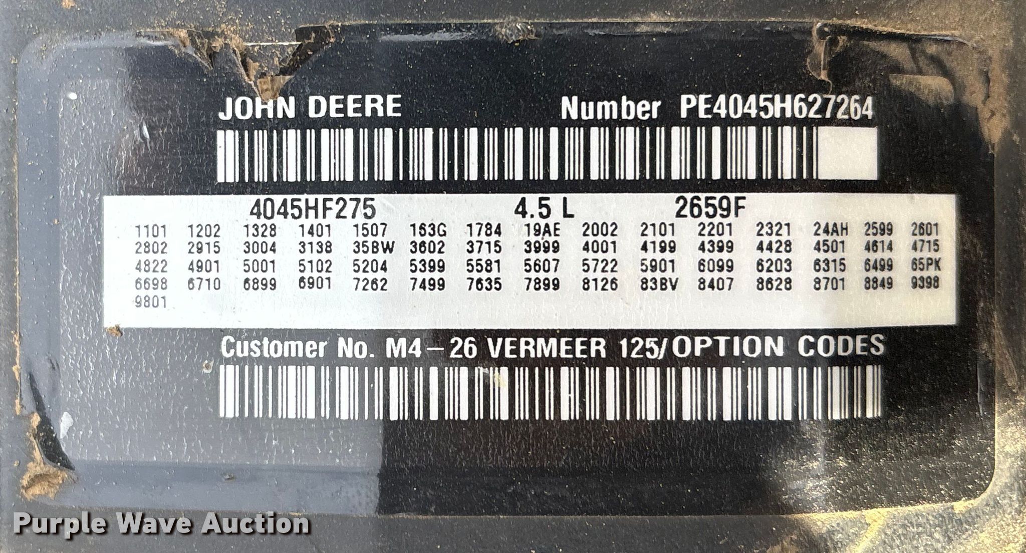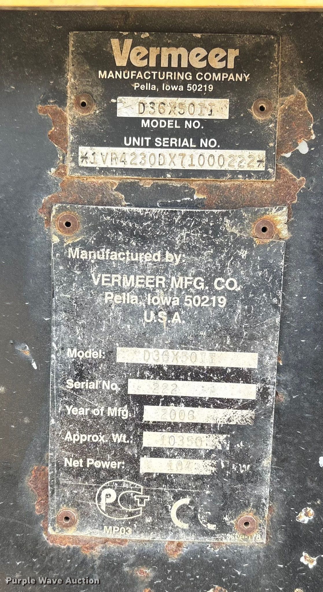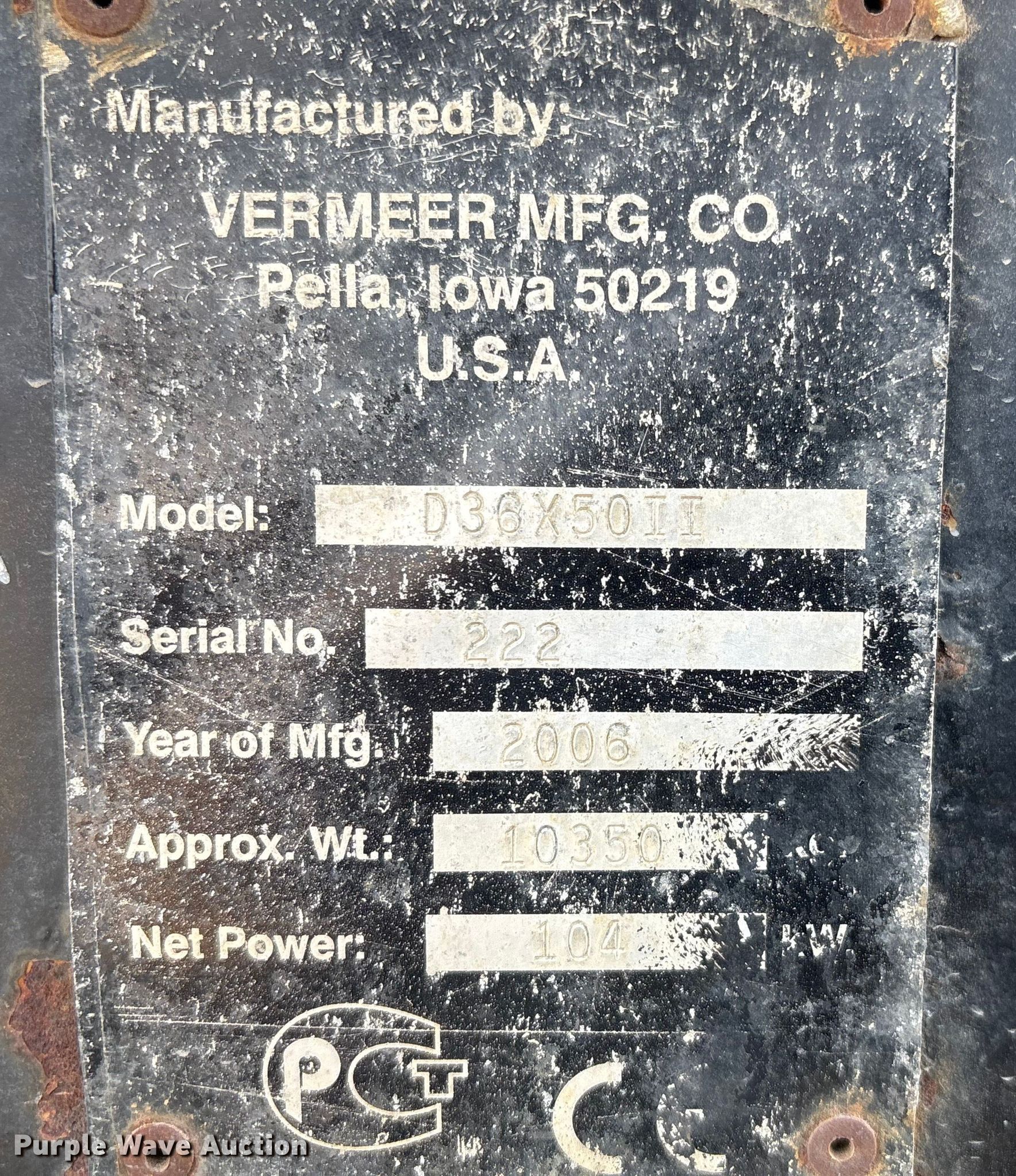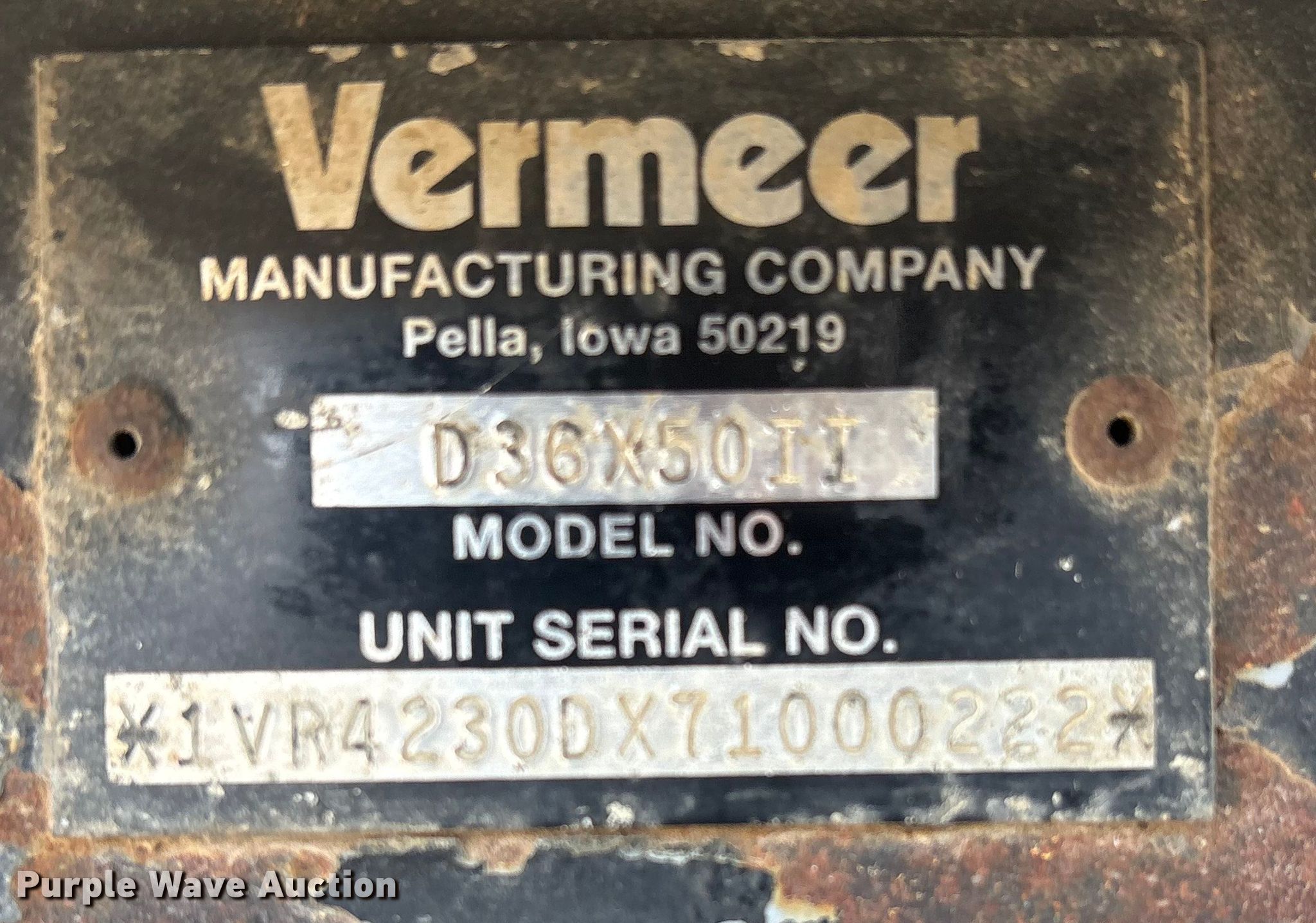 2007 Vermeer D36x50II directional boring unit. Hours: 4,617 on meter, Serial: 1VR4230DX71000222. Engine John Deere 4045HF275, Serial: PE4045H627264, Displacement: 4.5L, Cylinders: 4, Fuel type: Diesel. Features Water pump, On board water capacity: 5 gallons, Drill bit width: 4", Drill stems On drill: 45, Drill stem length: 15', Diameter: 2.375", Rear hydraulic stabilizers, Hydraulic stake down Length: 15', Diameter: 2.375", Unused locking jaws, Unused hydraulic pumps. Tracks Width: 16", Rubber. Valley, NE 68064