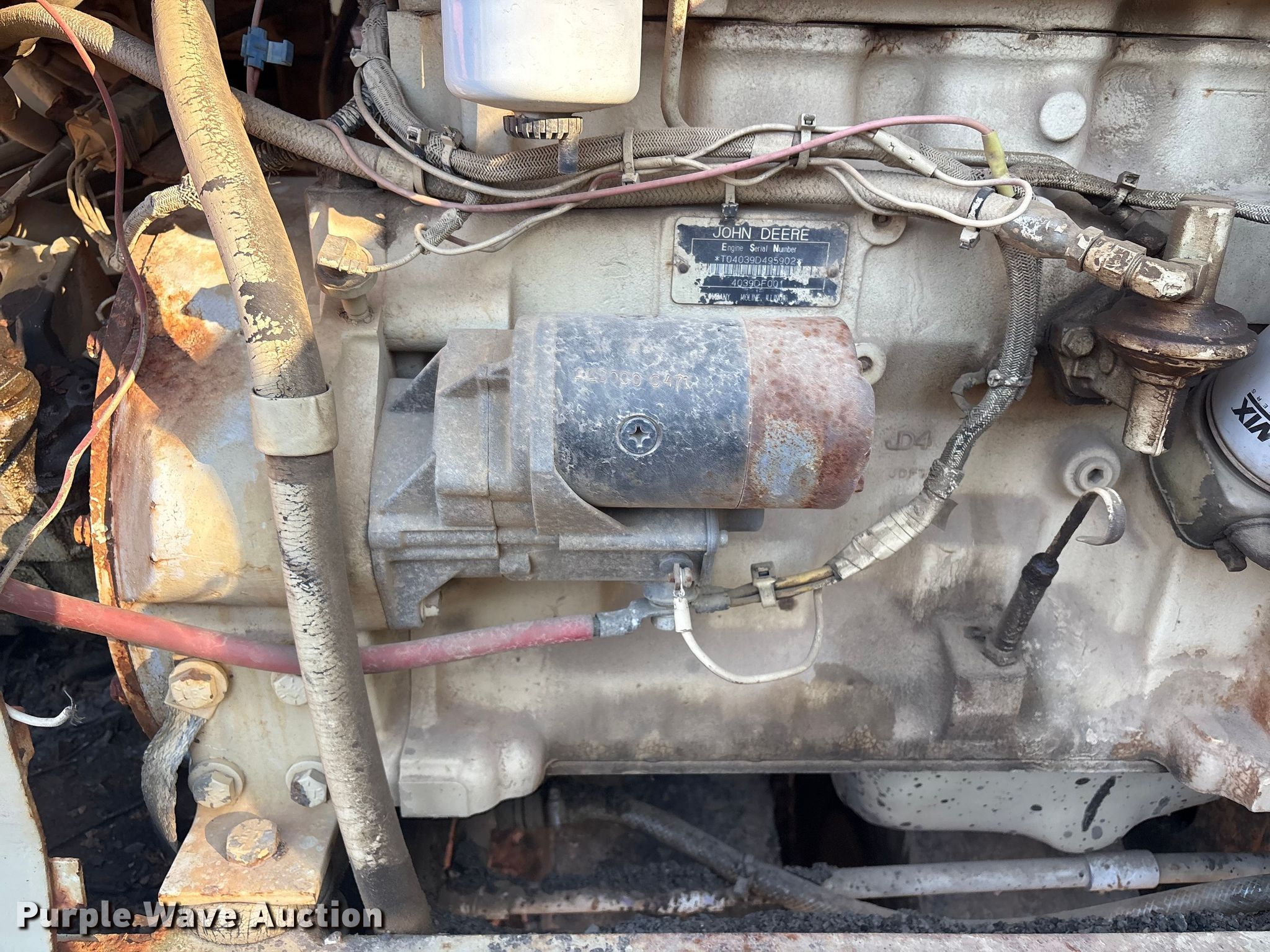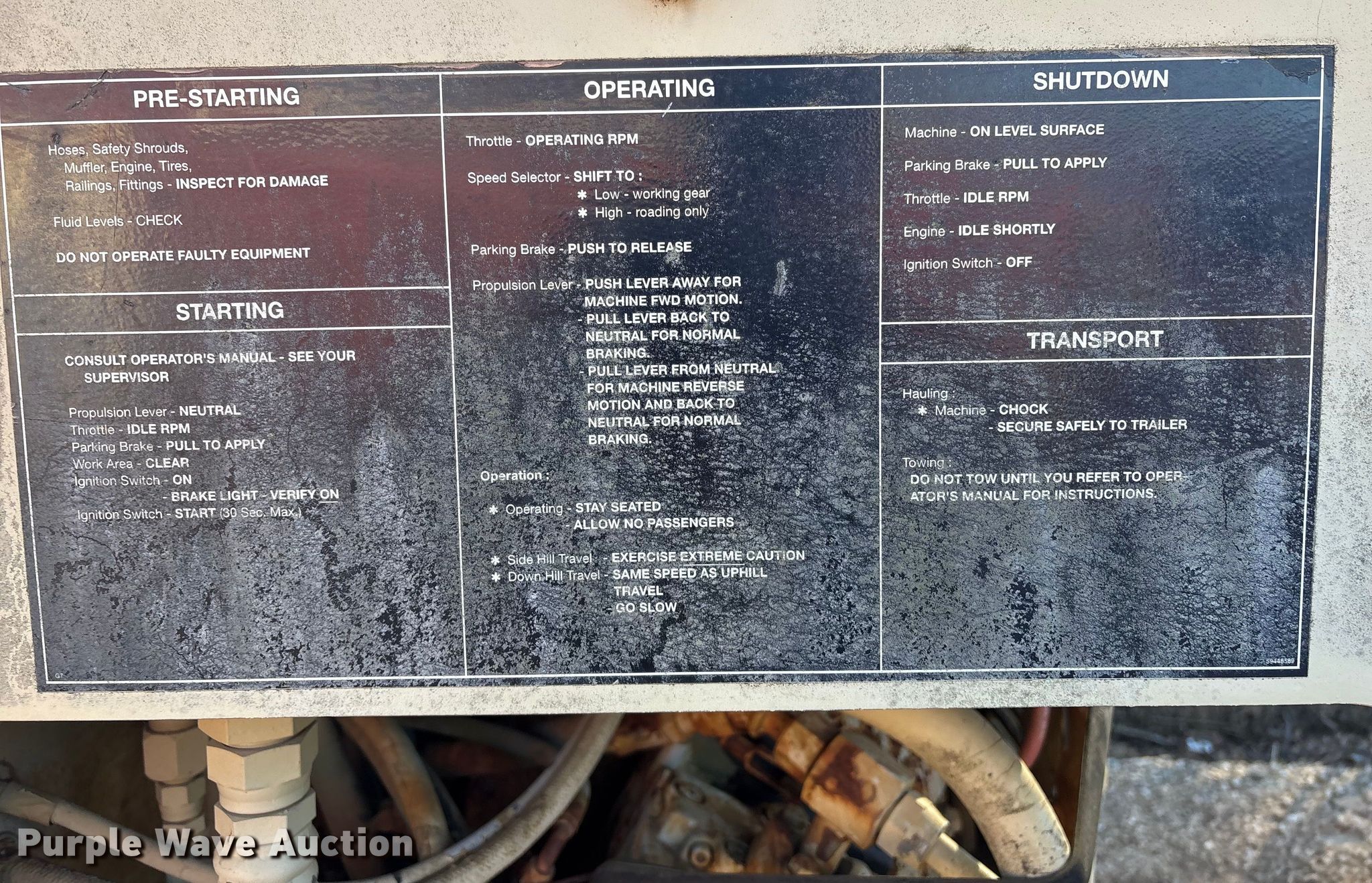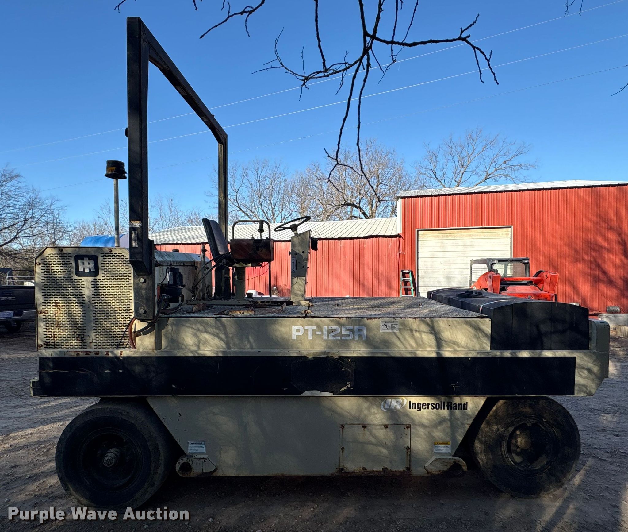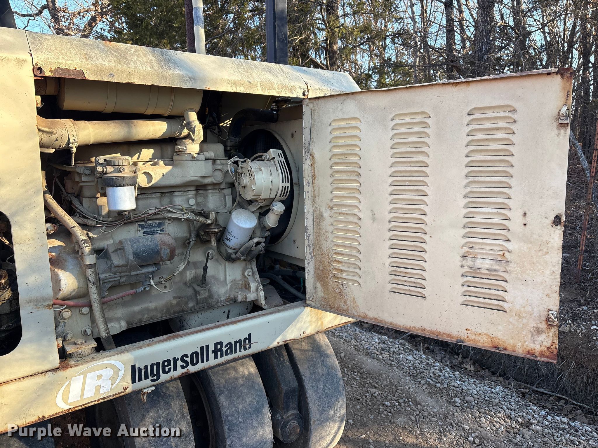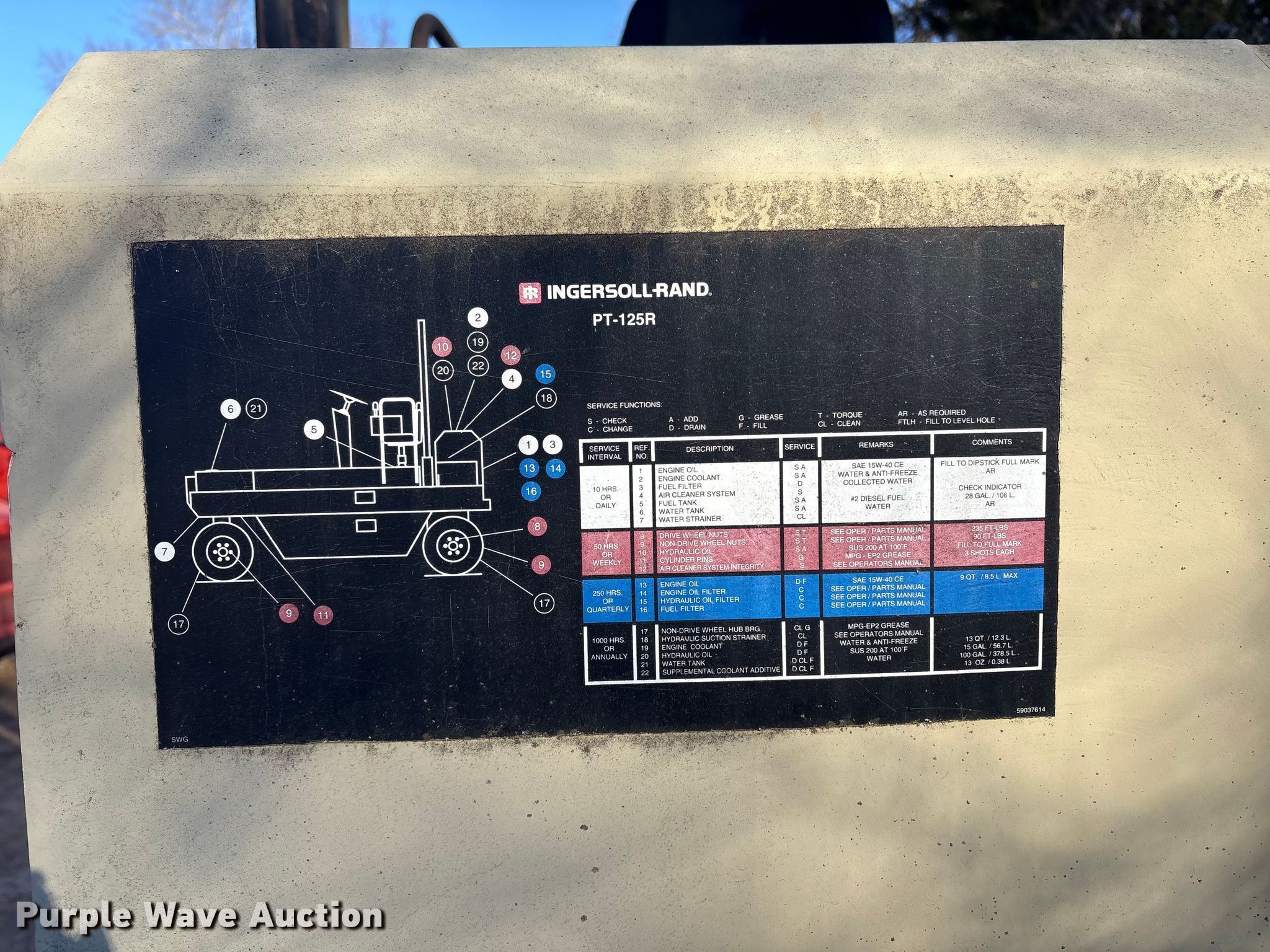 1995 Ingersoll Rand PT-125R pneumatic roller. Hours: 1,135 on meter, Serial: 142337. Engine John Deere, Serial: T04039D495902, Cylinders: 4, Fuel type: Diesel. Transmission Hydrostatic, Two speed travel. Operators station OROPS, Vandal cover. Features Water spray applicator: Front. Tires Size: 7.50-15NHS. Notes Unknown operating condition of water spray applicator. Braggs, OK 74423