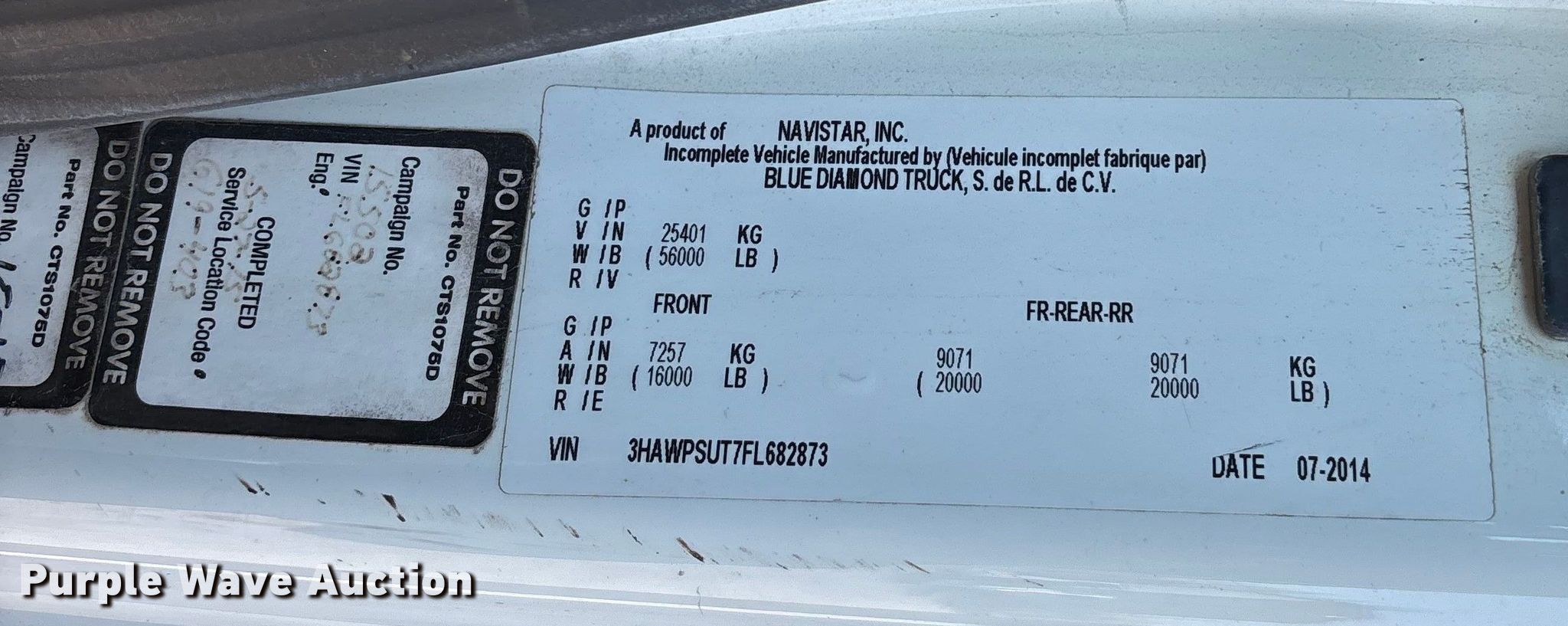 2015 International 7500 dump truck. Miles: 192,354 on odometer, Hours: 9,115 on meter, VIN: 3HAWPSUT7FL682873. Engine Navistar N10, Displacement: 9.3L, Cylinders: 6, Fuel type: Diesel, Engine brake. Transmission Automatic. Chassis Axles: Tandem, Differential lock: Full, Suspension: Spring over walking beam, Brakes: Air, PTO, GVWR: 56,000 lbs FAWR: 16,000 lbs, RAWR: 40,000 lbs, Wheelbase: 214". Interior AC, Heat, Cruise control. Features Bed Dump flatbed, Henderson, Length: 15' 6", Width: 8', Side height: 45", Side board height: 10", Bed type: Steel, Ram: Single, End gate: Air operated. Tires Front: 315/80R22.5, Rear: 11R22.5. Notes Dash warning indicator: Check engine, Windshield chipped or cracked, Air system issues, slow to build air. Missouri title. Title has a lien that will be released following the close of the auction. Title distribution may be delayed up to 30 days from verification of funds. Apperson Utility Construction. Eldon, MO 65026