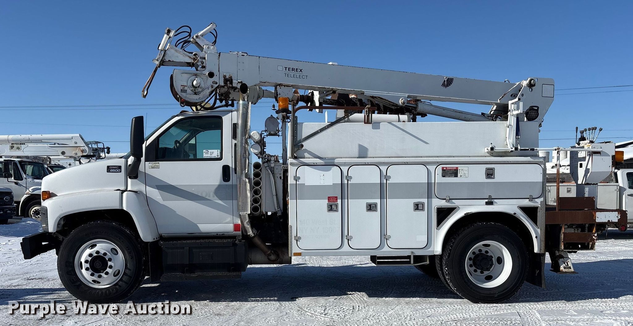 2005 GMC C8500 digger derrick truck. Miles: 99,331 on odometer, VIN: 1GDM8C1C55F901630. Engine Caterpillar, Displacement: 7.2L, Cylinders: 6, Fuel type: Diesel. Transmission Allison, Automatic. Chassis Axles: Single, Suspension: Spring, Brakes: Air, PTO, GVWR: 33,000 lbs. Interior AC, Heat, Heated mirrors, Brake controller. Features Bed Utility bed, BrandFX FX-127-4, Serial: 58851, Length: 10' 7", Width: 94", Boom 2005 Terex L-4045, Serial: 2050828180, Boom length: 23', Maximum lift capacity: 14,640 lbs, Boom type: Telescopic, Boom controls, Pole guide, Auger Diameter: 19".. Tires Size: 11R22.5. Notes Jump start required during on-site data collection. New York title. Seller is an Indiana licensed motor vehicle dealer. The buyer may be required to pay sales tax and/or registration fees to the dealer prior to taking possession. Buyers may be required to provide identification to the licensed dealer to comply with state laws. Title will be assigned and distributed by the dealer. Please contact the seller for distribution questions. ABC Truck & Equipment LLC. Craigville, IN 46731