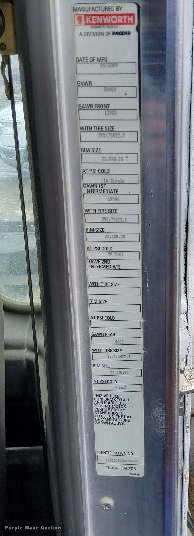 Purple Wave is selling a used Truck Tractor in Kansas. This item is a 2010 Kenworth T800 semi truck with the following: Miles: 638,107 on odometer, Hours: 11,165 on meter, Miles or hours may vary, unit still in use, VIN: 1XKDD09X2AJ265329