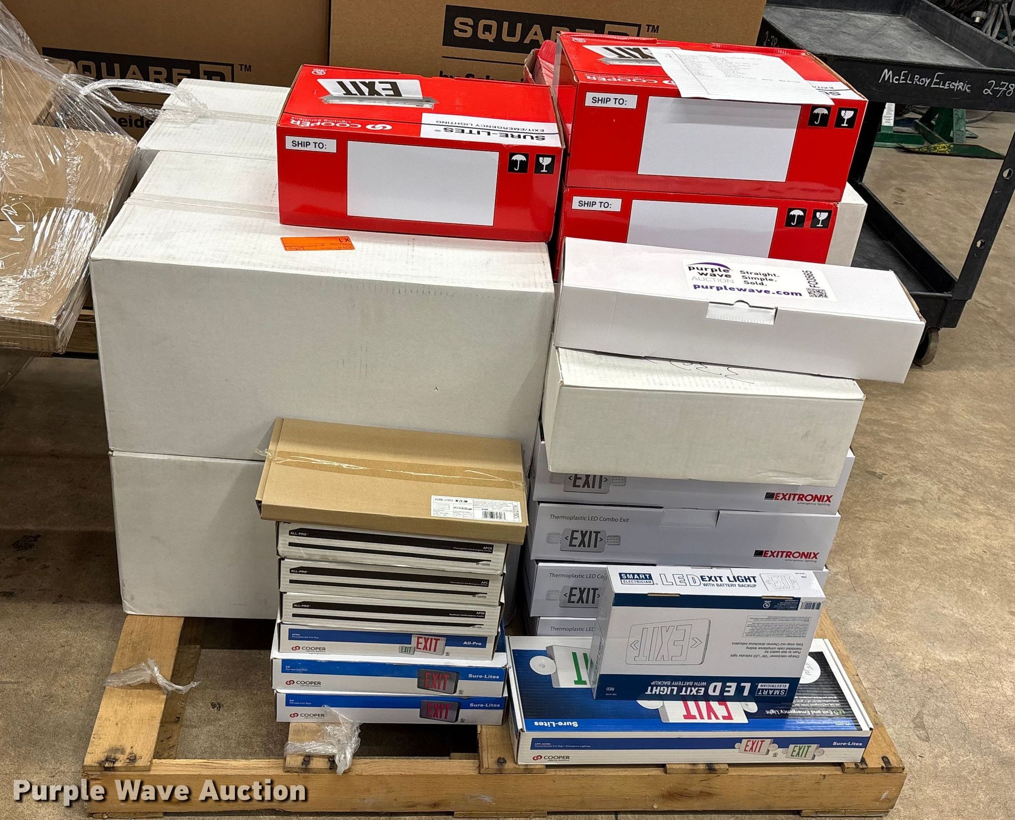 Approximately 47 exit and emergency signs. Pallet #3. McElroy's Electric Inc.. Topeka, KS 66611
