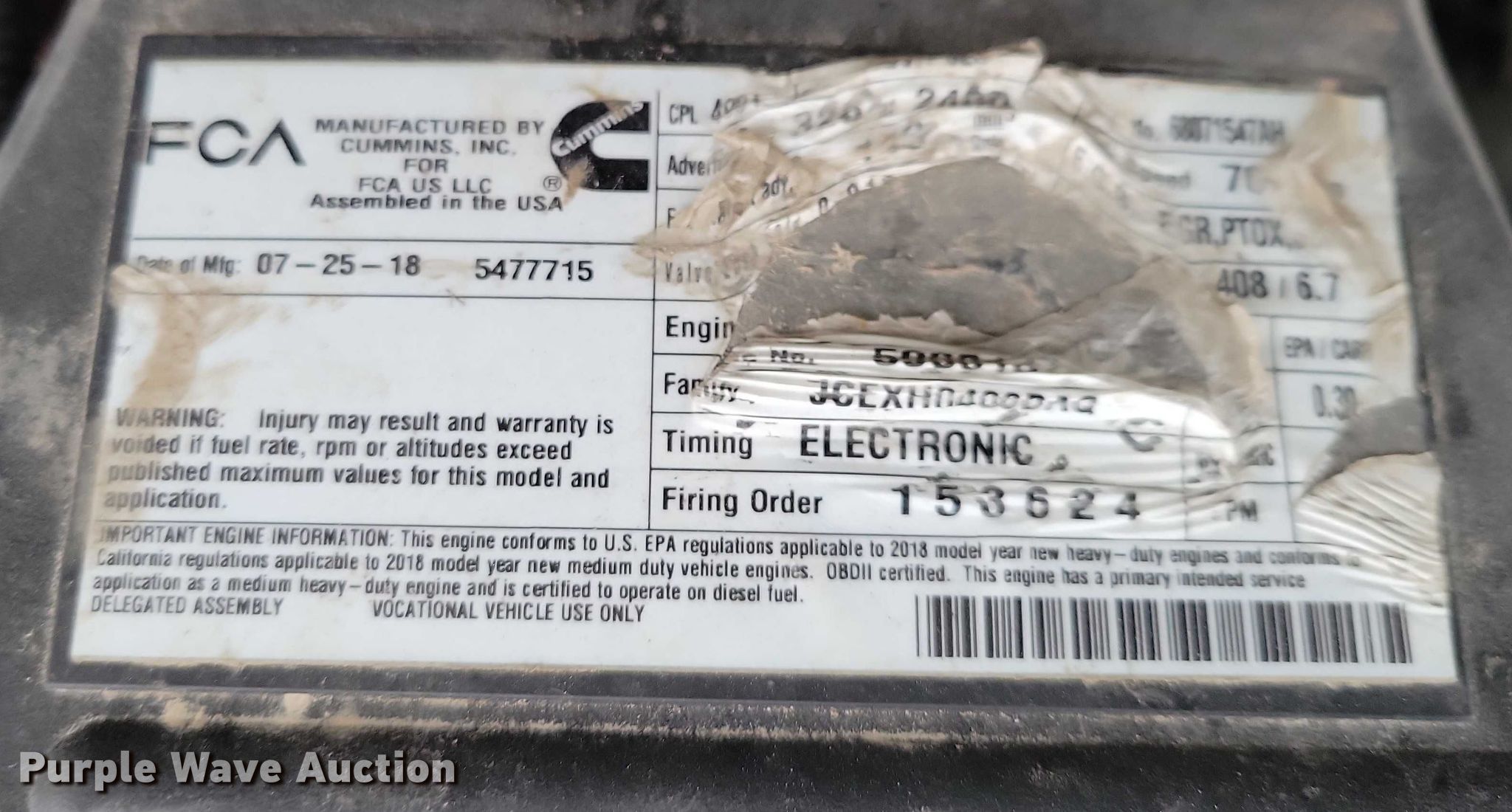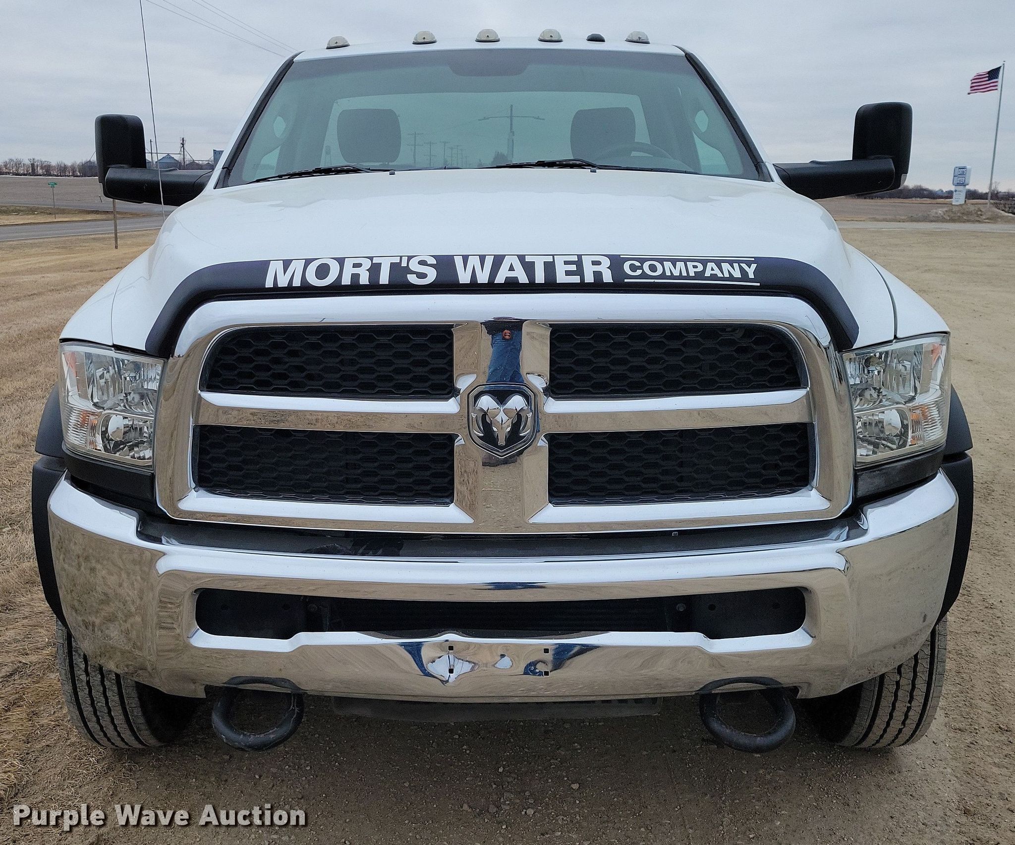 2018 Ram 5500 utility / service truck. Miles: 68,391 on odometer, VIN: 3C7WRNBL8JG284952. Engine Cummins, Displacement: 6.7L, Cylinders: 6, Fuel type: Diesel. Transmission Automatic. Chassis Four wheel drive, Axles: Single, Suspension: Spring, Brakes: Hydraulic, GVWR: 19,500 lbs. Interior AC, Heat, Heated mirrors, Power windows, Power locks, Cruise control, Auxiliary controls, Brake controller. Features Bed Utility bed, Knapheide 6132D54J, Serial: 0288710, Length: 11', Width: 95". Tires Size: 225/70R19.5. Notes DPF deleted, DEF deleted, EGR deleted. Iowa title. Title distribution may be delayed up to 14 days from verification of funds. Mort's Water Co. Latimer, IA 50452