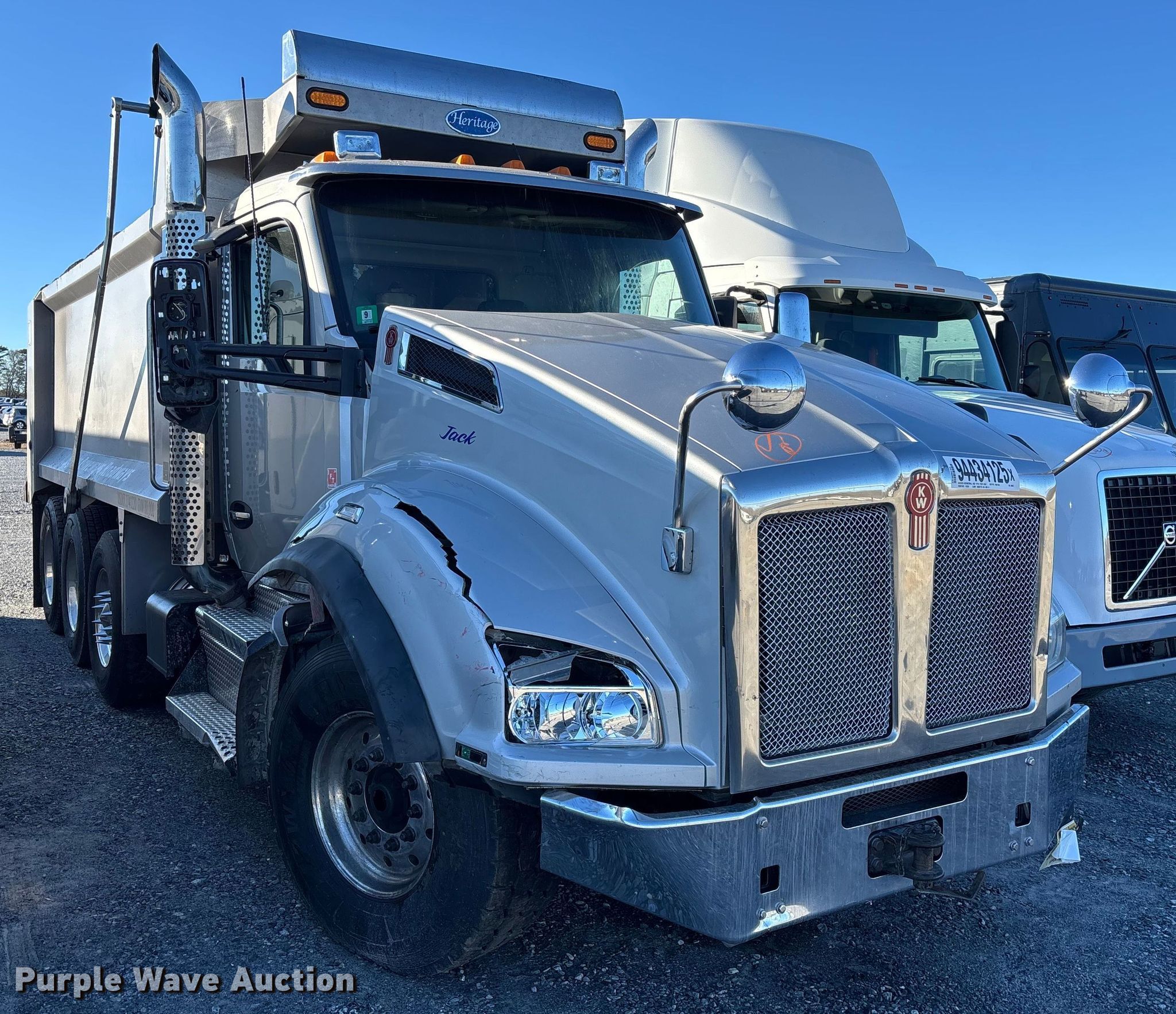 2020 Kenworth T880 dump truck. Miles: 189,779 on odometer, Hours: 9,257 on meter, VIN: 1NKZX4TX8LJ348659, Unit #: 94434125. Engine Cummins X15 565, Displacement: 15.0L, Cylinders: 6, Fuel type: Diesel, HP: 565, Engine brake. Transmission Allison 4500 RDS, Automatic. Chassis Double frame, Axles: Triple, Pusher axle Steerable, Gear ratio: 4.30, Differential lock: Full, Suspension: Air Dump valves, Brakes: Air, PTO, GVWR: 83,240 lbs FAWR: 18,740 lbs, IAWR: 23,000 lbs, RAWR: 23,000 lbs, Lift axle GAWR: 18,500 lbs. Interior AC, Heat, Heated mirrors, Power windows, Cruise control. Features Bed Dump bed, Heritage HS – HD, Length: 17' 6", Width: 100", Side height: 60", Bed type: Steel, Bed vibrator, Roll tarp, Ram: Single, End gate: Air operated. Tires Front: 425/65R 22.5, Rear: 11R24.5, Lift axle: 385/65R 22.5. Notes Dash warning indicator: Primary Air Pressure Low, Dead battery, Collision damage, Power steering line disconnected, reservoir empty, Fluid leak near PTO and transmission, Unknown operating condition. Insurance salvage, stored at a secured facility. Please review REQUIRED REMOVAL INSTRUCTIONS. Titles will be distributed after confirmation of payment and removal. North Carolina rebuilt salvage title. Title distribution may be delayed up to 30 days from verification of funds. Insurance Salvage. Gastonia, NC 28052