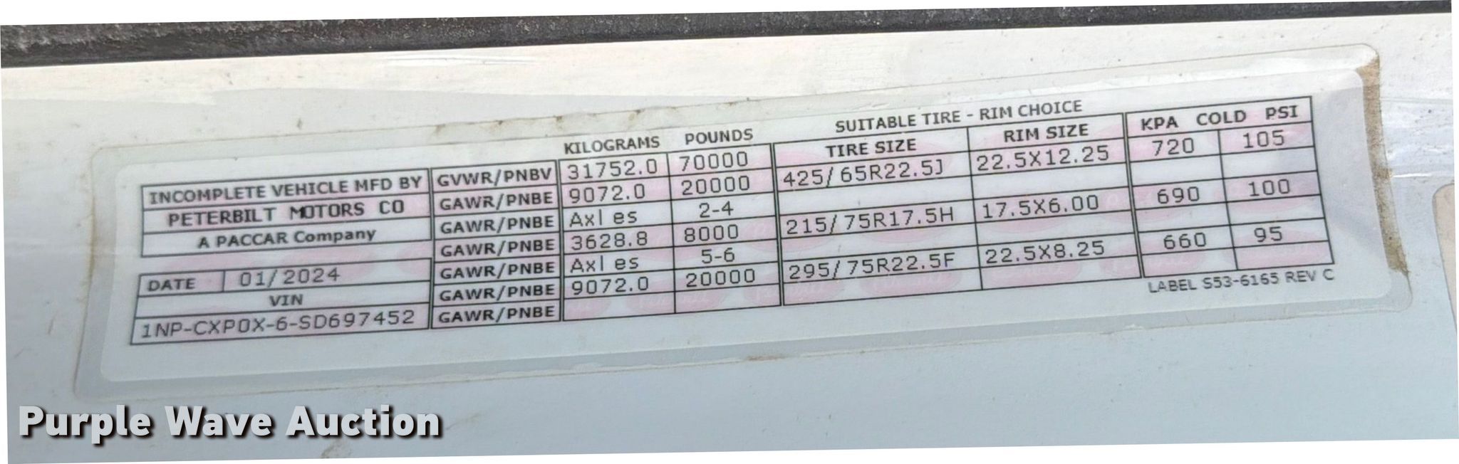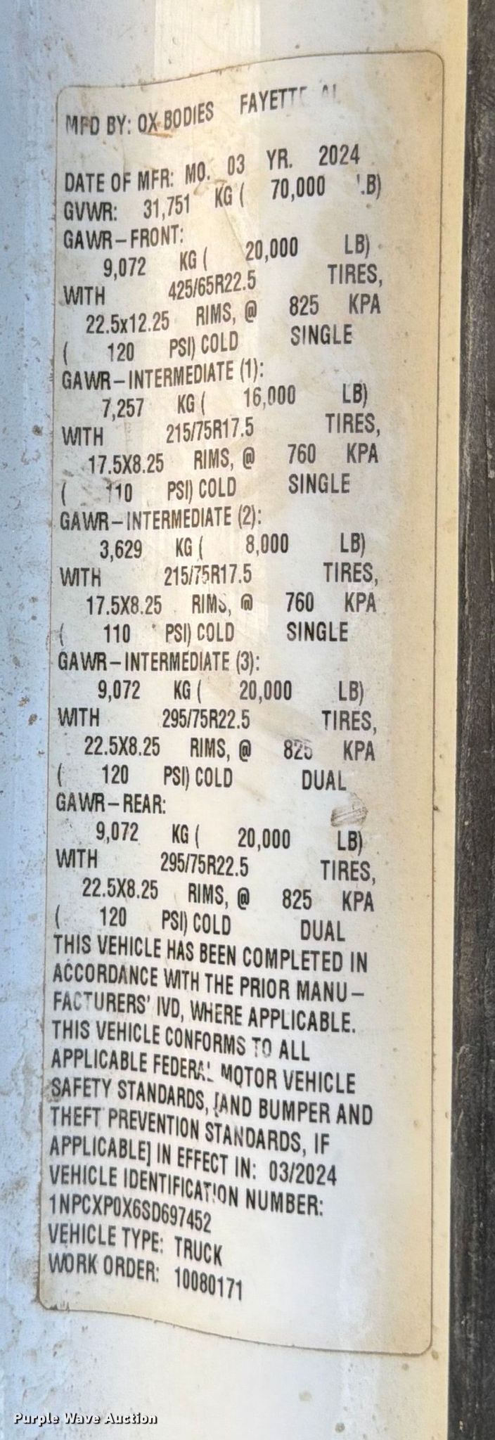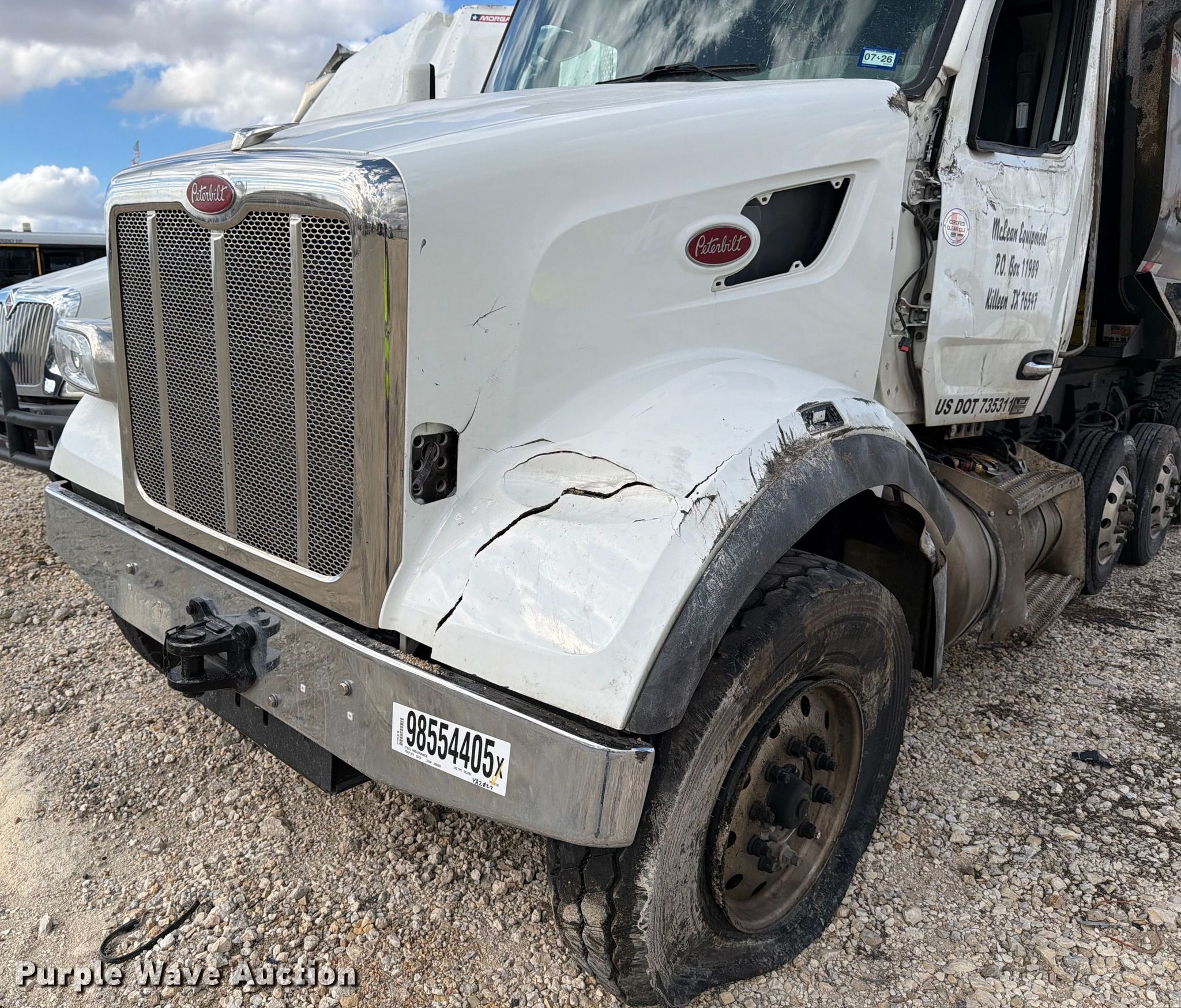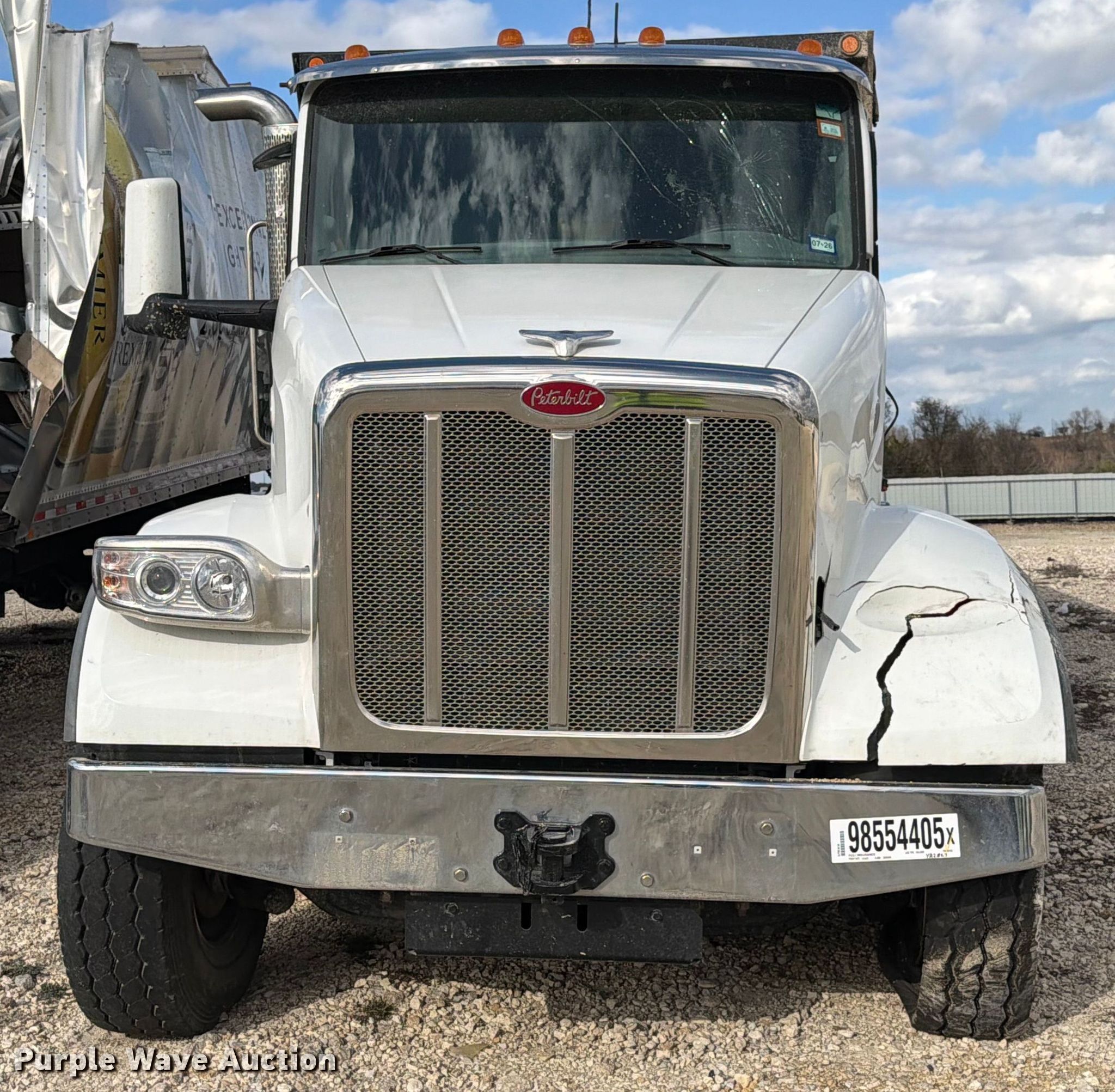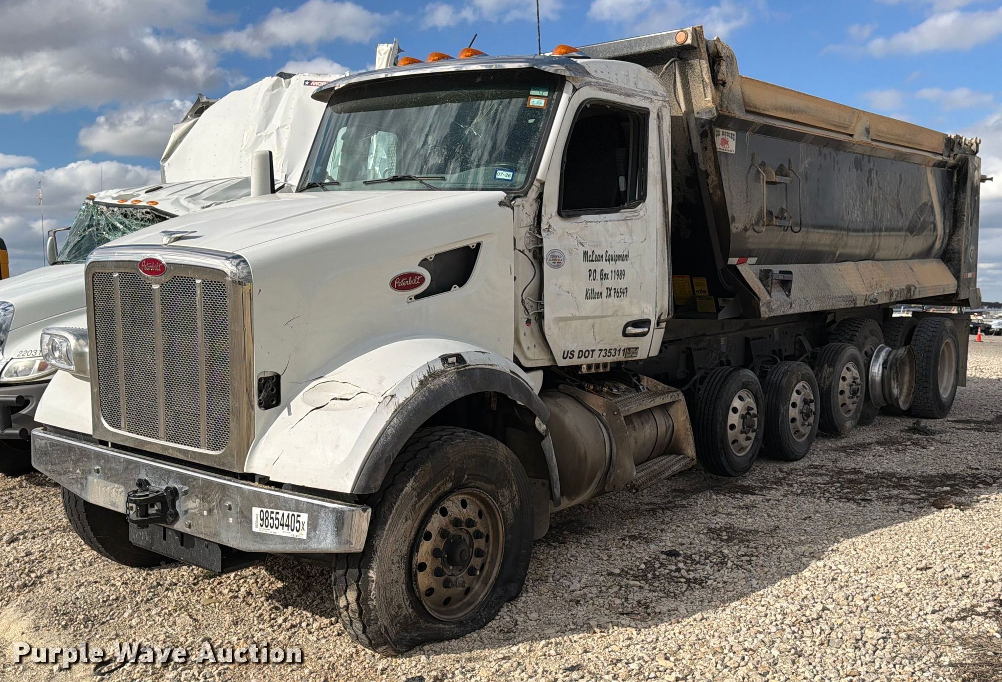 2025 Peterbilt 567 dump truck. Miles: 51,697 on odometer, Hours: 2,829 on meter, VIN: 1NPCXP0X6SD697452, Unit #: 98554405. Engine Paccar MX-13, Displacement: 12.9L, Cylinders: 6, Fuel type: Diesel, HP: 510, Engine brake. Transmission Allison, Automatic. Chassis Axles: 5, Pusher axle Steerable, Differential lock: Inter-axle, Suspension: Air Dump valves, Brakes: Air, PTO, GVWR: 70,000 lbs FAWR: 20,000 lbs, IAWR: 20,000 lbs, RAWR: 20,000 lbs, Lift axle GAWR: 8,000 lbs, Wheelbase: 270". Interior AC, Heat, Heated mirrors, Power windows, Cruise control. Features Bed Dump bed, Ox Bodies, Serial: S242803310080171AL, Length: 20', Width: 98", Side height: 52", Side board height: 10", Bed type: Steel, Roll tarp, Ram: Single, End gate: Air operated. Tires Front: 315/80R22.5, Rear: 11R22.5, Lift axle: 215/75R17. Notes Windshield chipped or cracked, Dead battery, Rollover damage, Glass broken, Flat tire, Tire missing, Non-operational unit Unit must be towed or hauled. Buyer responsible for all aspects of loadout and removal. Insurance salvage, stored at a secured facility. Please review REQUIRED REMOVAL INSTRUCTIONS. Titles will be distributed after confirmation of payment and removal. Texas salvage title. Title distribution may be delayed up to 30 days from verification of funds. Insurance Salvage. 7201 North General Bruce Drive. Temple, TX 76501