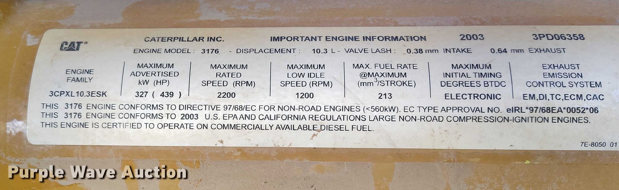 2004 Caterpillar 966G Series II wheel loader. Hours: 26,064 on meter, Serial: CAT0966GPAXJ01611, Unit #: 72660495. Engine Caterpillar 3176, Displacement: 10.3L, Cylinders: 6, Fuel type: Diesel, HP: 439. Transmission Powershift, 4F - 4R. Operators station Enclosed cab, AC, Heat, Bucket controls: Two-lever. Features Counter weights, Self-leveling loader, Bucket Caterpillar, Capacity: 5.25 cu.yd., Width: 118", Cutting edge: Bolt-on, Teeth: 8. Tires Size: 26.5R25. Notes Warning indicator: Electrical fault, Glass cracked, Collision damage, Glass missing, Hood removed but included, Radiator damaged, Unknown operating condition of AC, Non-operational engine fan, damaged, Possible transmission issues Fourth gear engagement issues. Buyer responsible for all aspects of loadout and removal. Insurance salvage, stored at a secured facility. Please review REQUIRED REMOVAL INSTRUCTIONS. Insurance Salvage. 640 Winters Drive. Colorado Springs, CO 80907