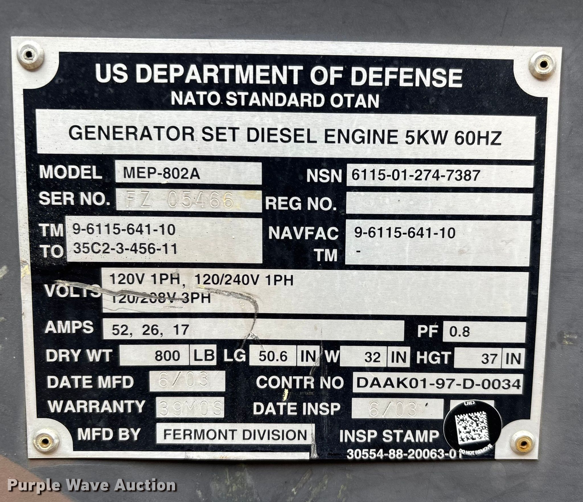 2003 MEP-802A generator. Hours: 887 on meter, Serial: FZ05466. Engine Cylinders: 4, Fuel type: Diesel. Features Generator kW: 5, Phase: Three, Electric start, Fuel tank, Skid mounted. Notes Batteries missing. Gleason Police Department. Gleason, TN 38229